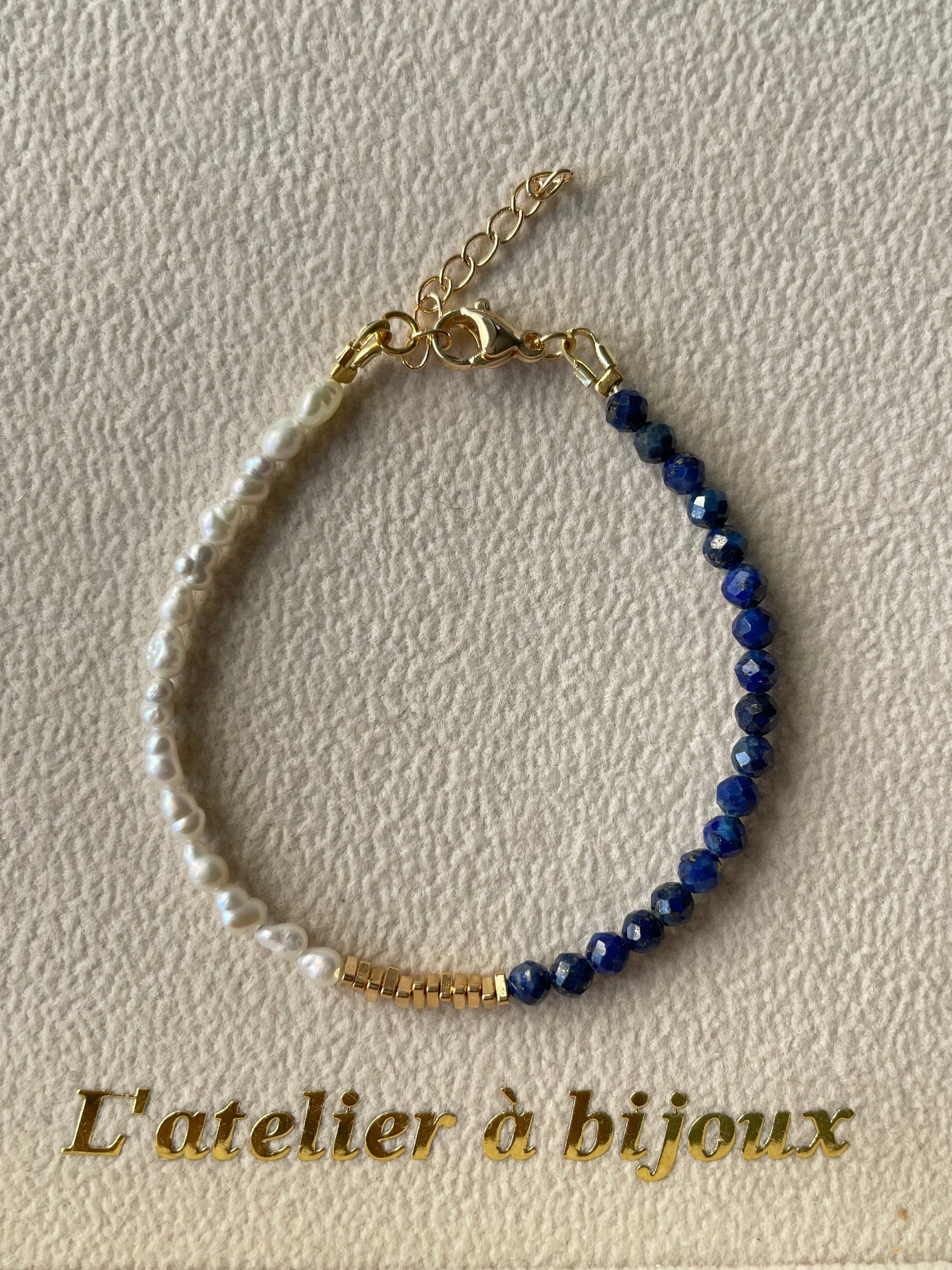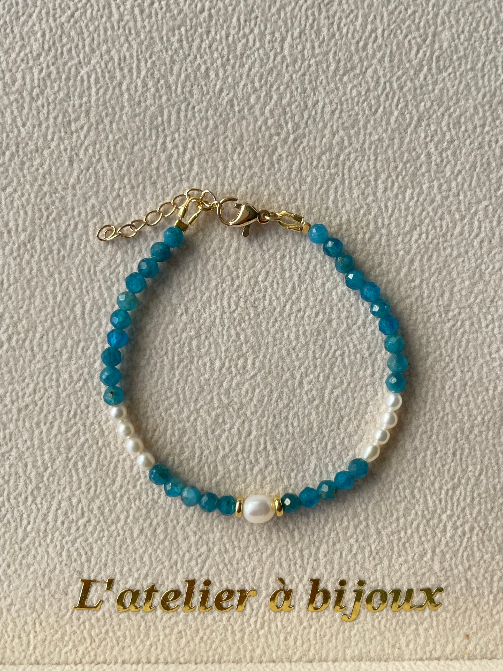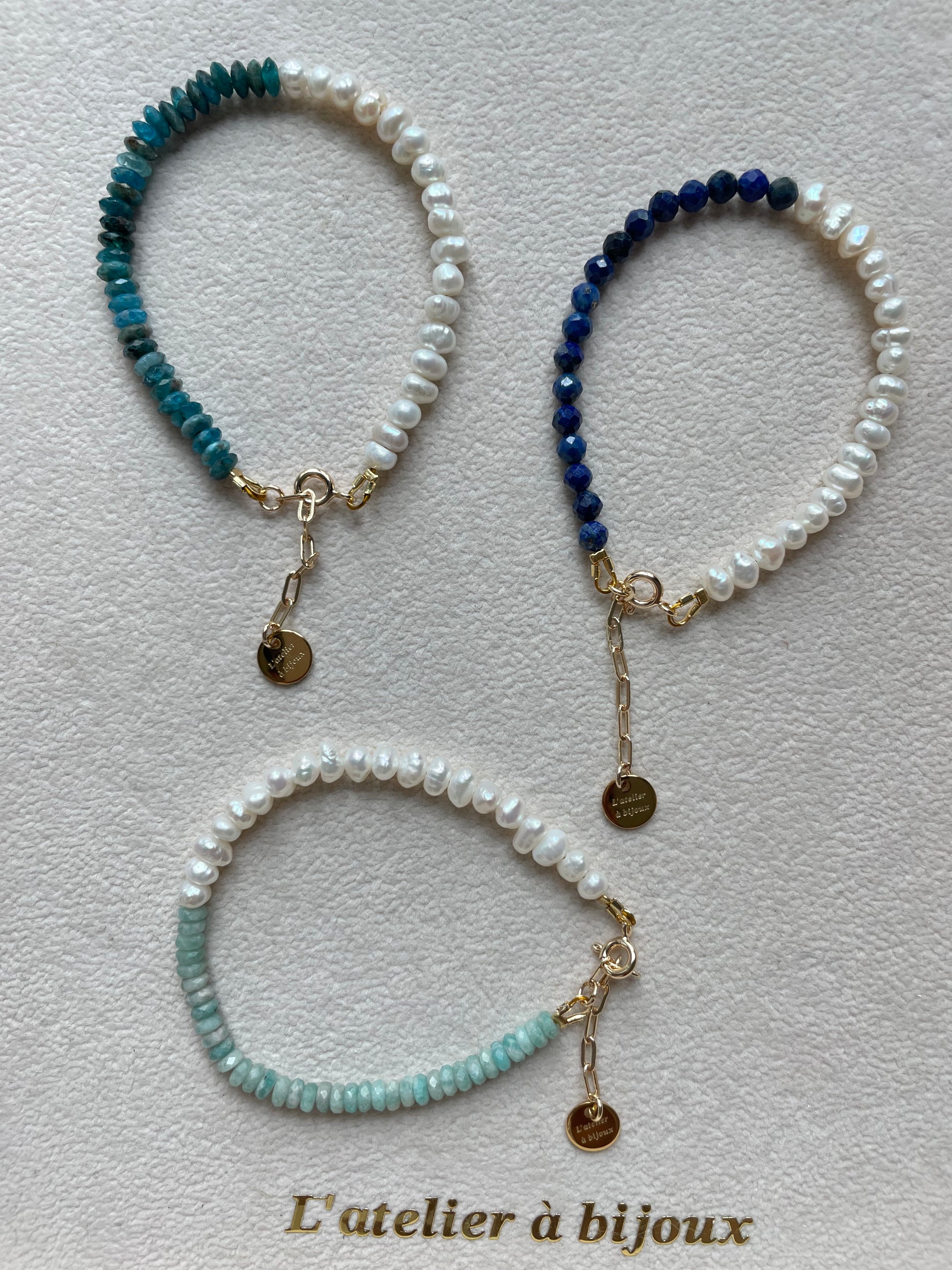 Những chiếc vòng tay nổi bật với thiết kế tinh tế và thanh lịch, kết hợp hài hòa giữa ngọc trai trắng tự nhiên óng ánh và hạt đá cắt facet với ba tông màu: xanh lam đậm, xanh ngọc và xanh cổ điển. Mỗi chiếc vòng đều được hoàn thiện với charm logo thương hiệu nhỏ gọn, tạo điểm nhấn sang trọng và khẳng định dấu ấn riêng biệt.