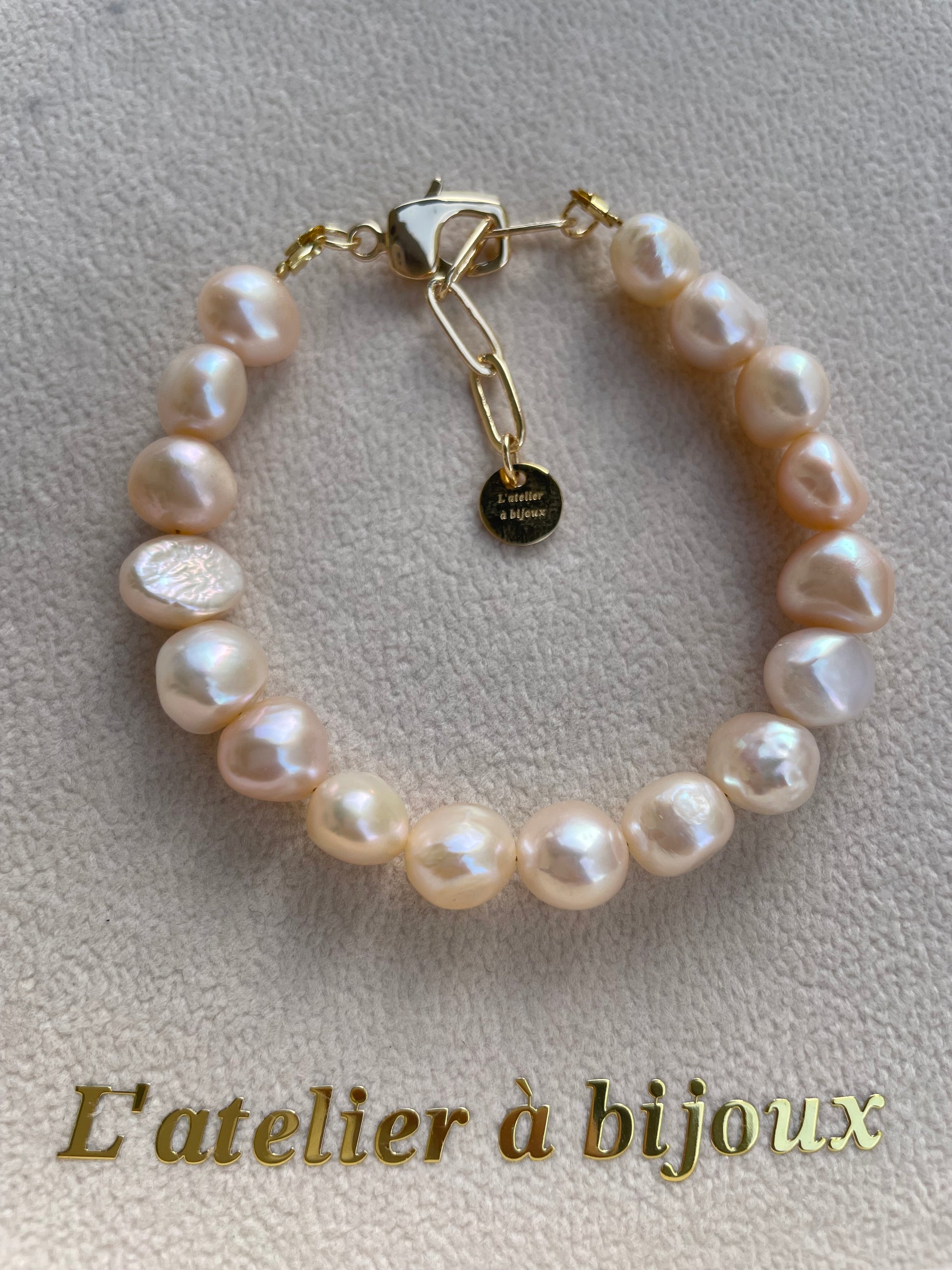 Chiếc vòng tay được làm từ những viên ngọc trai tự nhiên dáng to tròn, đều nhau với sắc hồng ngọc trai nhẹ nhàng, tạo nên vẻ đẹp tinh tế và nữ tính. Mặt dây khóa mạ vàng cùng dây xích mảnh giúp tăng thêm sự sang trọng và dễ dàng điều chỉnh kích thước phù hợp với cổ tay.