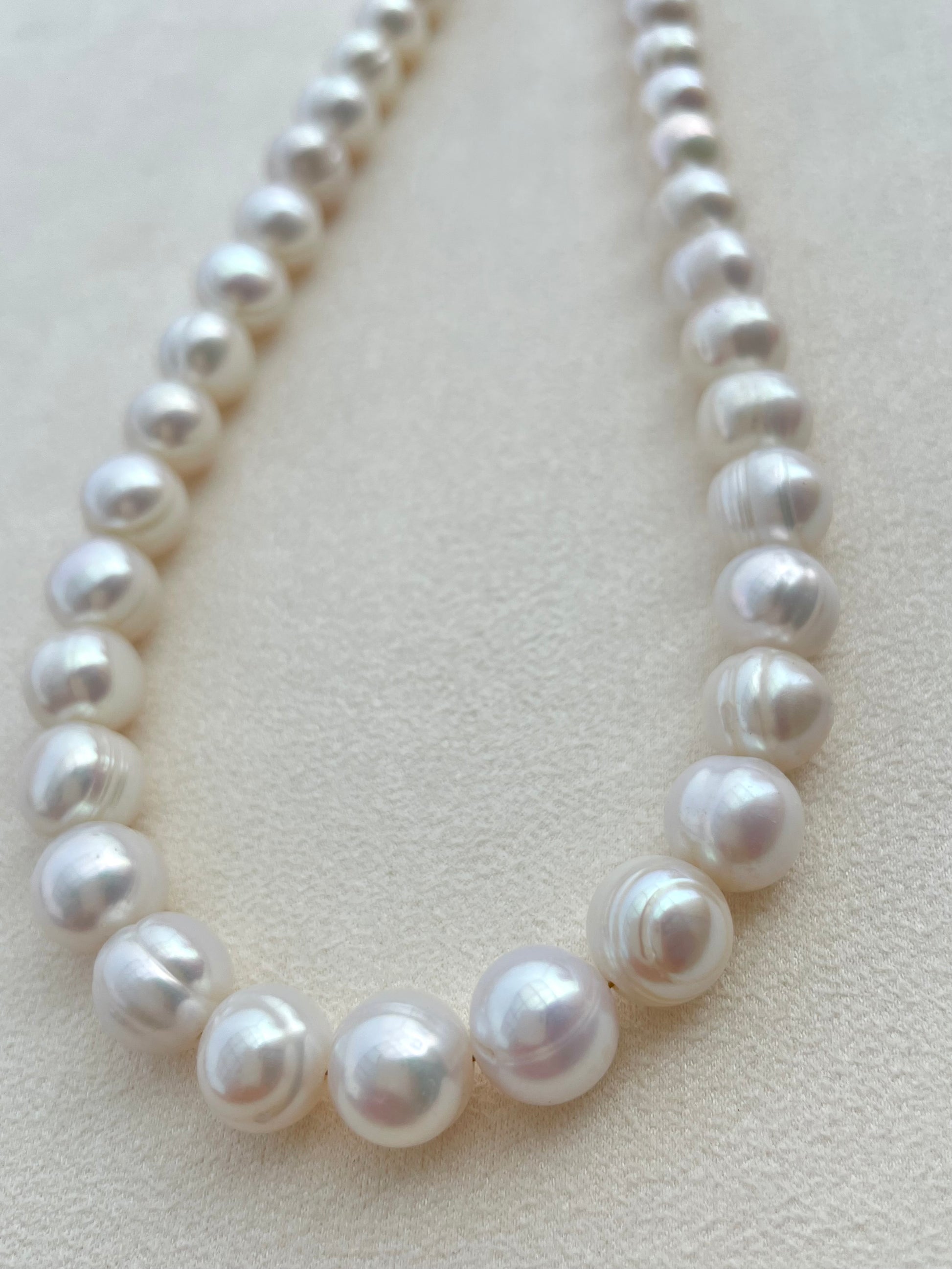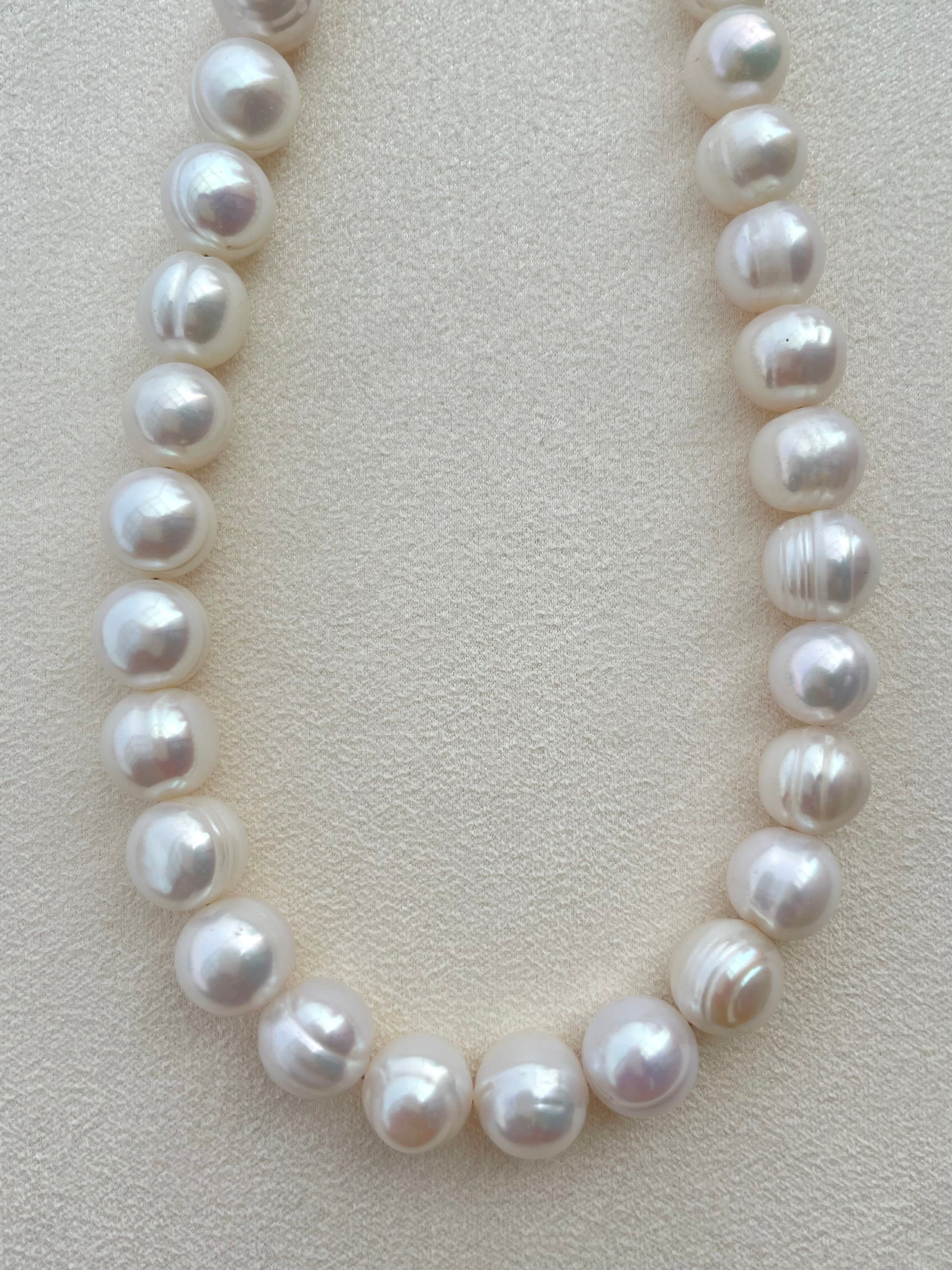 Chiếc vòng cổ ngọc trai tròn cao cấp mang thiết kế kinh điển nhưng tinh xảo, được chế tác từ những viên ngọc trai nước ngọt cao cấp dáng tròn bầu hoàn hảo, bề mặt mịn mượt và ánh xà cừ óng ánh tự nhiên. Từng viên ngọc được tuyển chọn thủ công để đảm bảo sự đồng đều về kích thước, màu sắc và độ bóng, tạo nên một tổng thể hài hòa, sang trọng và đầy đẳng cấp.