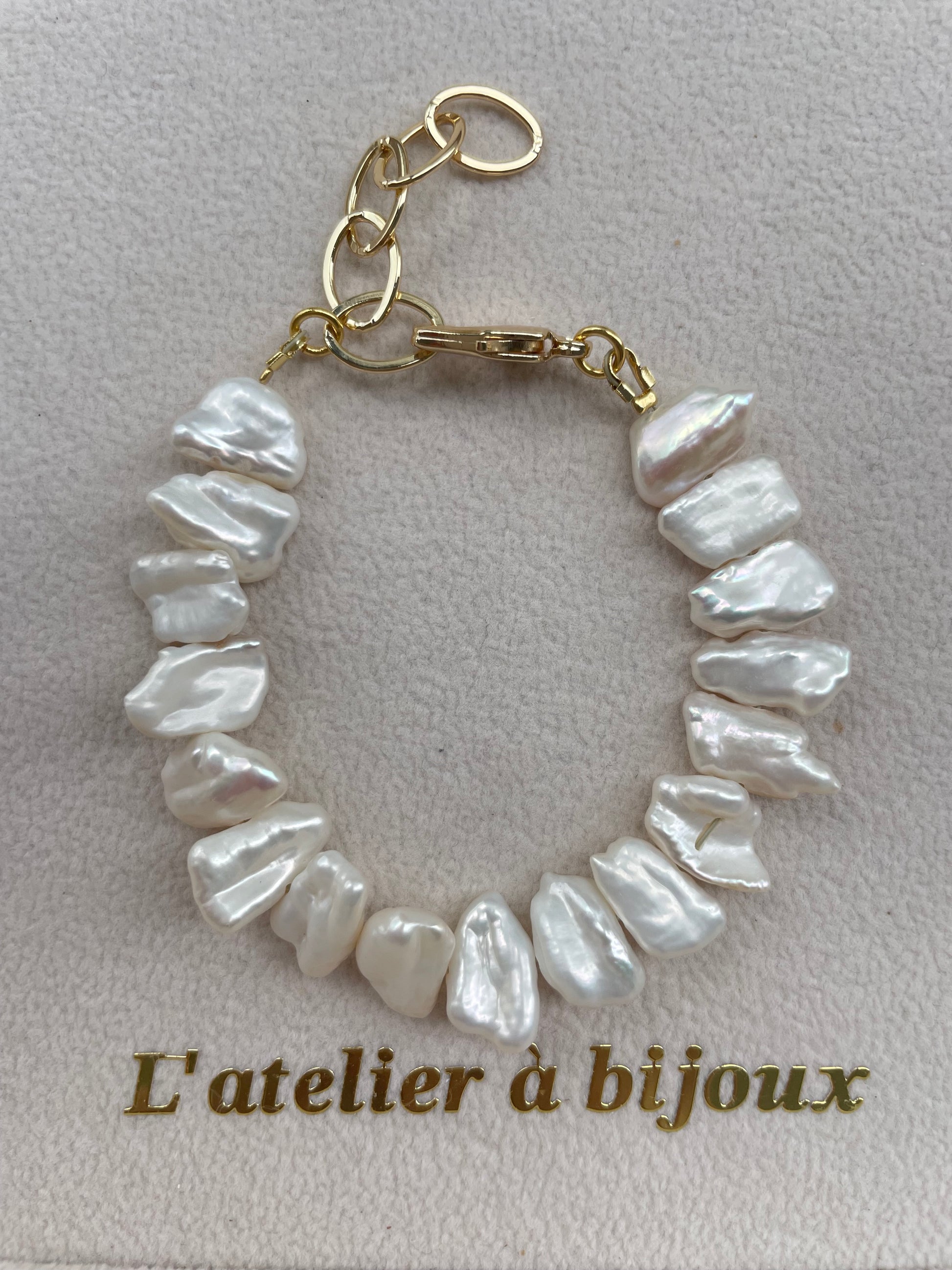 Chiếc vòng tay nổi bật với thiết kế tinh tế, sử dụng những viên ngọc trai baroque tự nhiên dáng que độc đáo, bề mặt ánh xà cừ óng ánh bắt sáng, xen kẽ cùng chi tiết kim loại mạ vàng sang trọng. Điểm nhấn đặc biệt nằm ở charm logo thương hiệu được gắn tinh xảo, mang đến nét hiện đại và khẳng định dấu ấn riêng biệt.