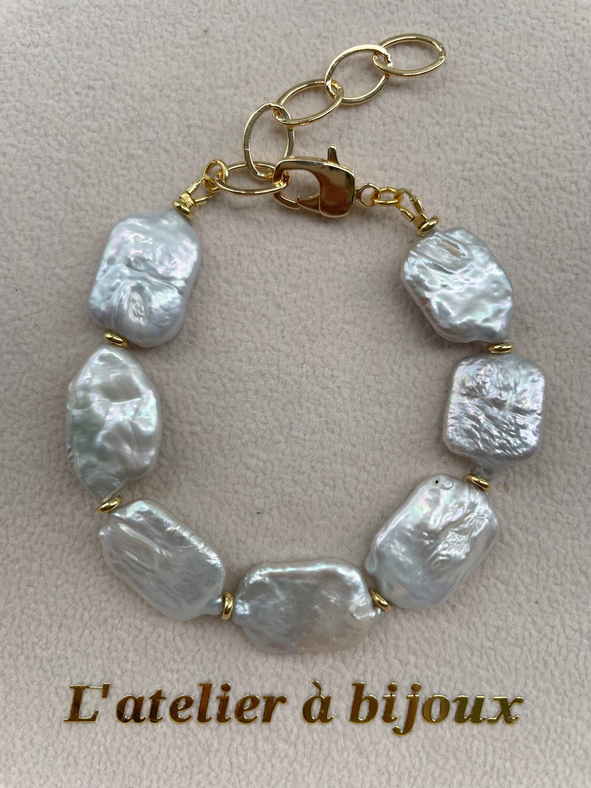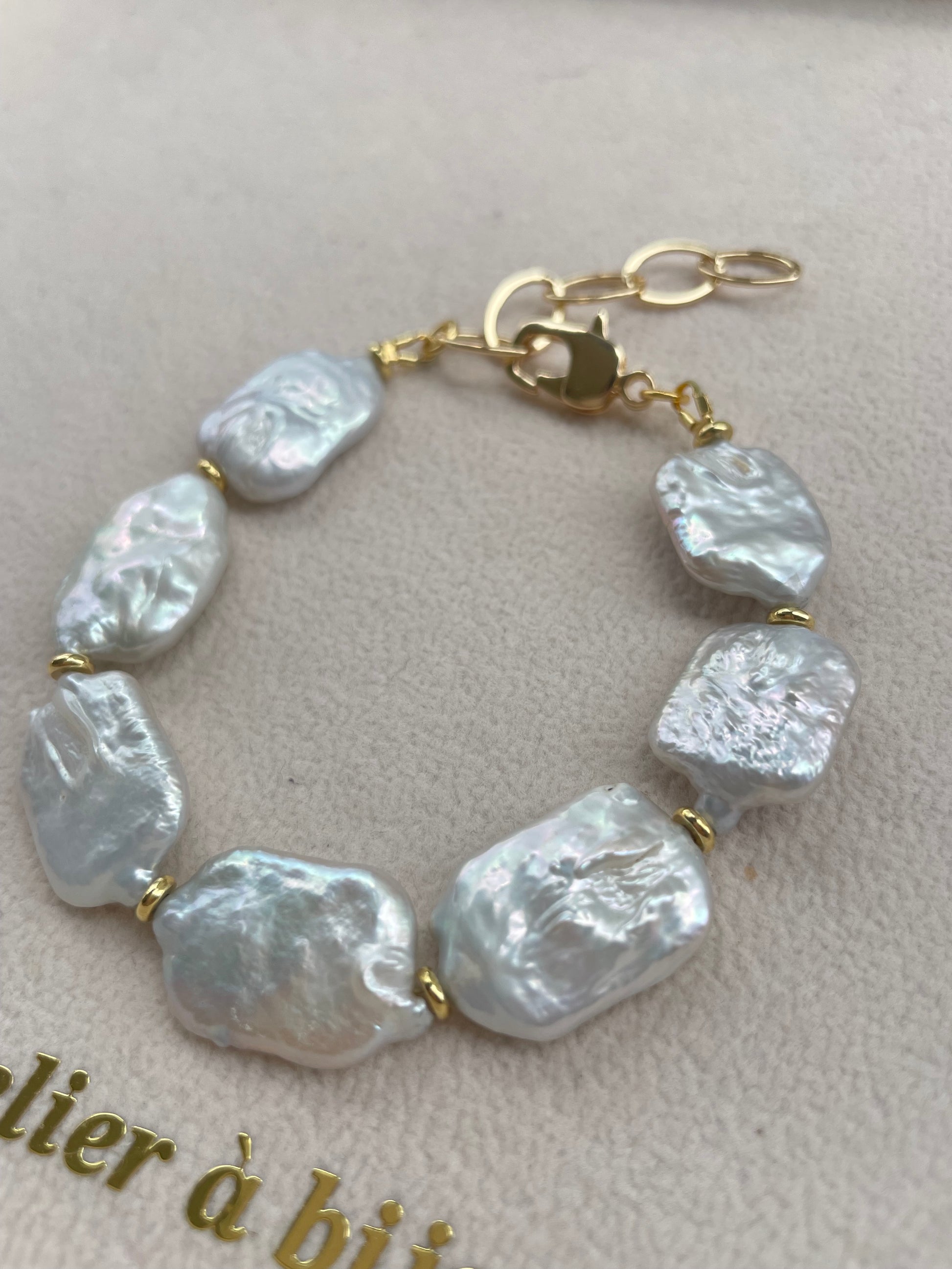 Chiếc vòng tay nổi bật với thiết kế độc đáo, sử dụng những viên ngọc trai baroque tự nhiên bản lớn, bề mặt óng ánh bắt sáng xen kẽ cùng các hạt kim loại mạ vàng tinh xảo. Điểm nhấn đặc biệt nằm ở charm logo thương hiệu được gắn tinh tế, mang đến sự sang trọng và khẳng định dấu ấn riêng cho thiết kế.