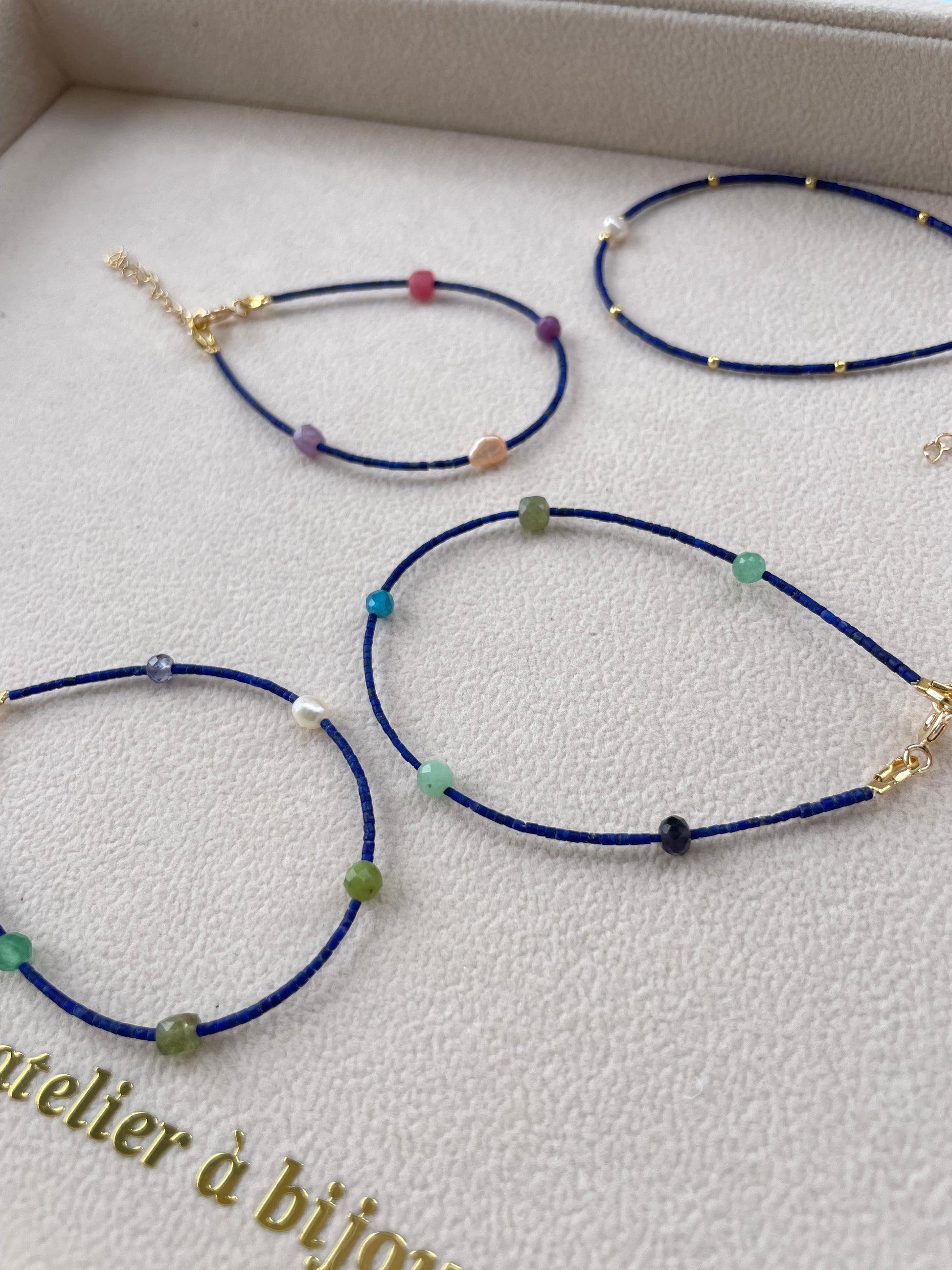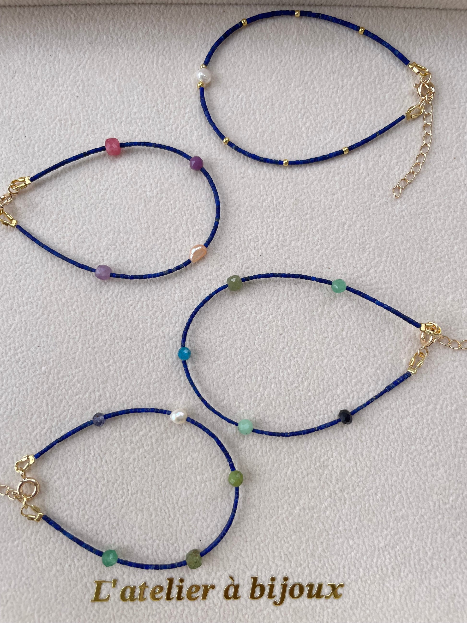 Những chiếc vòng tay nổi bật với thiết kế tối giản nhưng tinh tế, sử dụng dây xanh đậm thanh mảnh, điểm xuyết hạt đá quý nhiều màu và hạt kim loại mạ vàng nhỏ nhắn, mang đến vẻ trẻ trung hiện đại. Mỗi chiếc vòng đều được gắn charm logo thương hiệu tinh xảo, tạo điểm nhấn sang trọng và khẳng định dấu ấn riêng biệt.