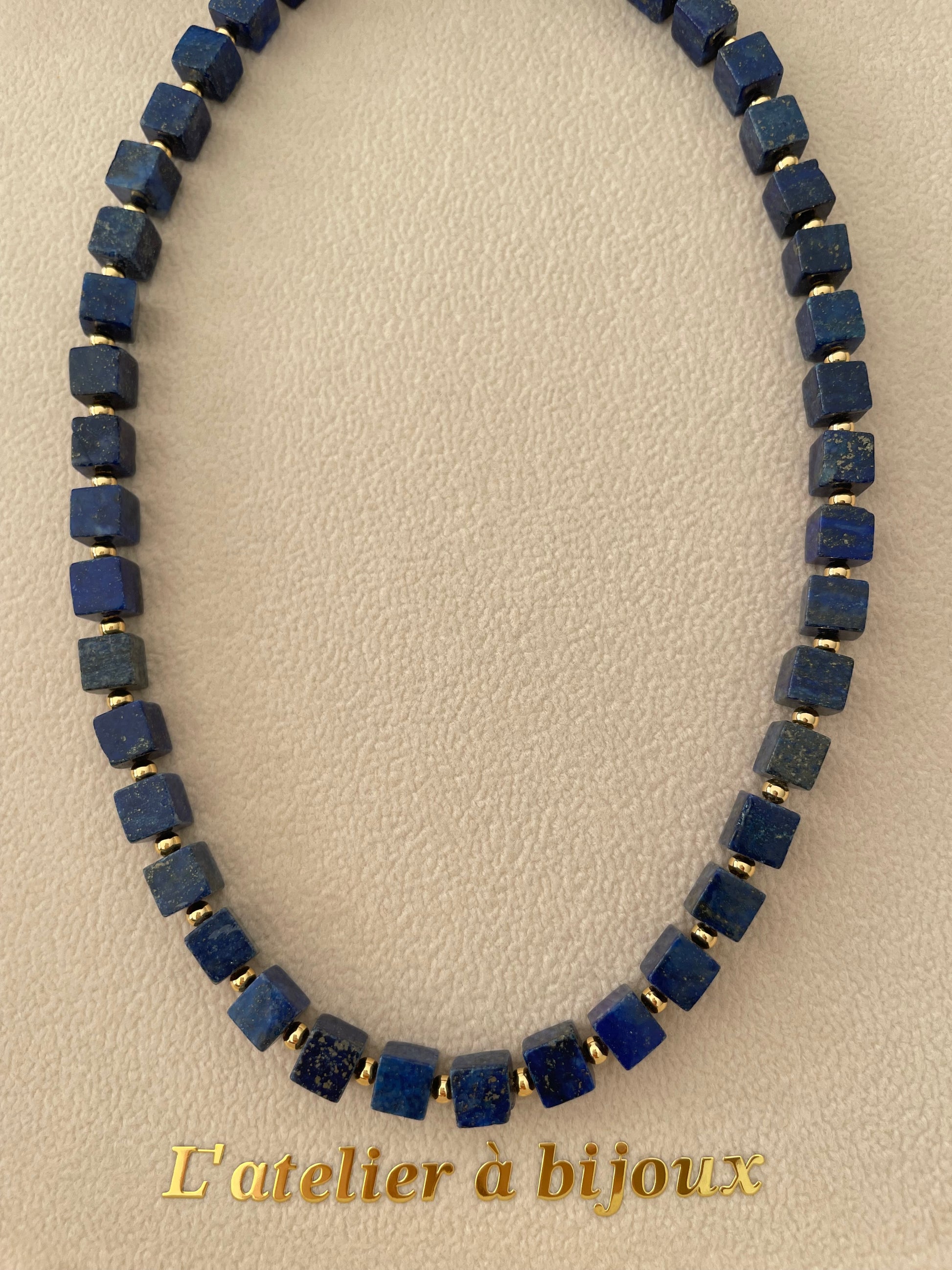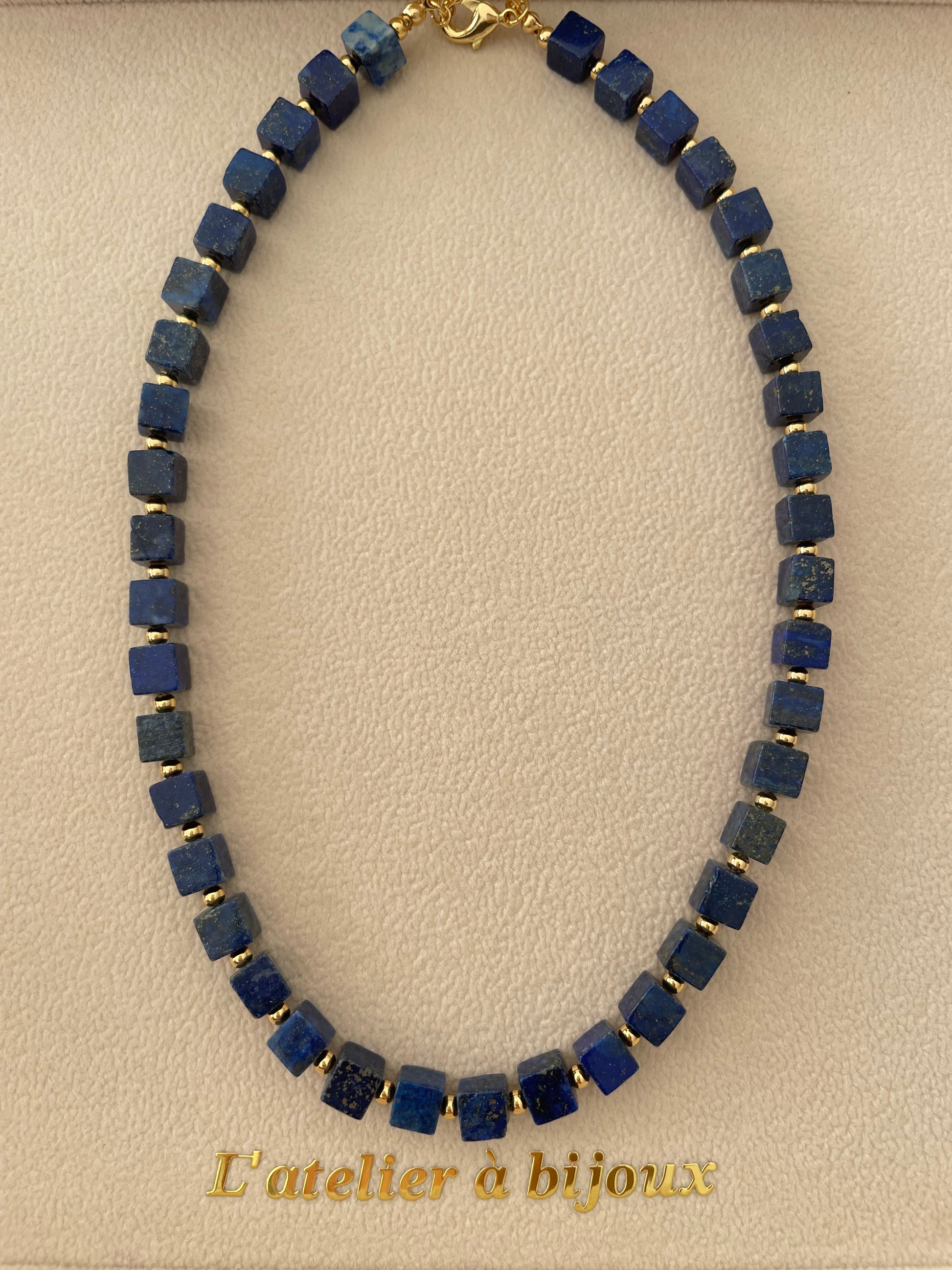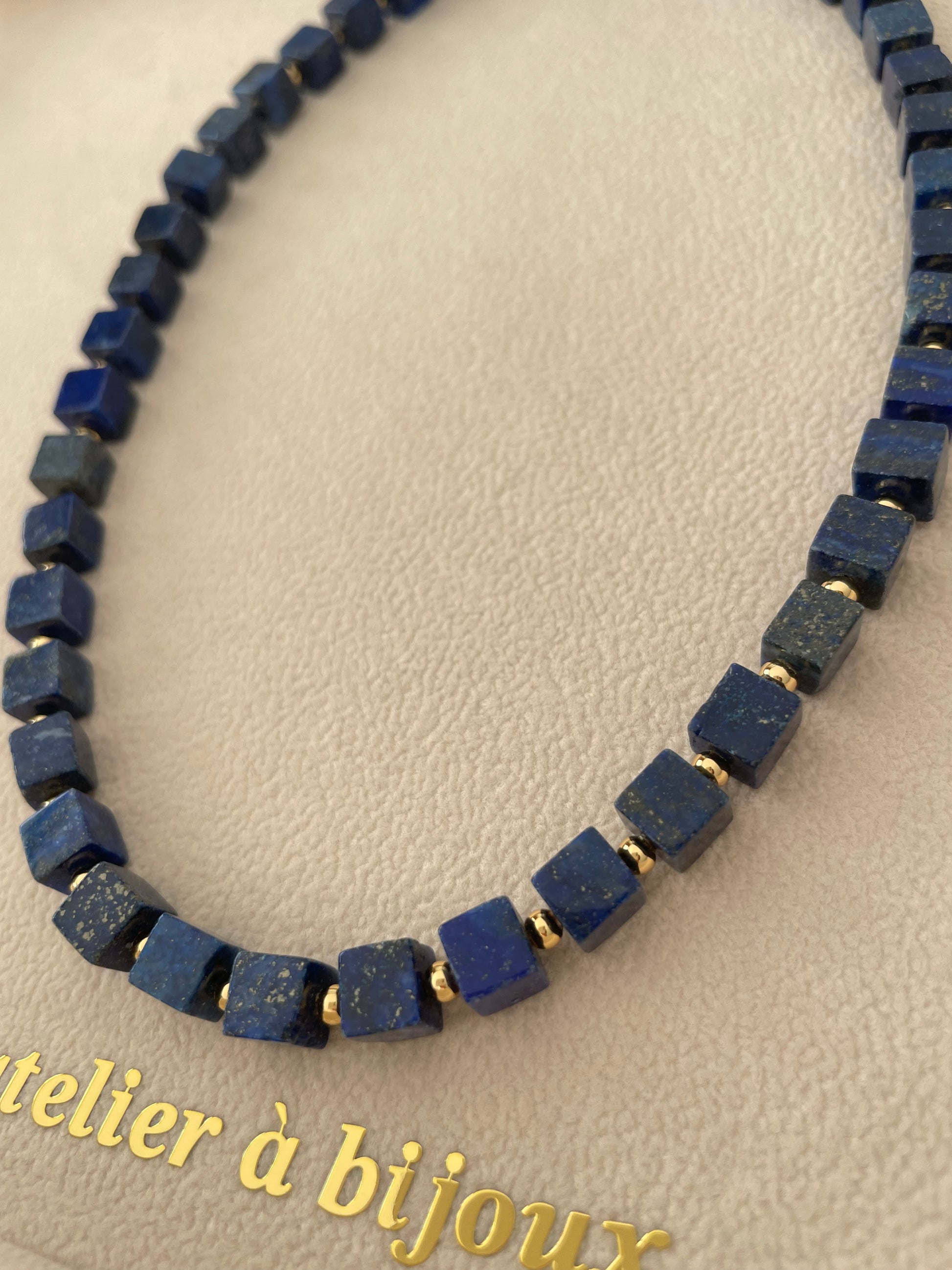 Dưới đây là mô tả sản phẩm cho chiếc vòng cổ đá Lapis Lazuli cắt vuông trong ảnh, giữ nguyên phong cách sang trọng, tinh tế và hiện đại phù hợp với thương hiệu L’atelier à bijoux: