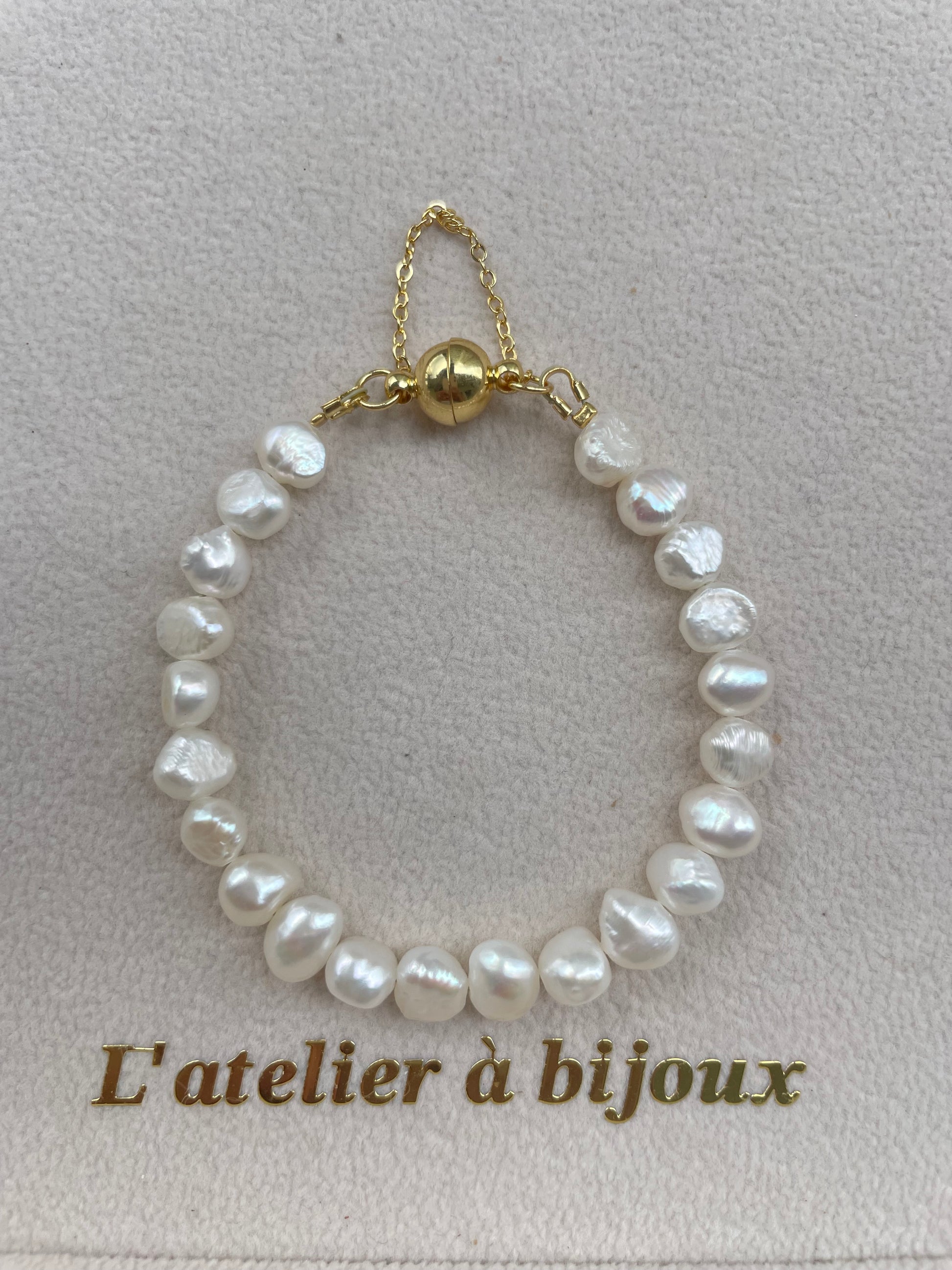Chiếc vòng tay nổi bật với thiết kế thanh lịch, sử dụng những viên ngọc trai trắng tự nhiên tròn đều, óng ánh, kết hợp cùng khóa cầu mạ vàng sang trọng. Điểm nhấn tinh tế nằm ở charm logo thương hiệu được gắn khéo léo, mang đến vẻ cao cấp và khẳng định dấu ấn riêng biệt.