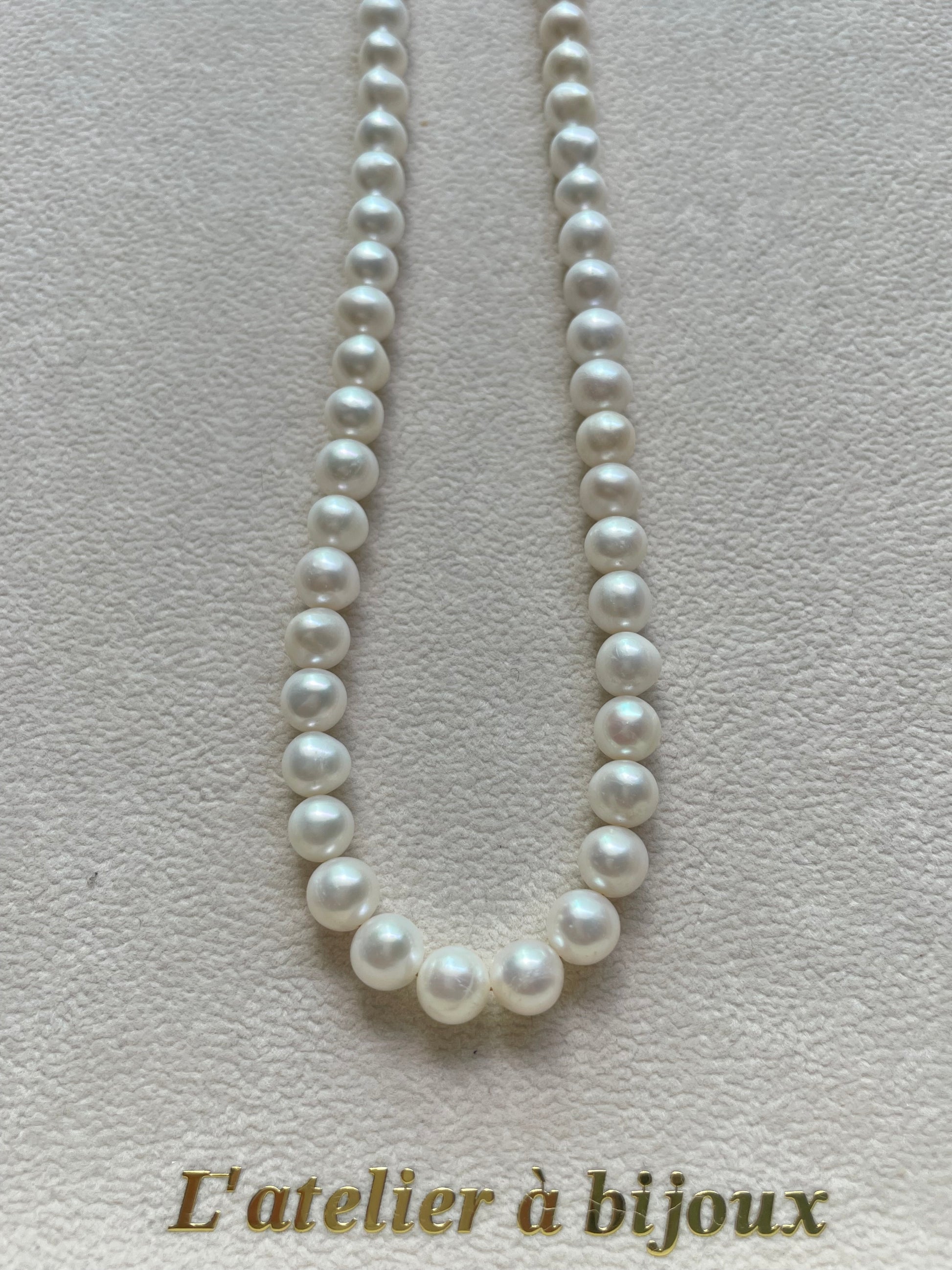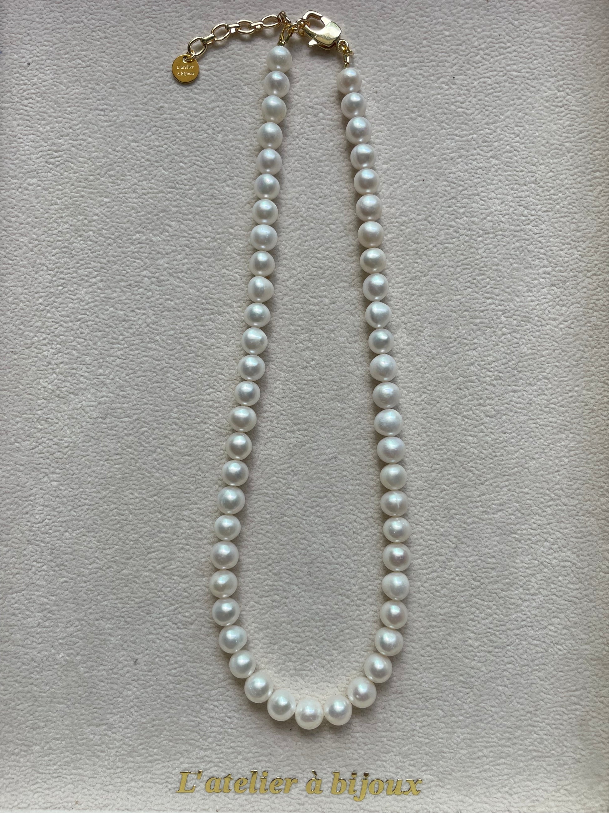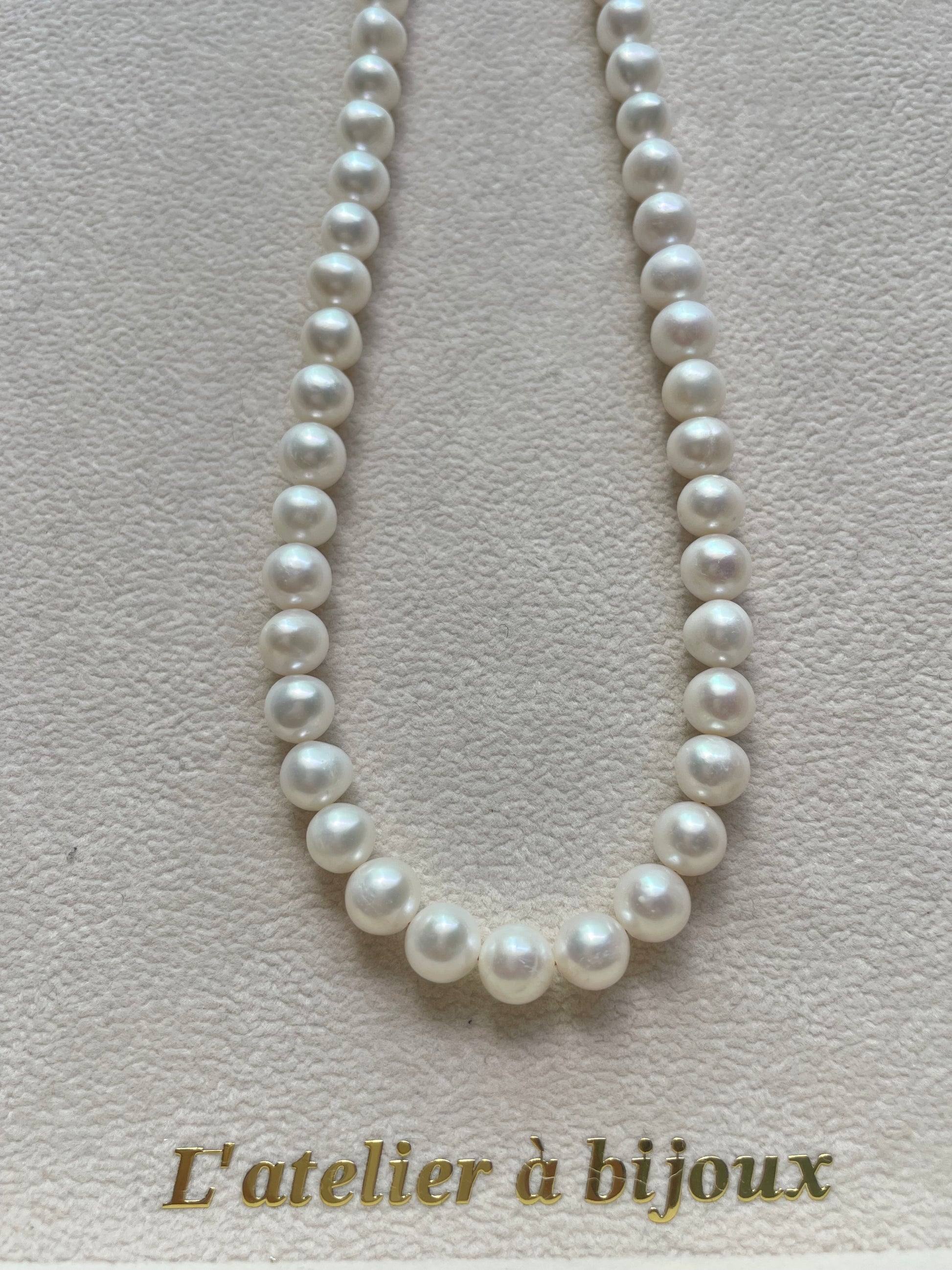 Chiếc vòng cổ này tôn vinh vẻ đẹp tự nhiên và sang trọng với chuỗi ngọc trai nước ngọt kích thước 8–9mm. Những viên ngọc trai dáng tròn đều đặn, ánh sắc trắng ngà óng ánh, mang lại cảm giác vừa thanh lịch vừa quyền quý – một thiết kế kinh điển không bao giờ lỗi thời.