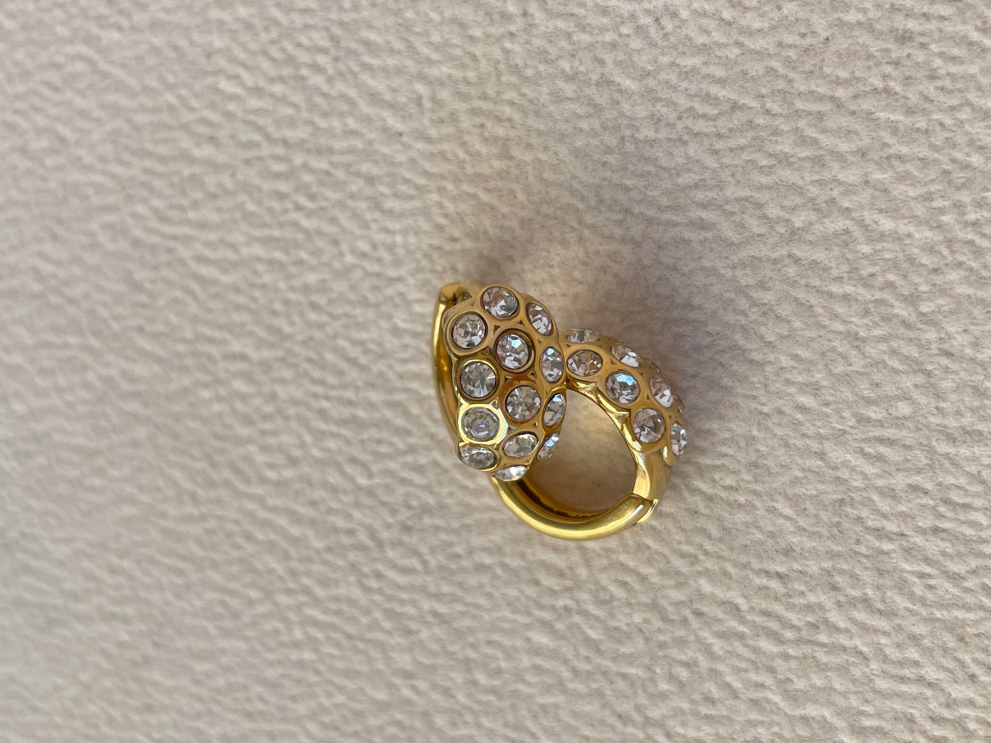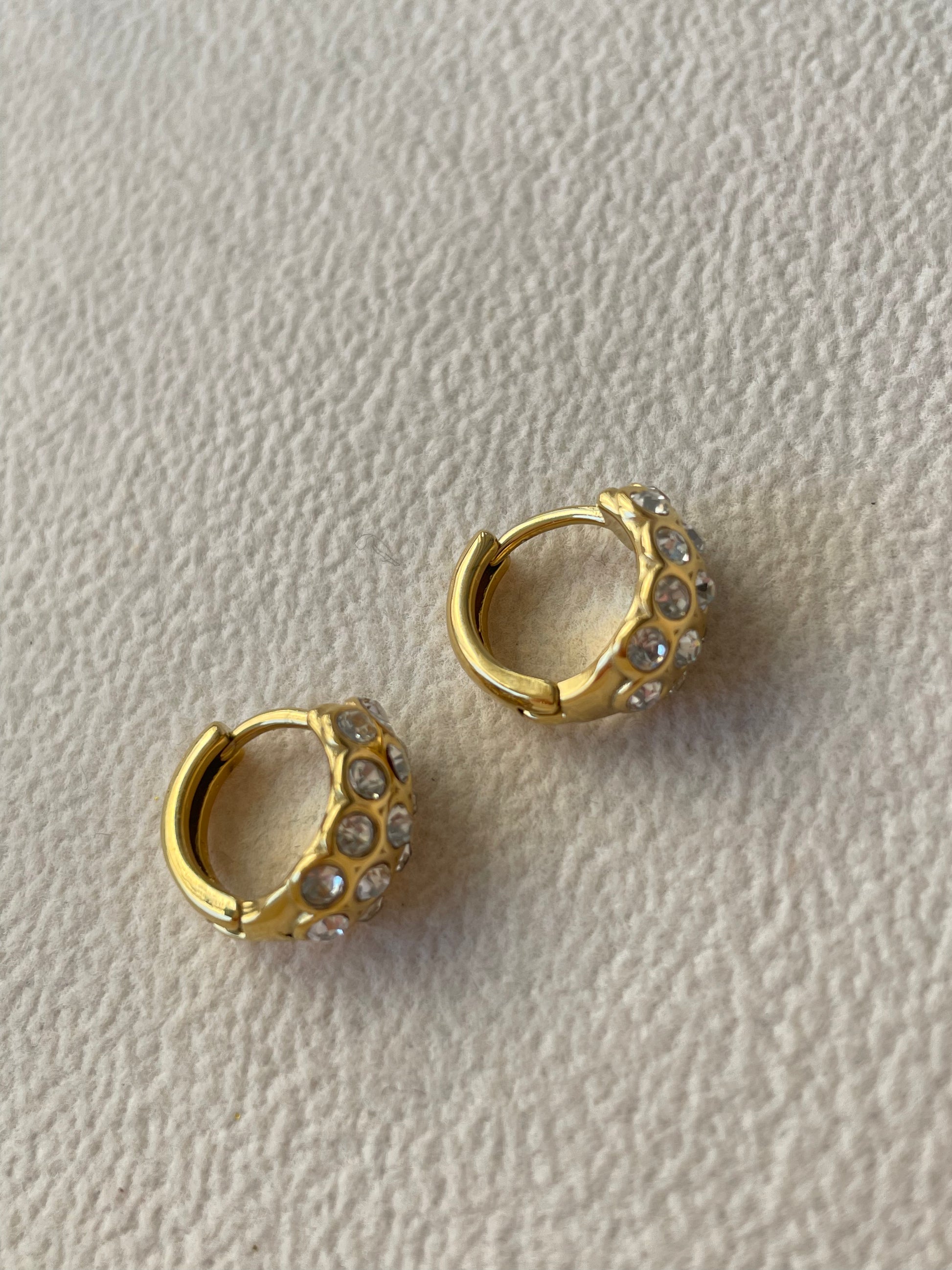 Đôi hoa tai vòng vàng này mang thiết kế tinh tế và sang trọng với kiểu dáng nhỏ gọn, đính những viên đá cz lấp lánh trên nền mạ vàng cao cấp. Sự kết hợp giữa đường nét thanh lịch và ánh sáng lung linh từ đá cz tạo nên một phụ kiện hoàn hảo, dễ dàng phối hợp với nhiều phong cách trang phục, từ năng động đến quý phái.