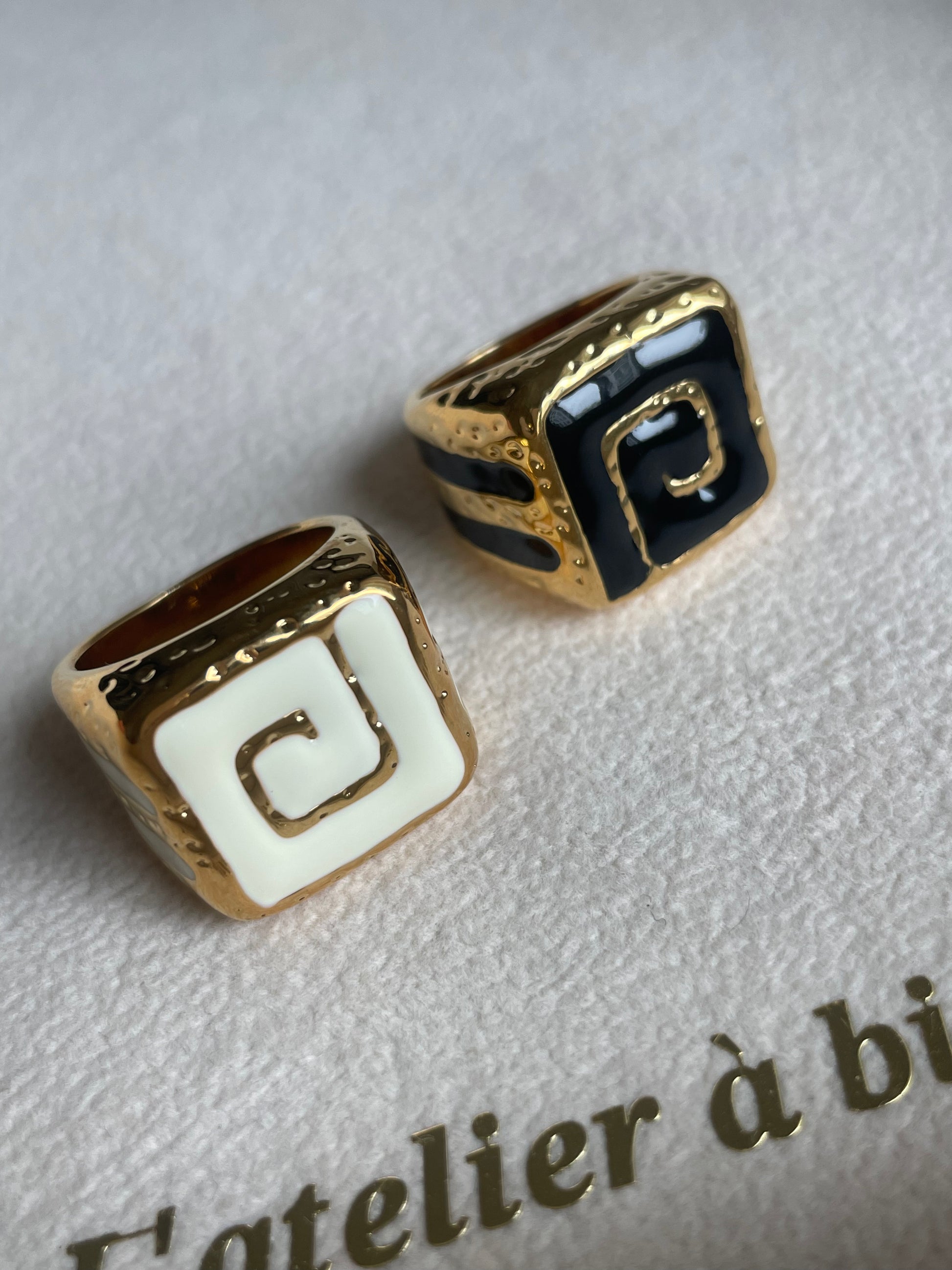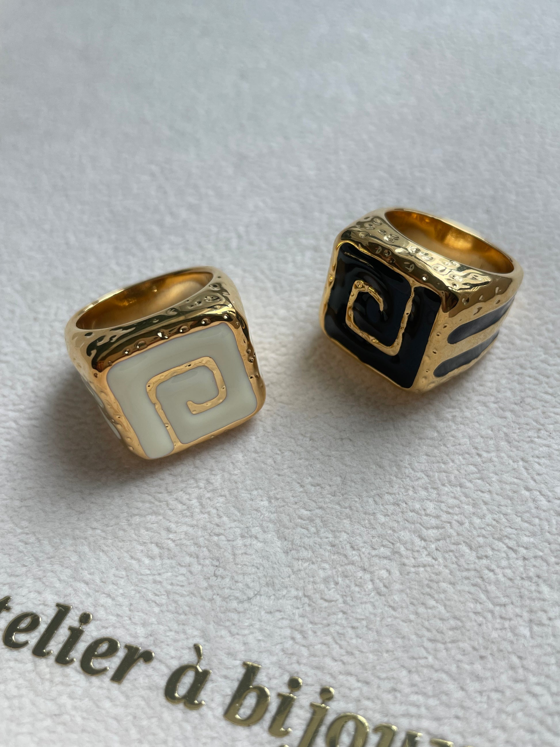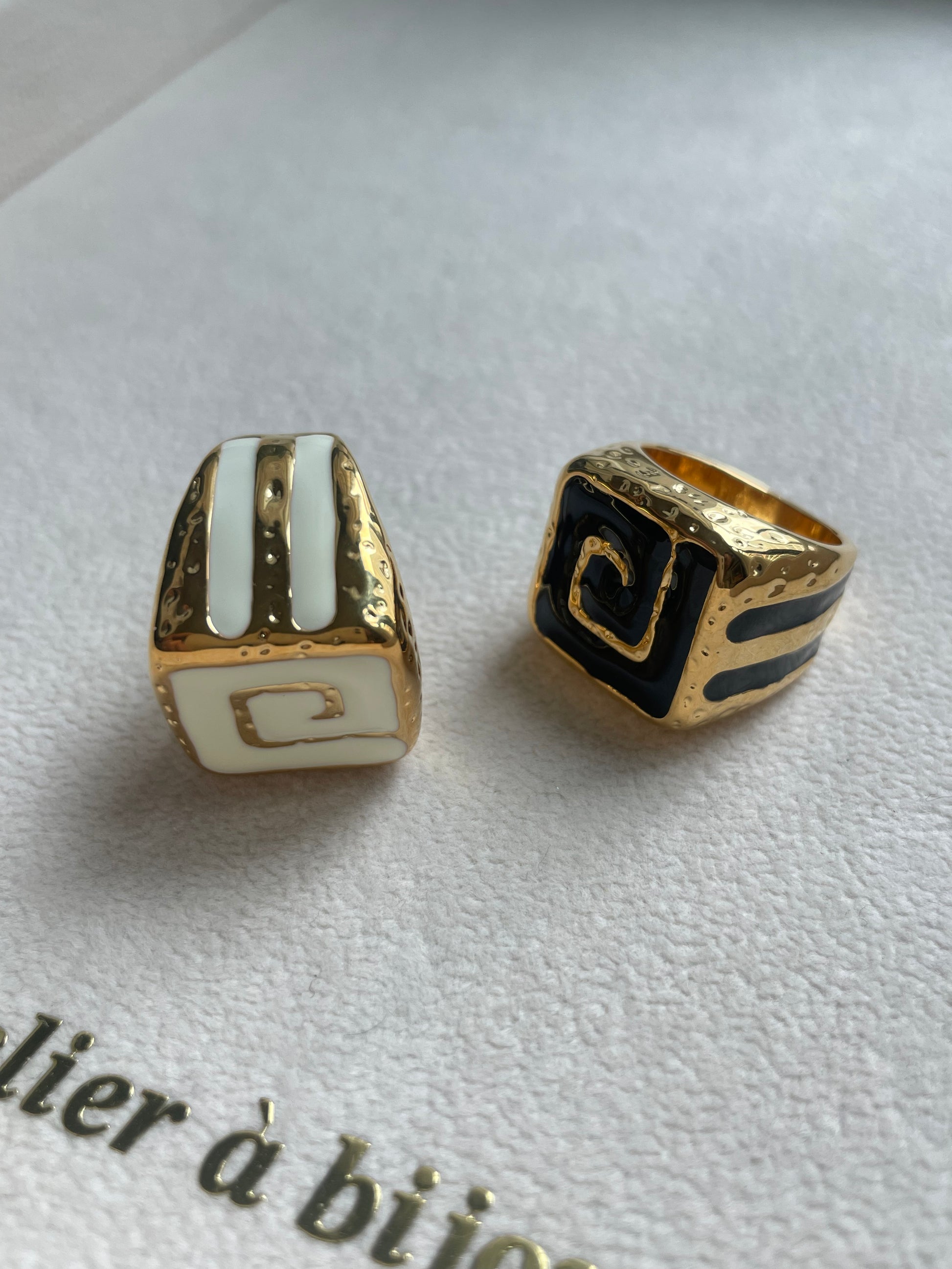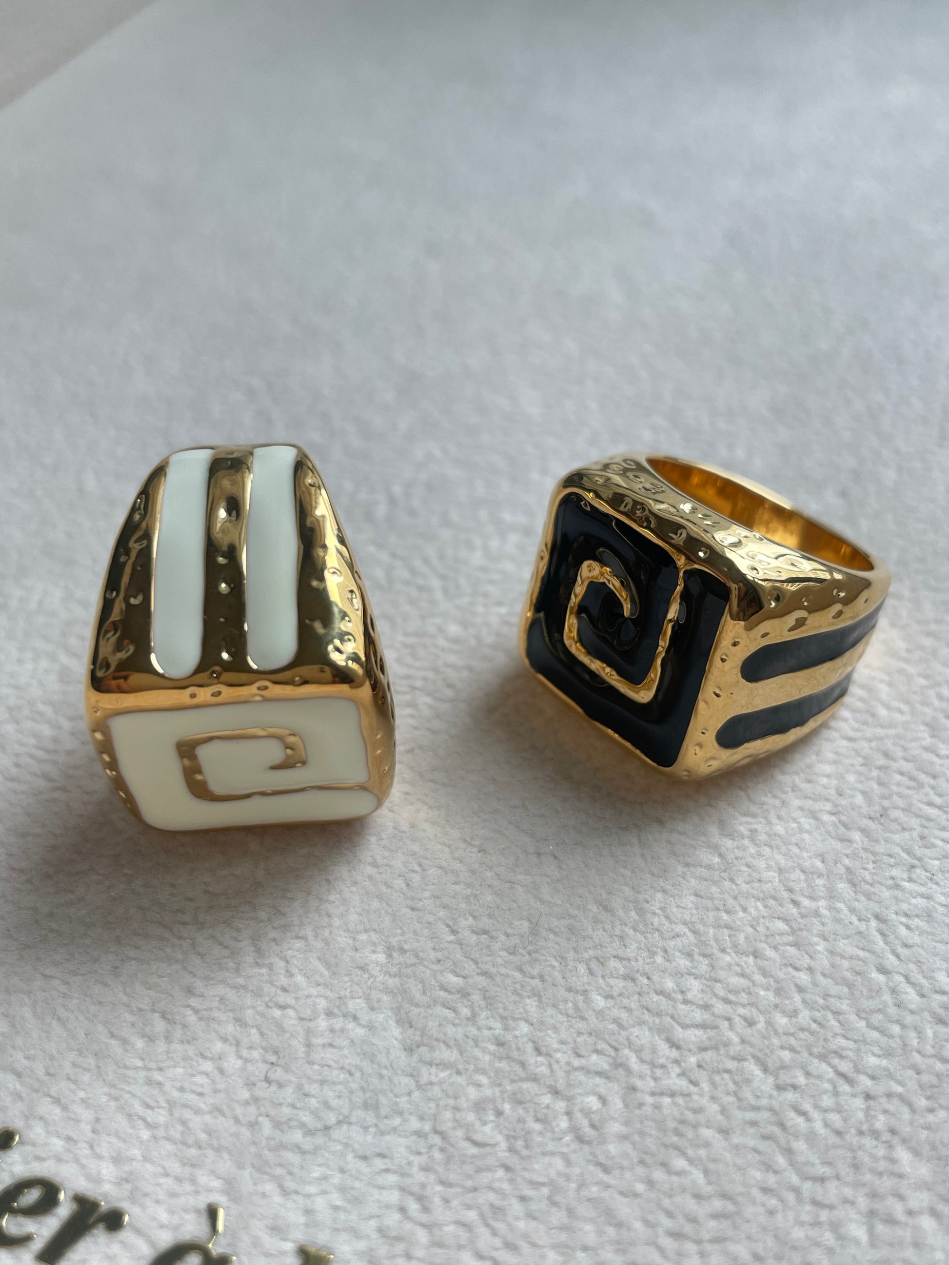 Chiếc nhẫn nổi bật với thiết kế đậm chất nghệ thuật, lấy cảm hứng từ những đường xoắn ốc hiện đại. Được chế tác từ kim loại mạ vàng sang trọng, kết hợp cùng lớp men trắng và đen bóng bẩy, mỗi chiếc nhẫn tạo nên sự đối lập tinh tế giữa gam màu tối giản và ánh vàng ấm áp.