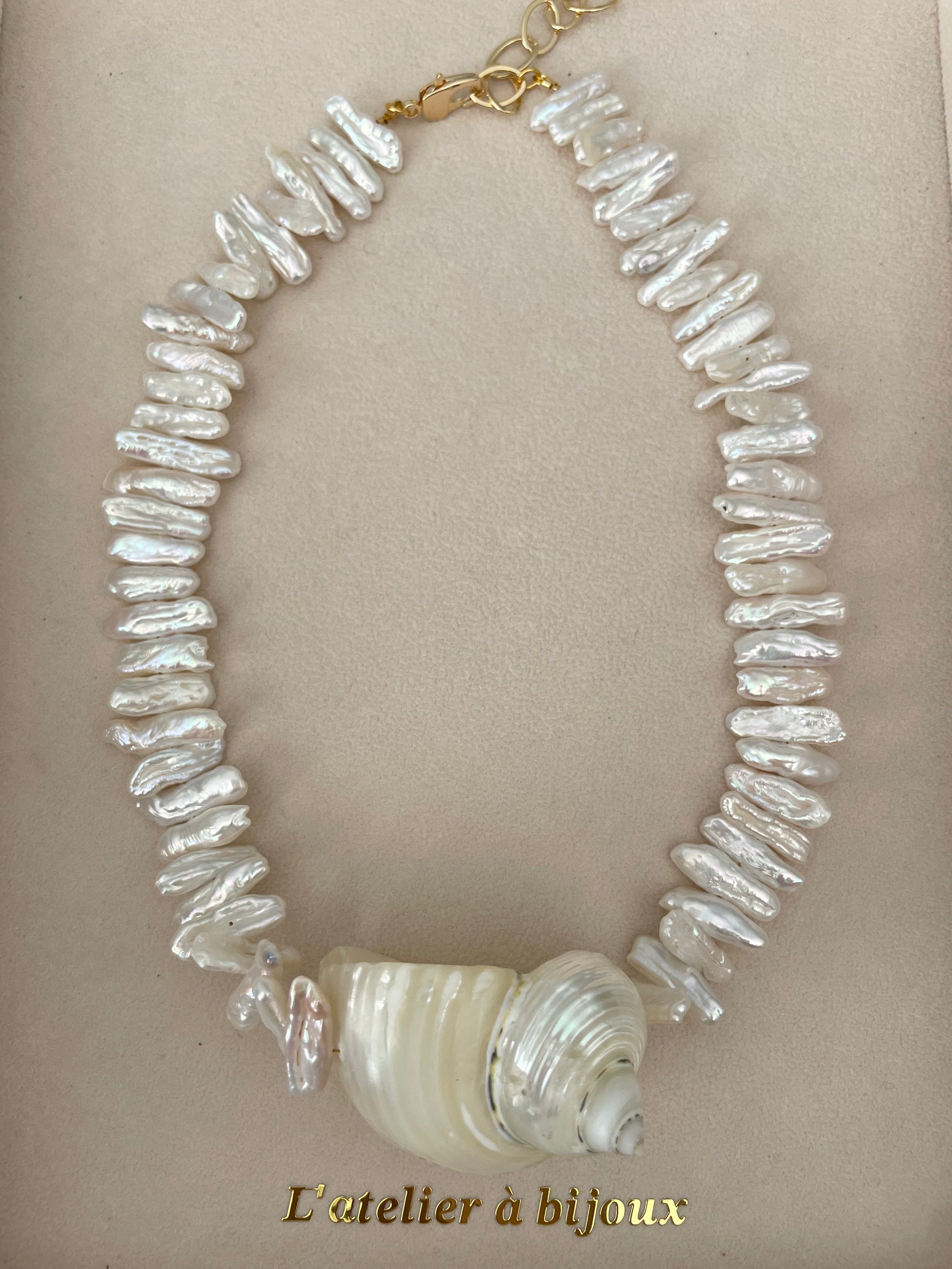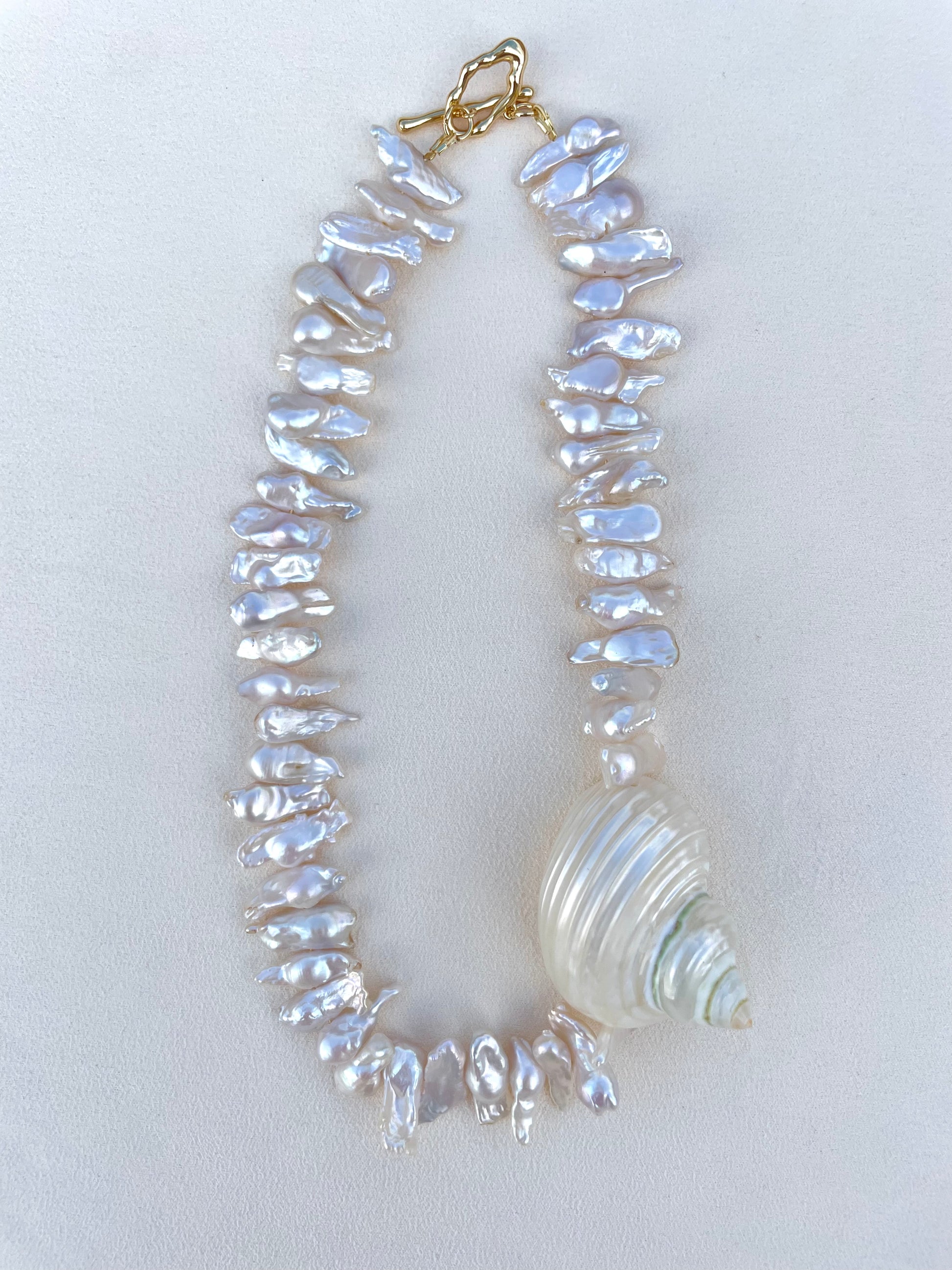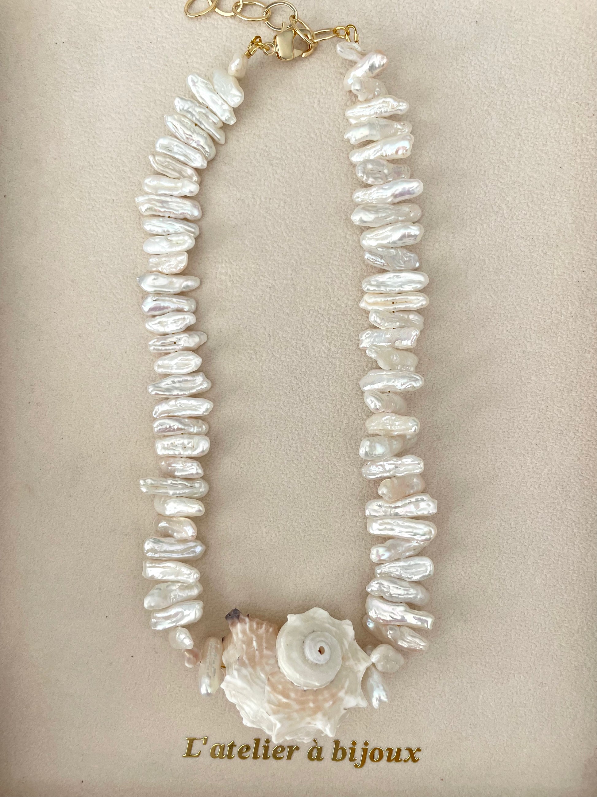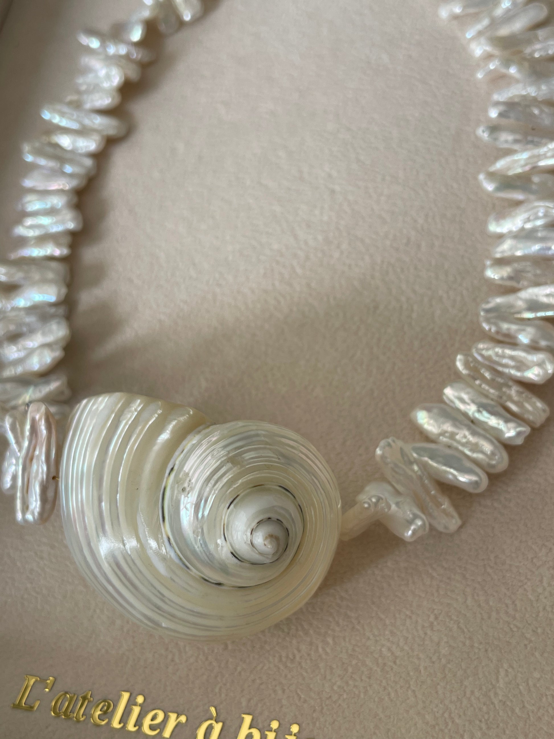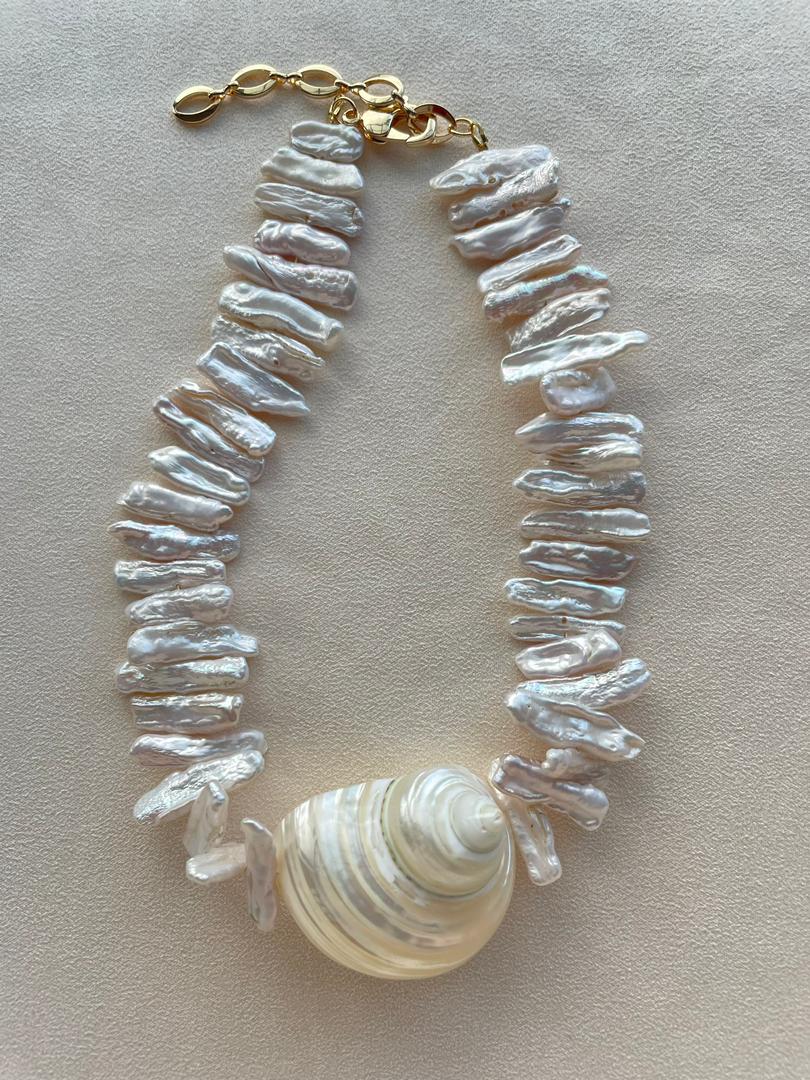 Chiếc vòng cổ ngọc trai & vỏ sò mang đậm hơi thở của đại dương, được chế tác từ ngọc trai nước ngọt cao cấp kết hợp cùng vỏ sò tự nhiên nguyên khối. Thiết kế độc đáo với điểm nhấn là chiếc vỏ sò lớn, mang đến cảm giác vừa hoang sơ, phóng khoáng, vừa thanh lịch, sang trọng.