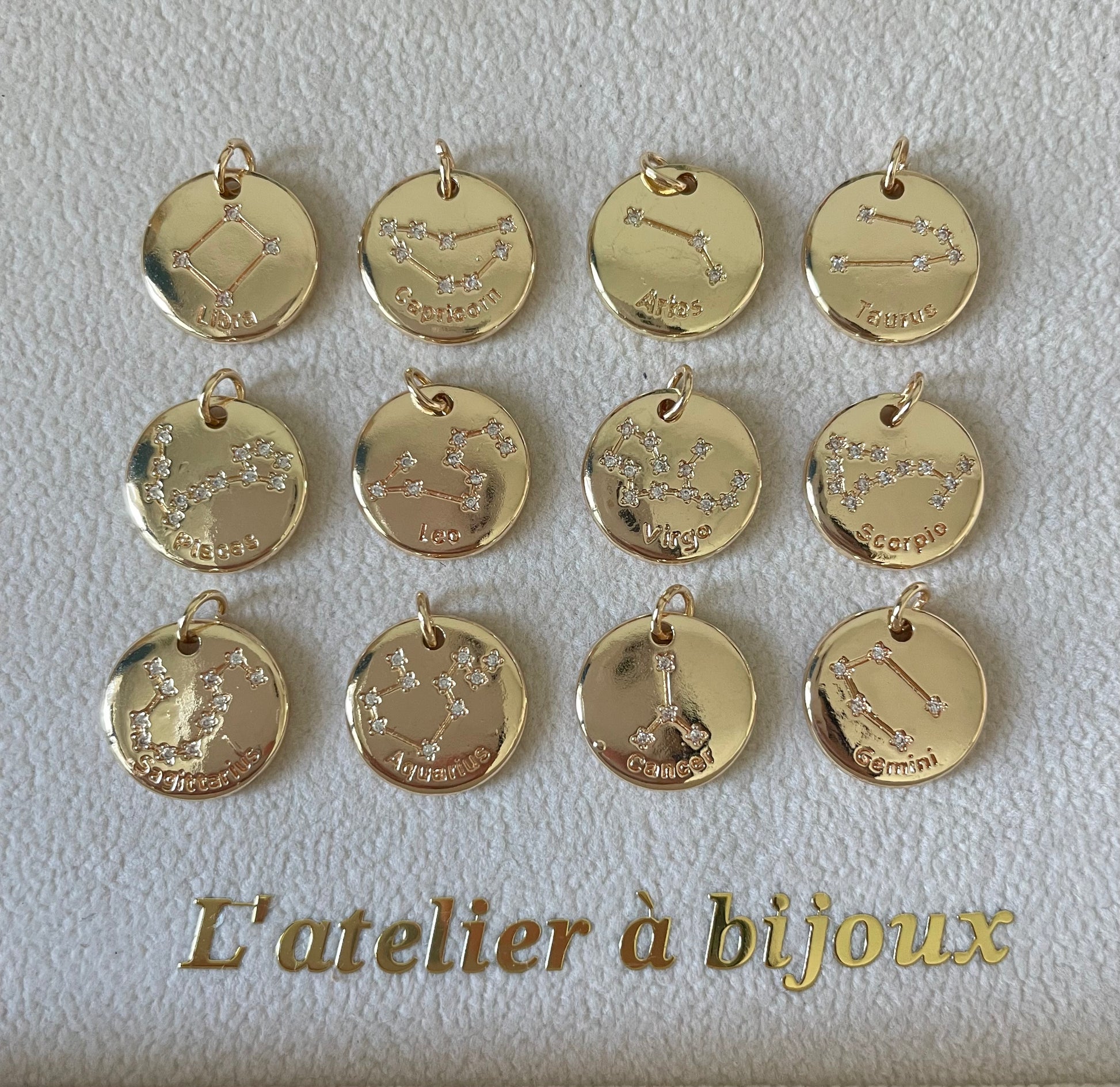 Bộ charm cung hoàng đạo nổi bật với thiết kế tinh xảo, được chế tác từ kim loại mạ vàng cao cấp và đính đá cubic zirconia lấp lánh, tái hiện hình ảnh chòm sao đặc trưng của từng cung. Mỗi chi tiết được gia công tỉ mỉ, tạo hiệu ứng ánh sáng sang trọng và tinh tế.