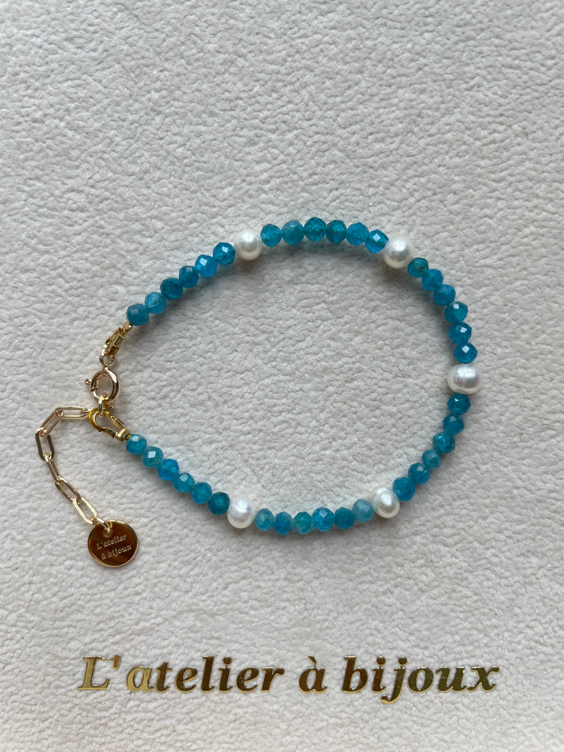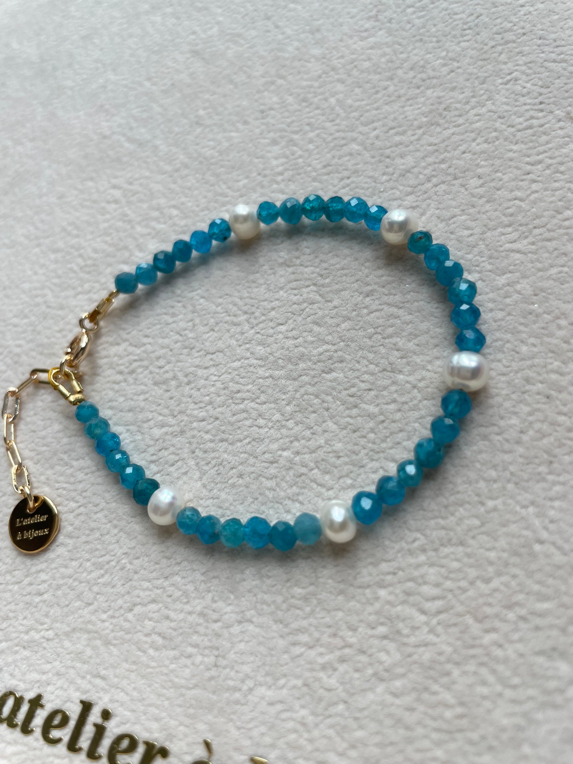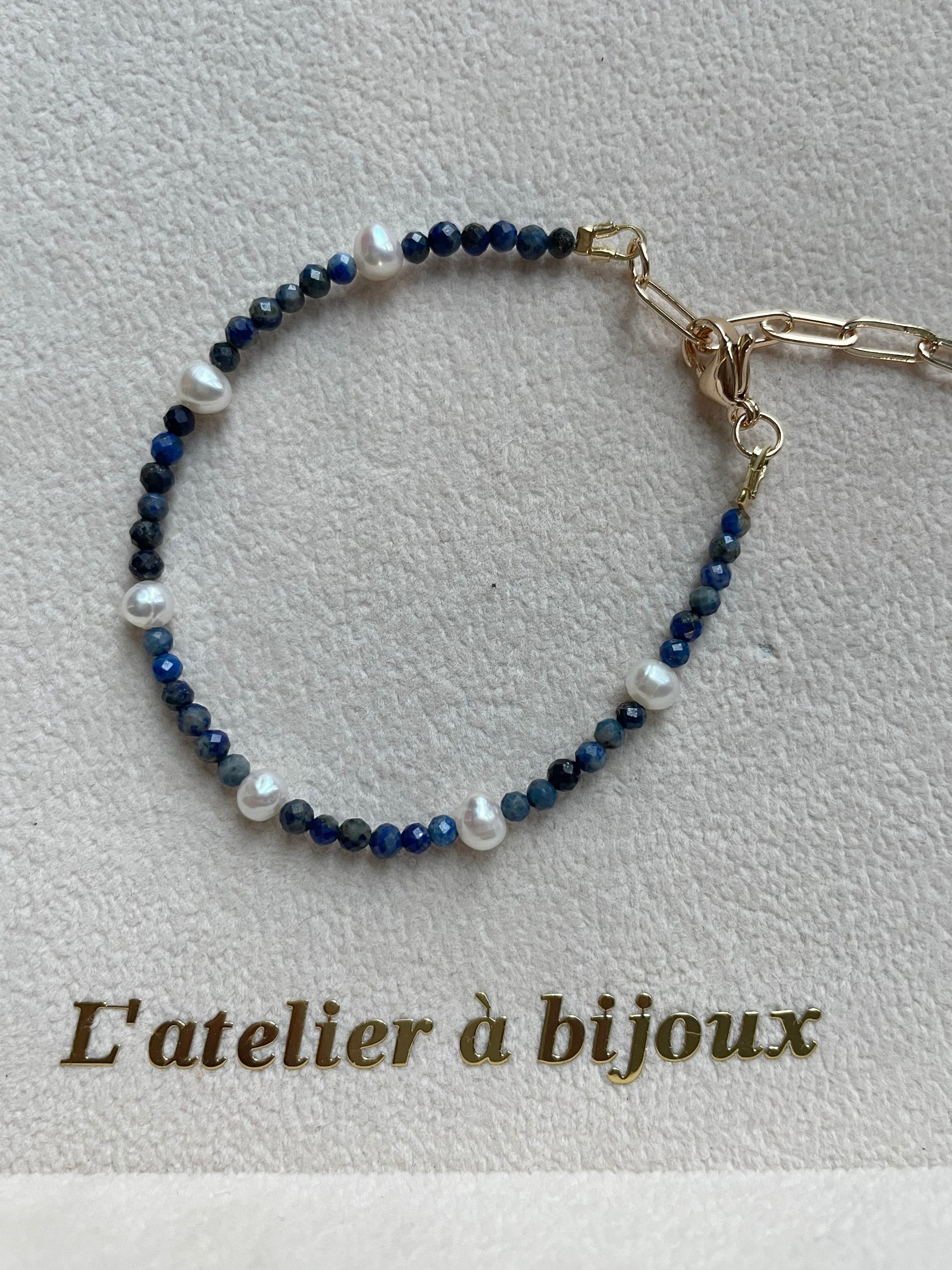 Chiếc vòng tay kết hợp giữa những viên đá xanh đen cắt giác lấp lánh và những viên ngọc trai tự nhiên tinh tế, tạo nên vẻ đẹp hài hòa, thanh lịch và hiện đại.