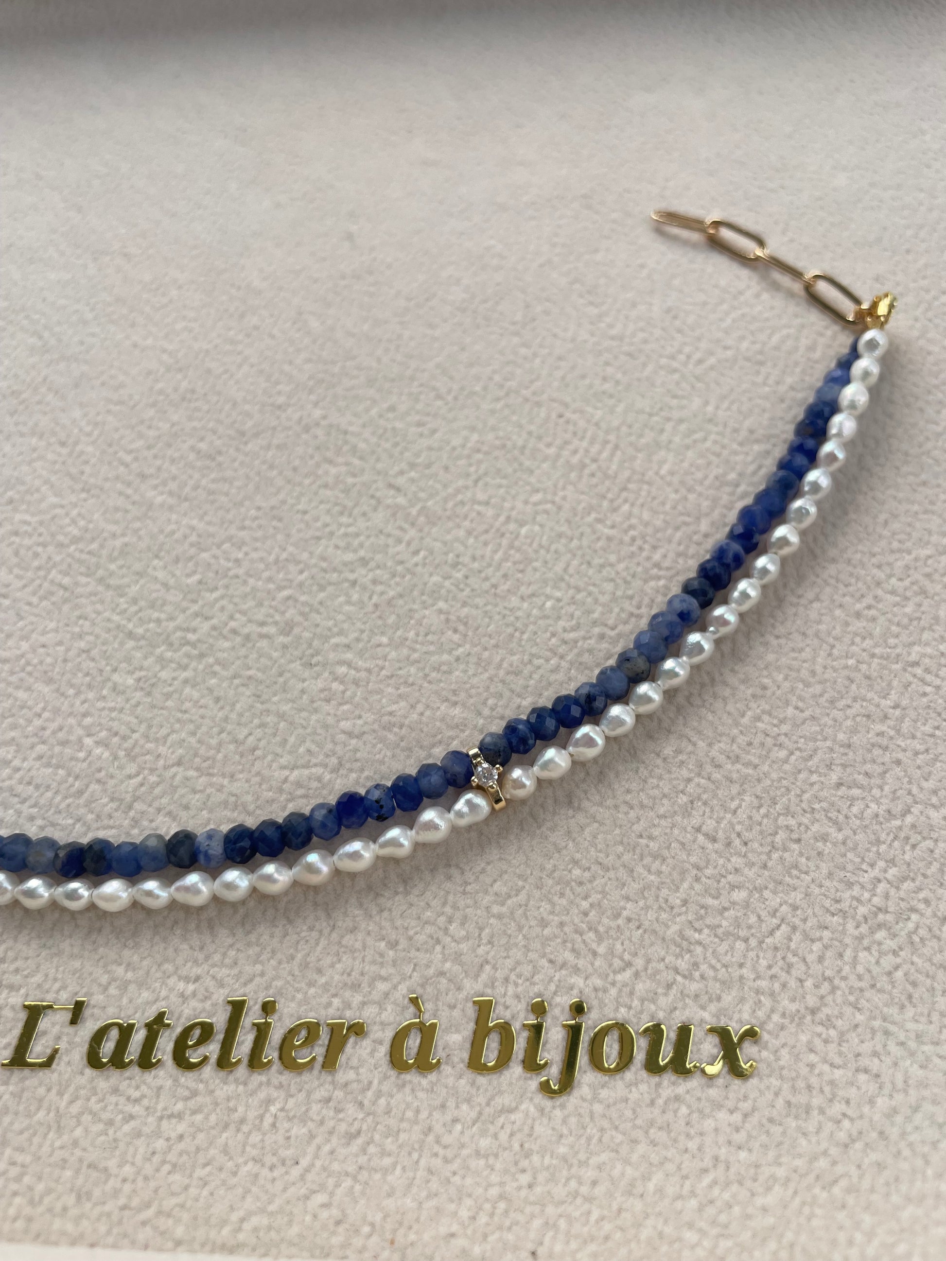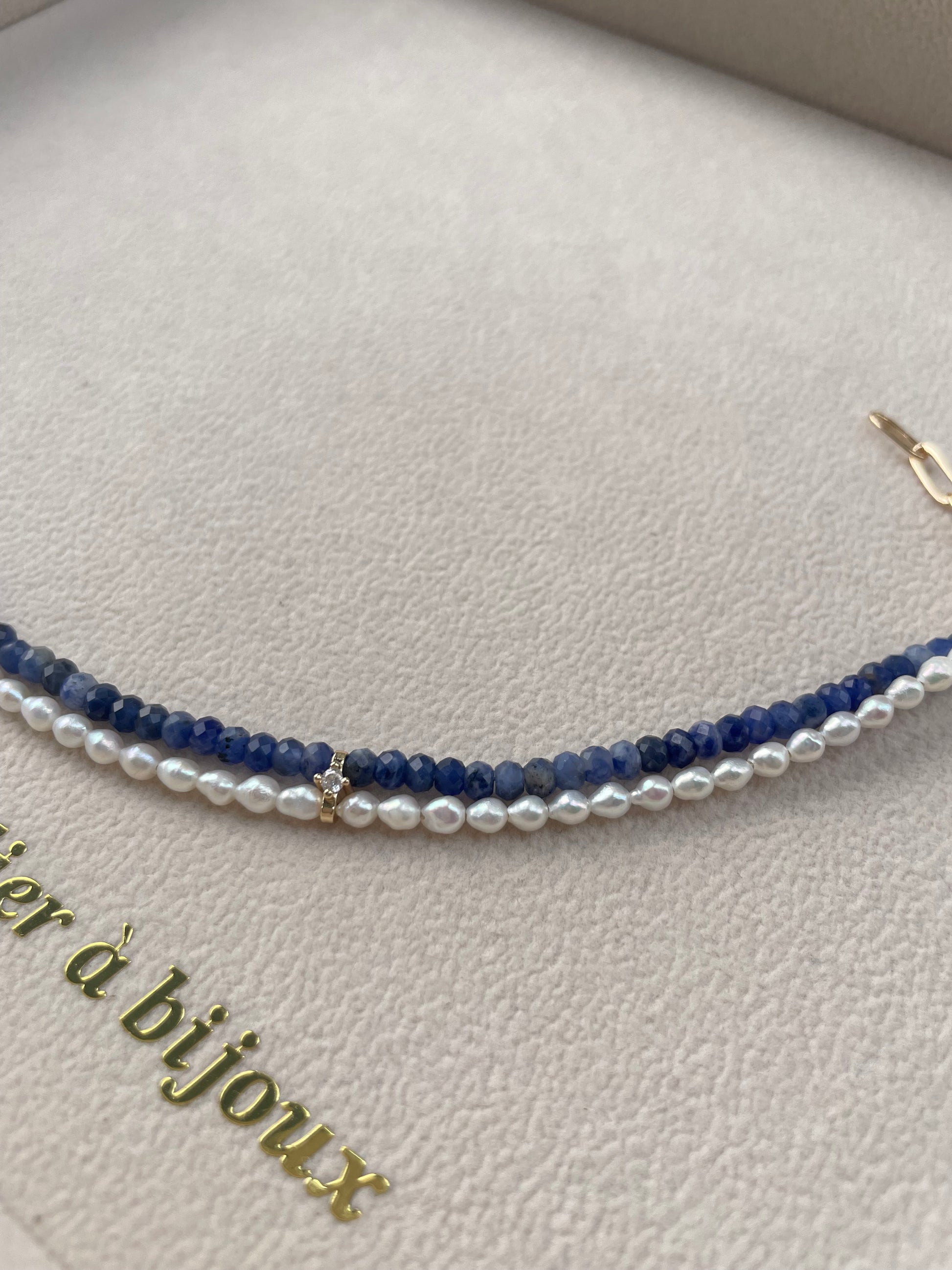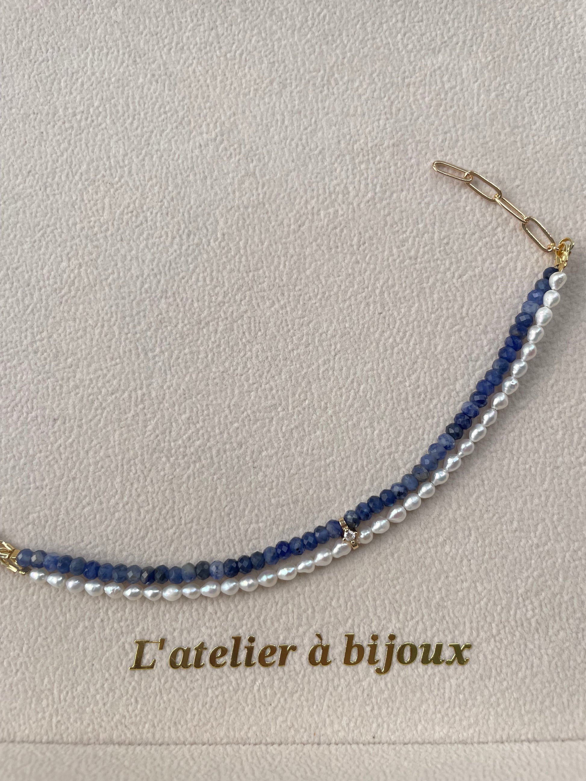 Chiếc vòng tay nổi bật với thiết kế thanh thoát, kết hợp tinh tế giữa hạt đá xanh cắt facet lấp lánh và ngọc trai trắng tự nhiên nhỏ nhắn, tạo nên sự hài hòa giữa vẻ đẹp hiện đại và nét thanh lịch cổ điển. Điểm nhấn tinh xảo nằm ở charm logo thương hiệu, giúp thiết kế thêm phần sang trọng và khẳng định dấu ấn riêng biệt.