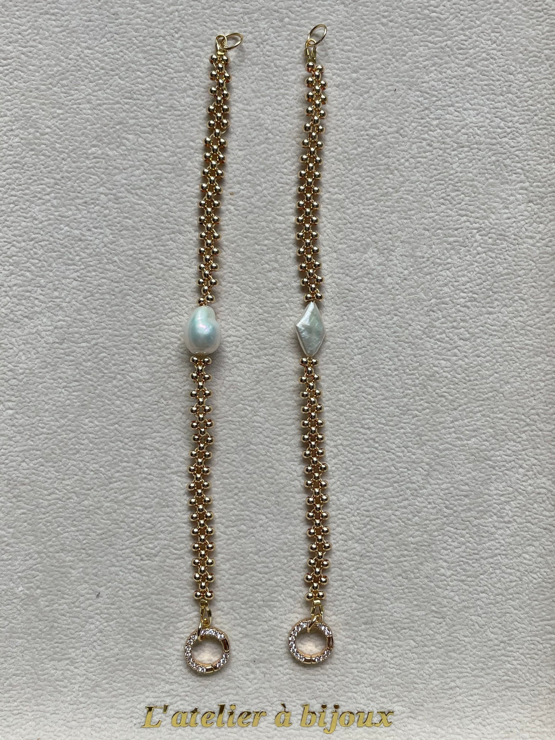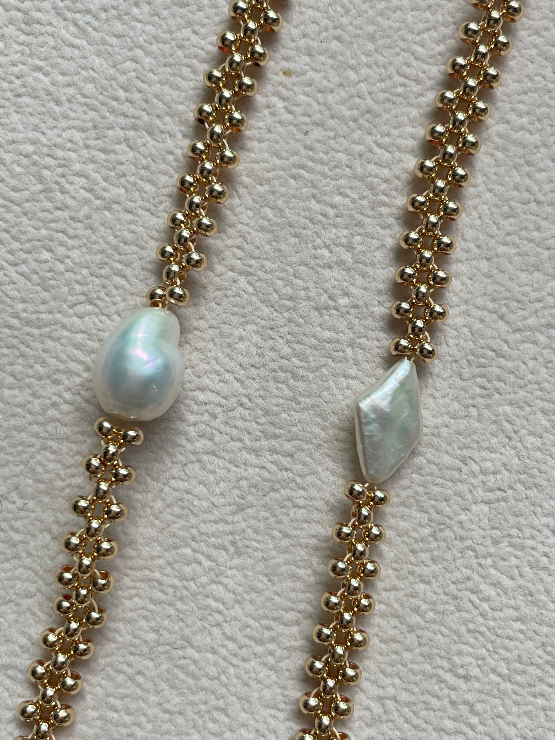 Chiếc vòng tay này mang vẻ đẹp thanh lịch và hiện đại, được thiết kế với dây chuỗi hạt kim loại mạ vàng 14k kết hợp điểm nhấn là ngọc trai nước ngọt dáng tự nhiên. Mỗi hạt trai mang hình dáng độc đáo, tạo sự khác biệt và cá tính cho từng thiết kế.