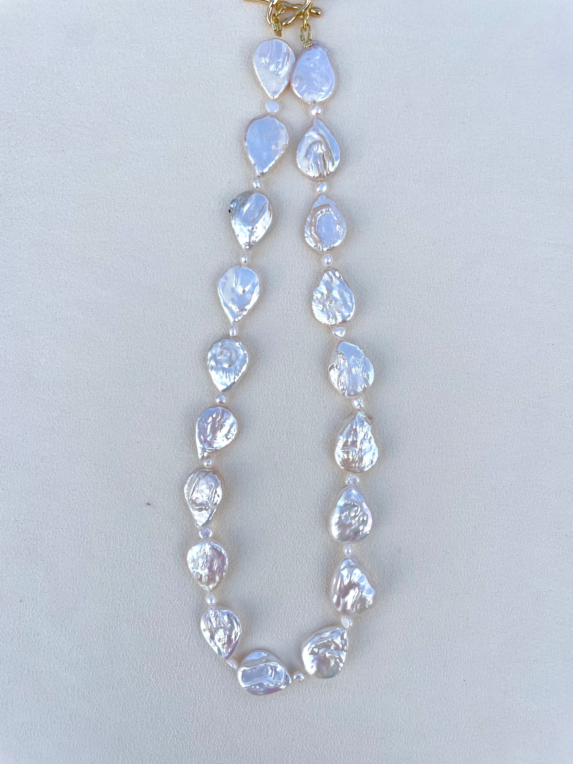 Mỗi viên ngọc trai giọt nước được chọn lọc thủ công, mang vẻ óng ánh đặc trưng cùng độ bóng tự nhiên, tạo nên một chiếc dây chuyền thanh lịch, hiện đại nhưng vẫn đầy nữ tính.