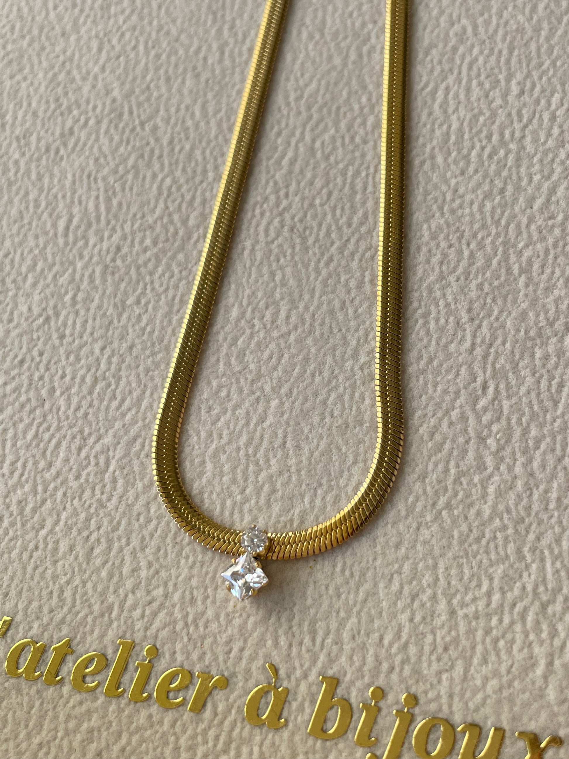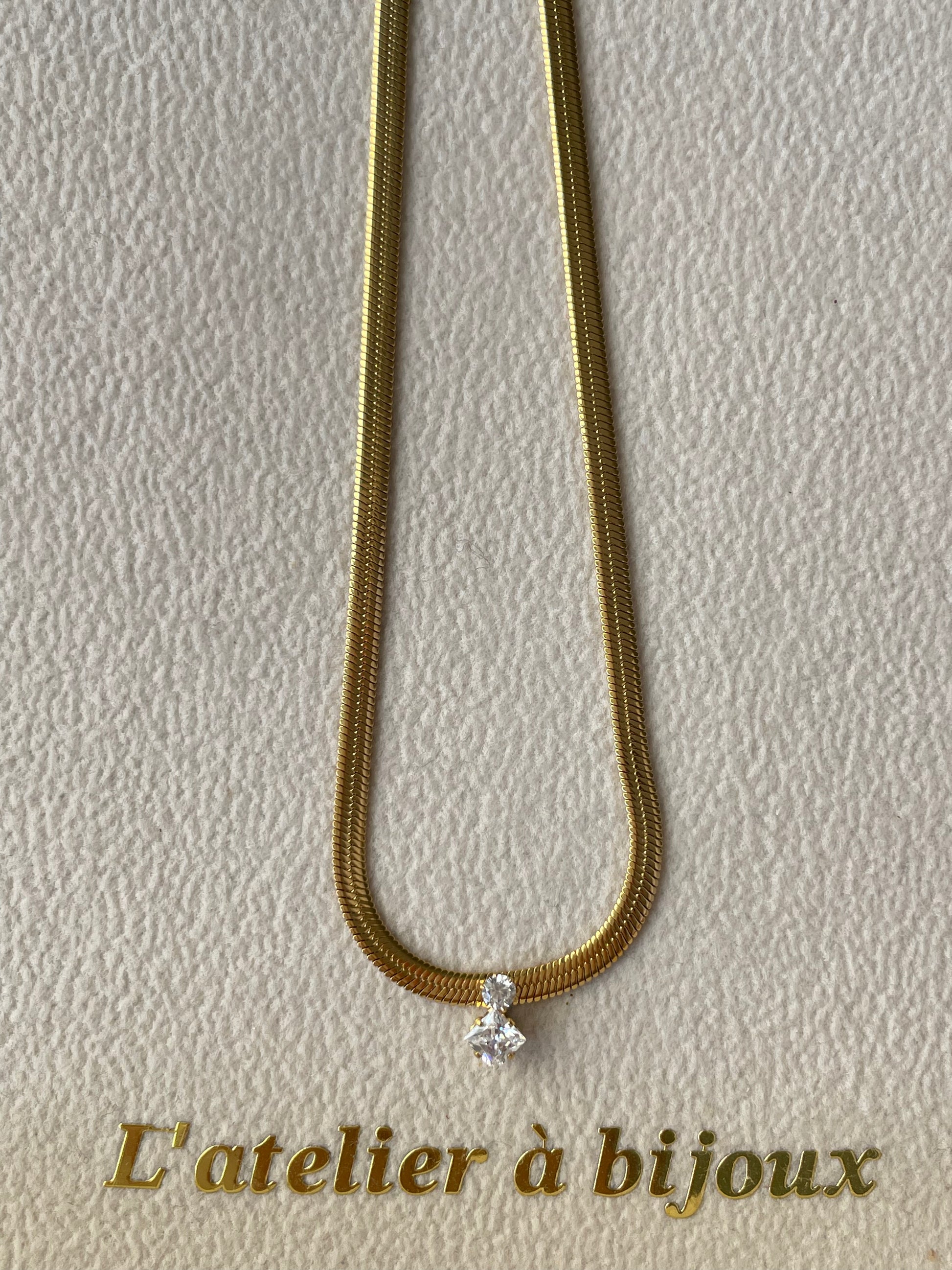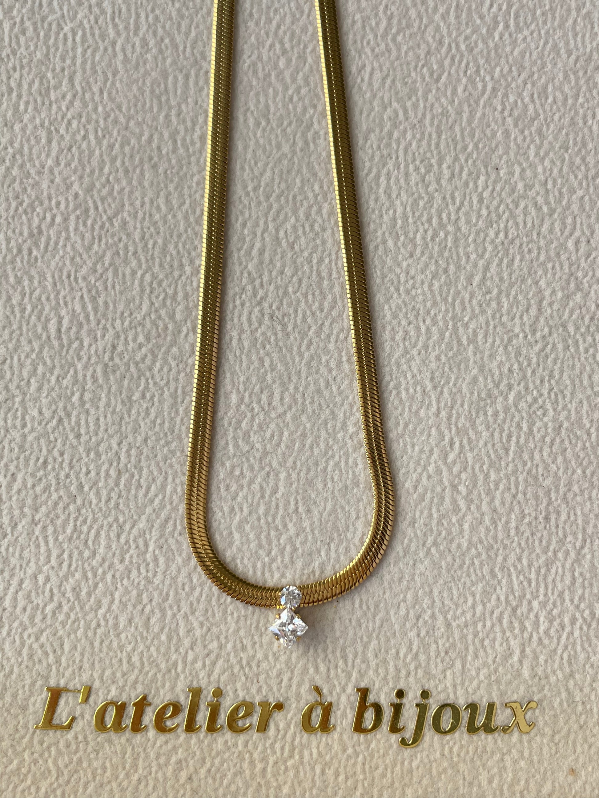 Chiếc vòng cổ dây rắn đính đá pha lê mang thiết kế thanh lịch và tối giản, được chế tác từ thép không gỉ cao cấp mạ vàng 18k với bề mặt sáng bóng, mềm mại ôm sát cổ, tạo cảm giác sang trọng và hiện đại. Điểm nhấn tinh tế nằm ở viên đá pha lê trắng cắt giác được đính khéo léo ở trung tâm, lấp lánh nhẹ nhàng theo từng chuyển động, làm nổi bật đường nét thanh tú của cổ.