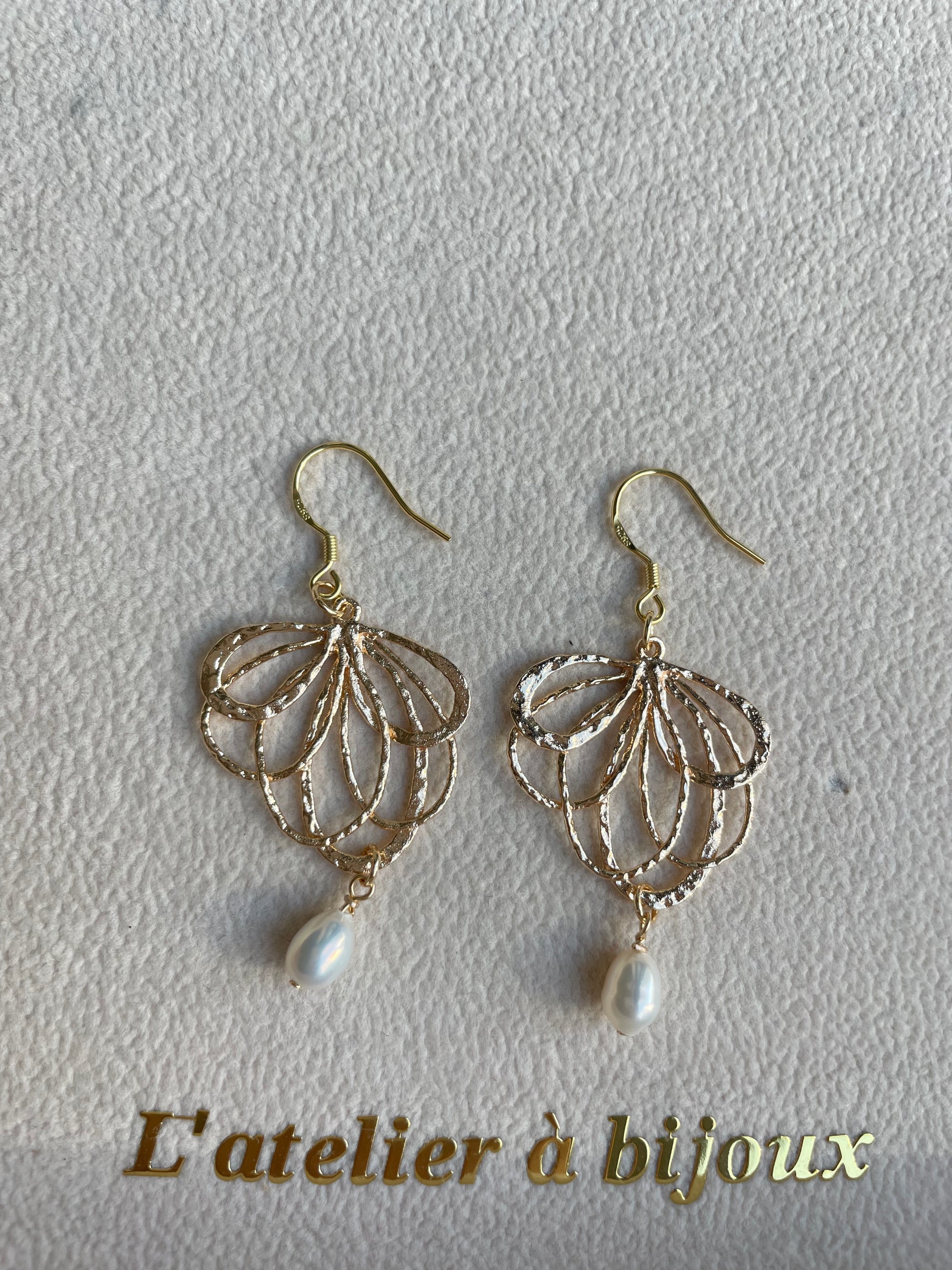 Đôi hoa tai nổi bật với thiết kế lấy cảm hứng từ hình dáng vỏ sò, được chế tác từ kim loại mạ vàng cao cấp cùng đường nét uốn lượn tinh xảo. Phần đuôi bông được điểm xuyết bởi viên ngọc trai trắng tự nhiên, mang lại vẻ đẹp thanh thoát và sang trọng.