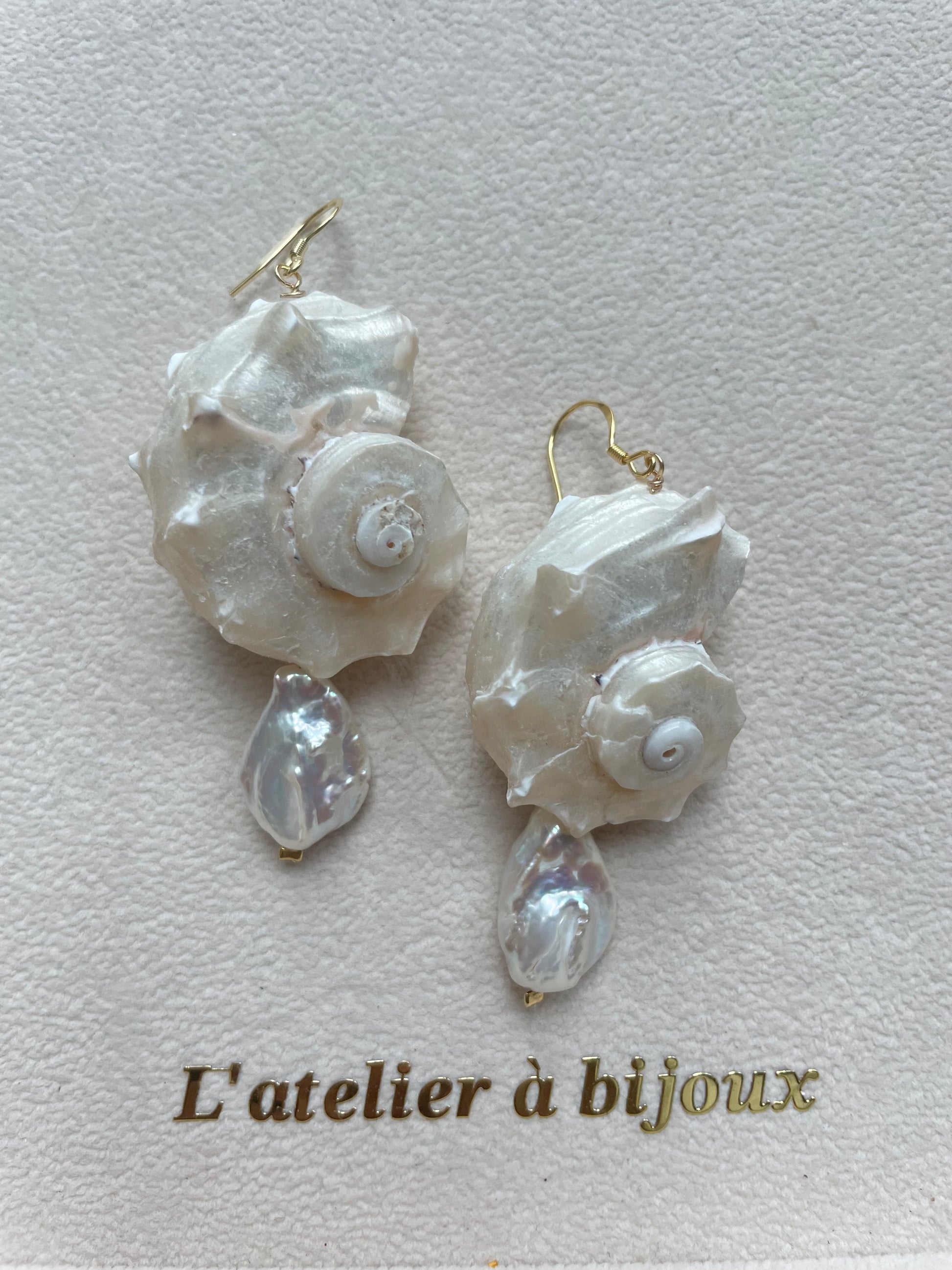 Đôi hoa tai vỏ sò này mang đậm hơi thở biển cả với thiết kế độc đáo từ vỏ sò tự nhiên kết hợp ngọc trai baroque sáng bóng. Từng chi tiết được chế tác tinh xảo, giữ nguyên nét đẹp tự nhiên và phóng khoáng, tạo nên một phụ kiện vừa nghệ thuật, vừa thanh lịch. Đây là lựa chọn hoàn hảo để làm điểm nhấn nổi bật cho phong cách mùa hè.