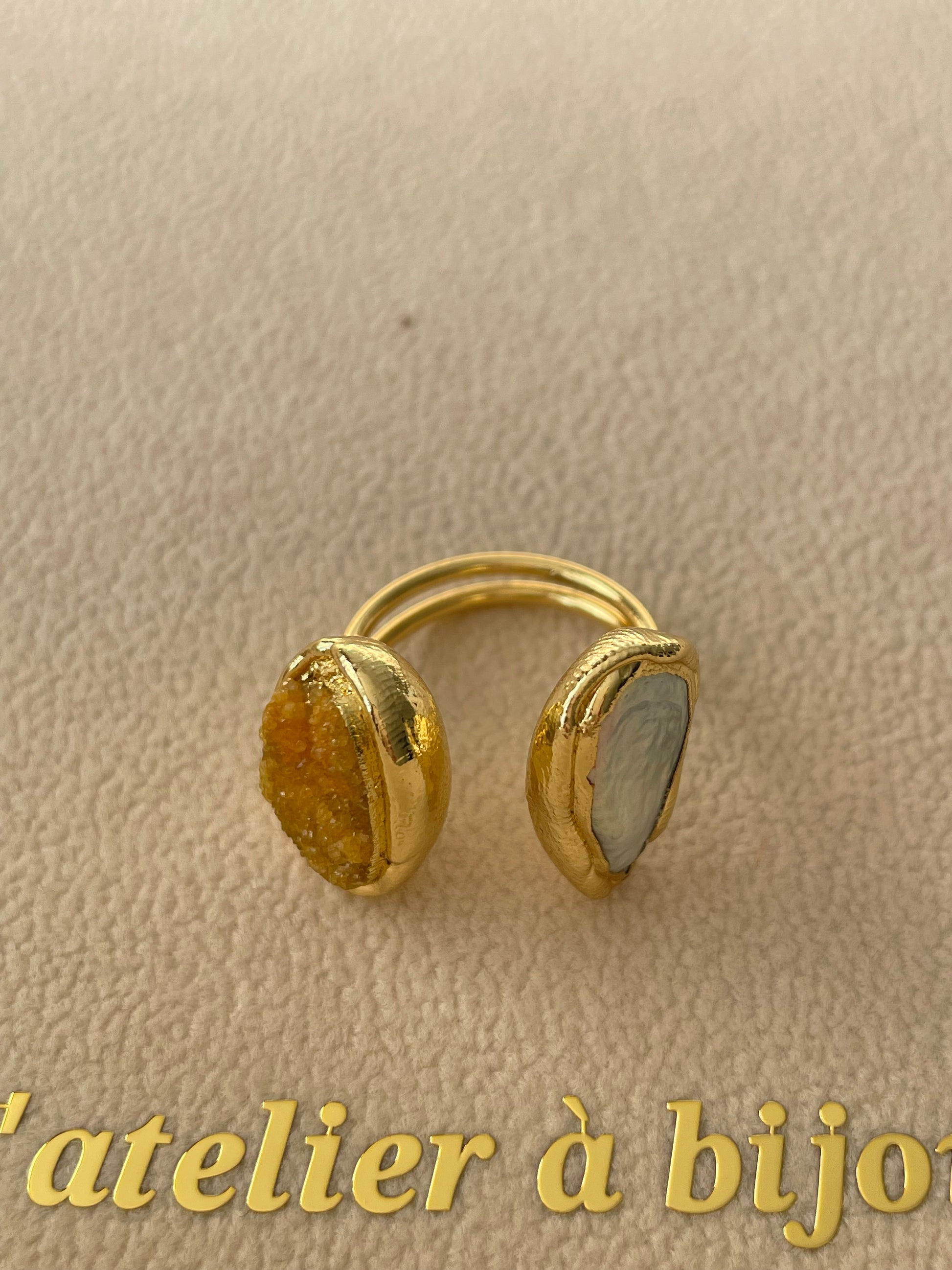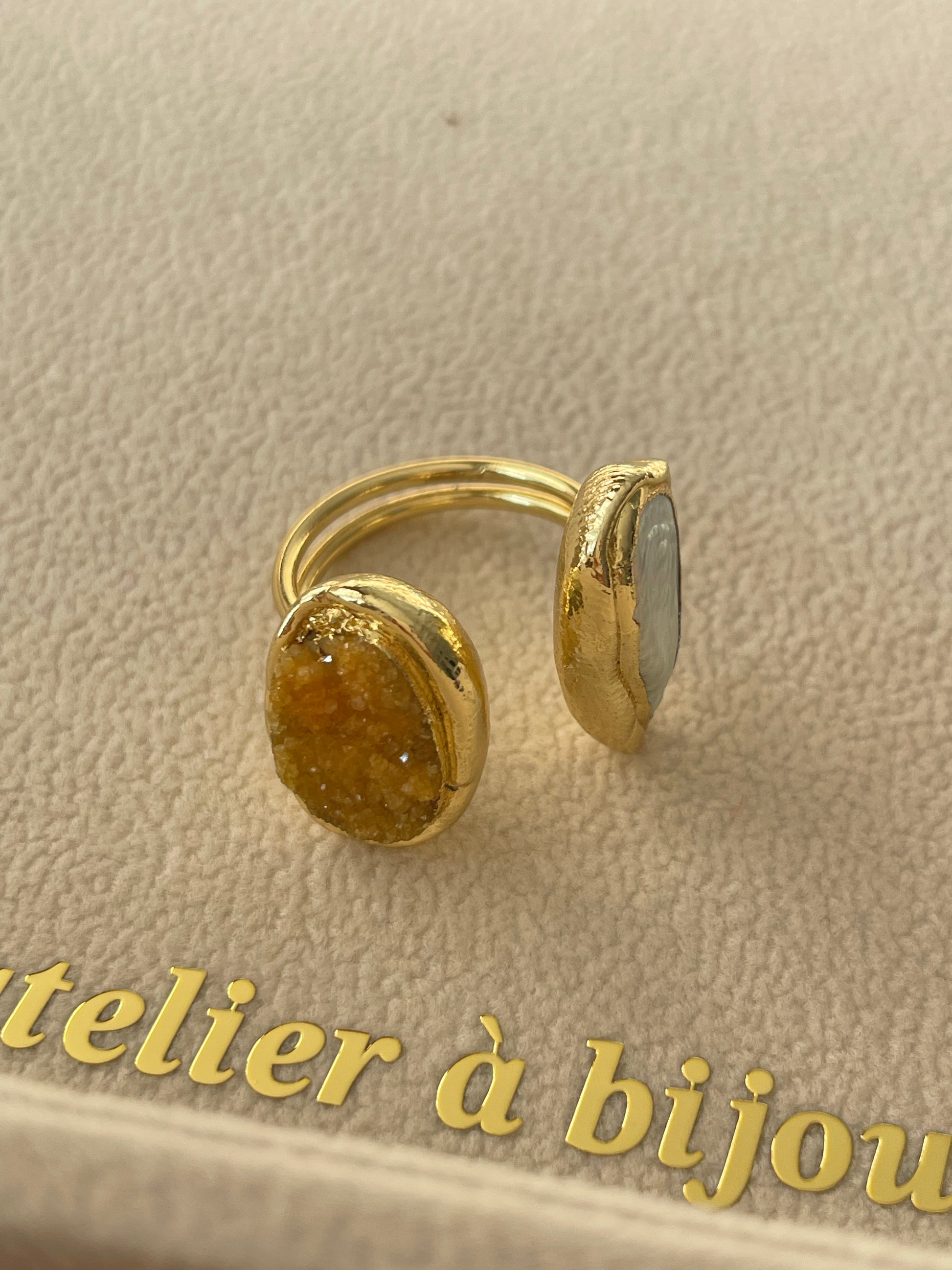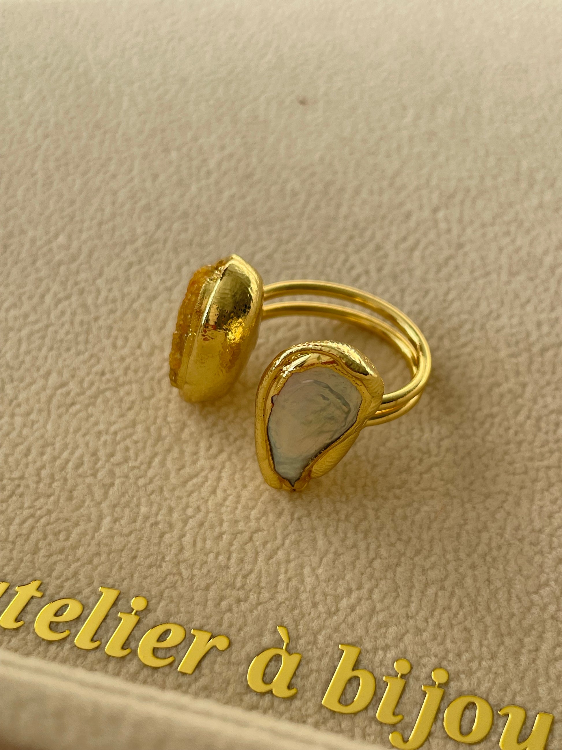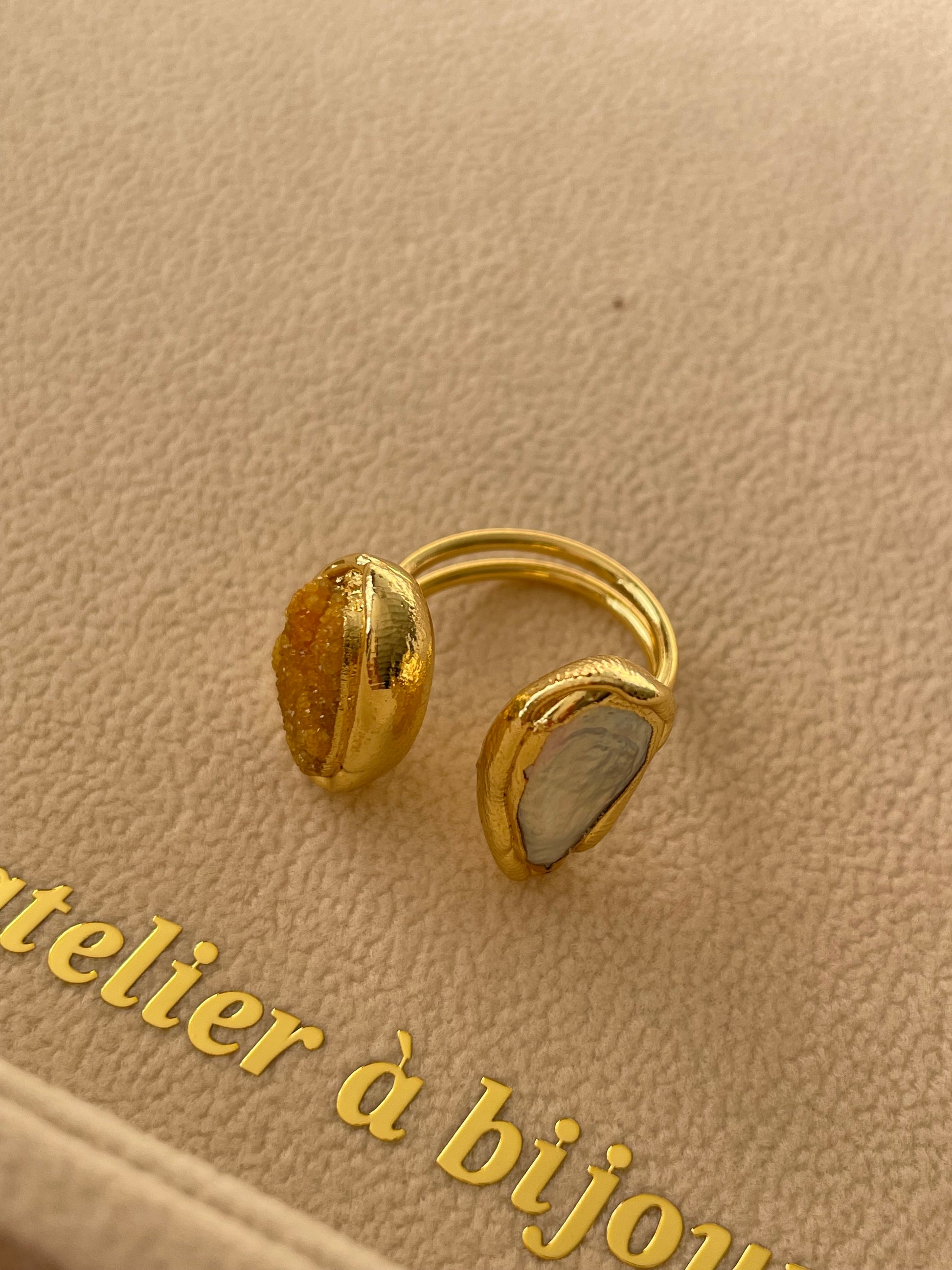 Chiếc nhẫn gây ấn tượng với thiết kế mở hai đầu, kết hợp đá thạch anh vàng lấp lánh và đá tự nhiên trắng ánh ngọc. Sự tương phản giữa hai sắc thái tạo nên một tổng thể hài hòa nhưng đầy cá tính, tôn lên vẻ sang trọng và hiện đại.
