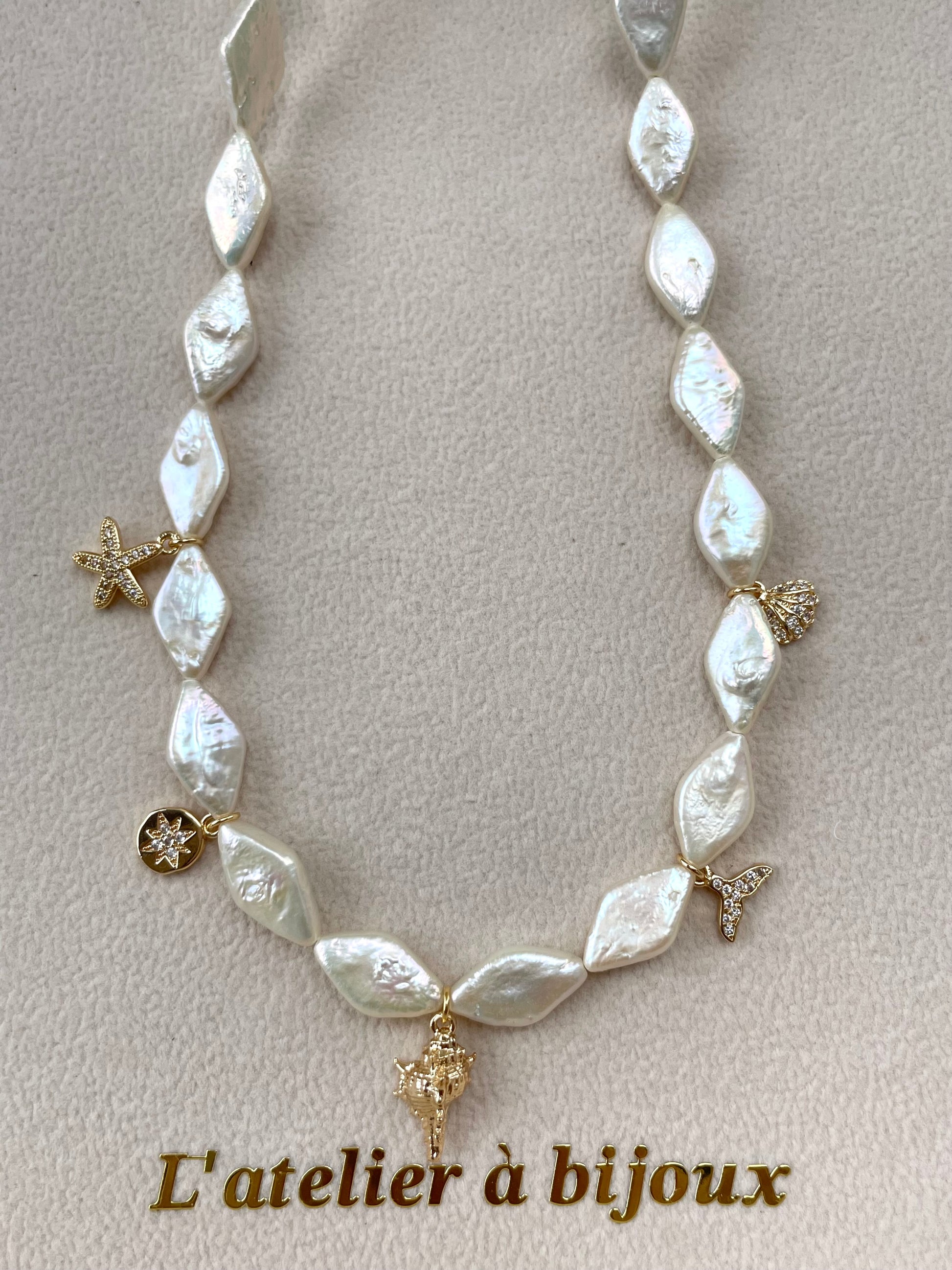 Chiếc vòng cổ ngọc trai lá phối charm đại dương mang thiết kế tinh xảo và đầy cảm hứng từ biển cả. Được chế tác từ những viên ngọc trai nước ngọt cao cấp dáng lá độc đáo, bề mặt ánh xà cừ óng ánh tự nhiên, chiếc vòng cổ toát lên vẻ quý phái và khác biệt.