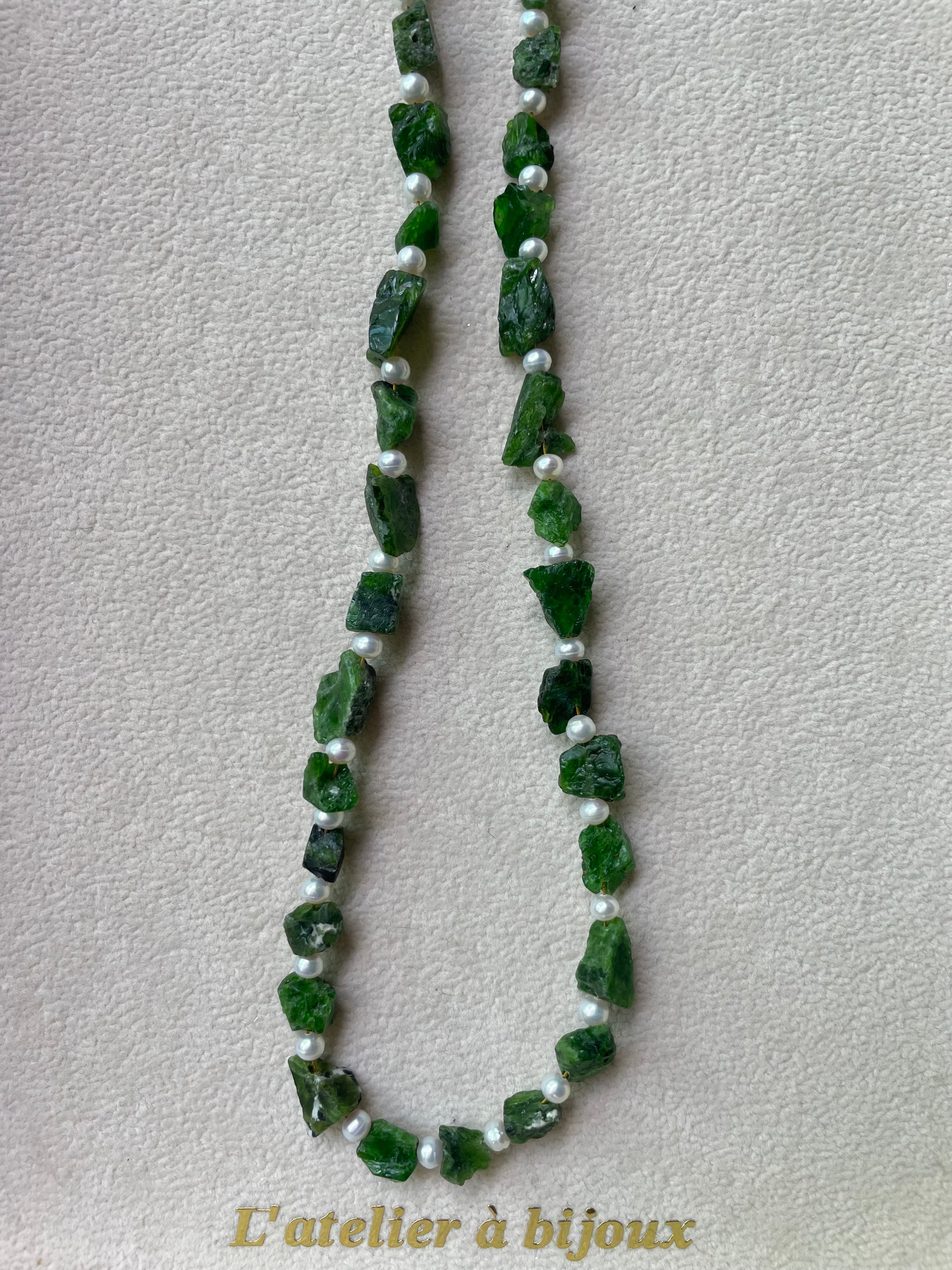 Chiếc vòng cổ này mang vẻ đẹp tươi mới và đầy sức sống với chuỗi đá diopside tự nhiên, được chế tác thành hình khối không đều độc đáo. Mỗi viên đá có sắc xanh rực rỡ, kết hợp cùng các hạt ngọc trai trắng nhỏ tạo nên sự hài hòa và điểm nhấn tinh tế.