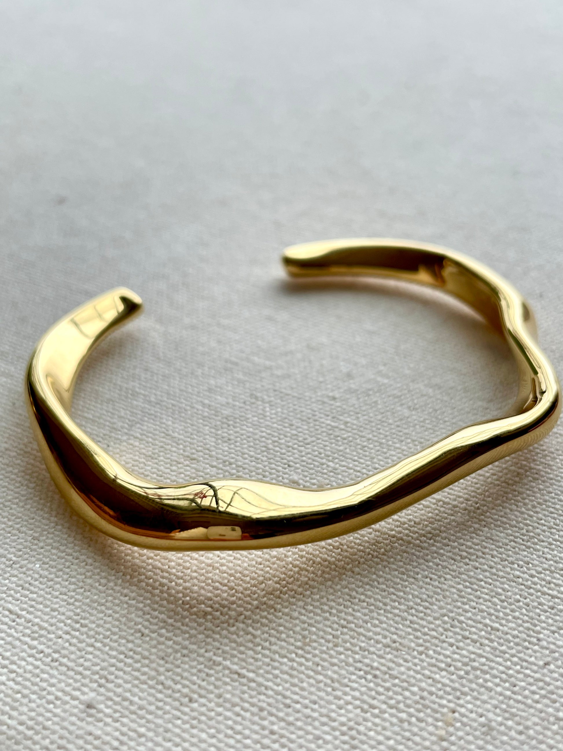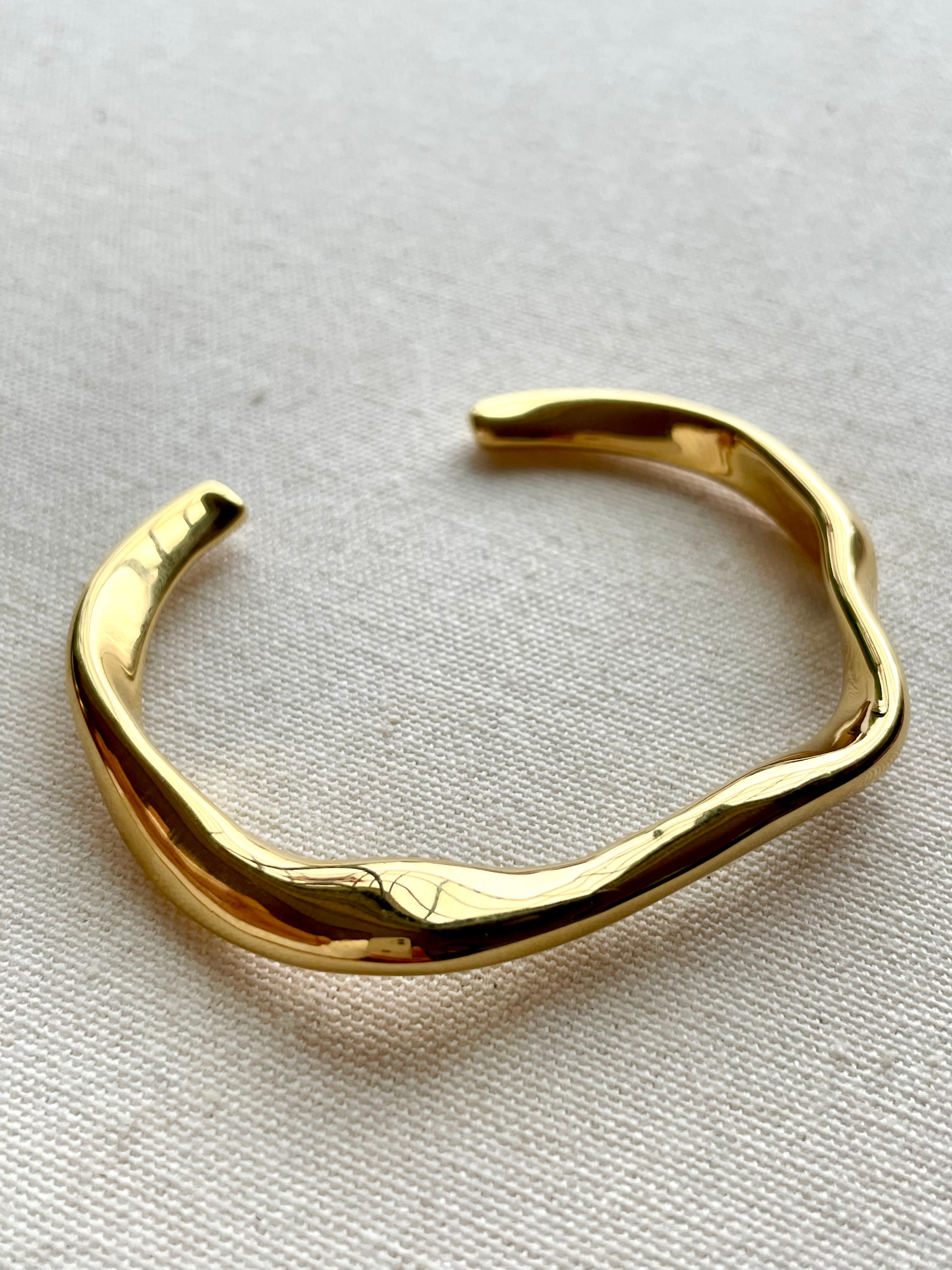 Chiếc lắc tay này mang thiết kế tối giản nhưng đầy tinh tế, với những đường cong tự nhiên mềm mại, tạo nên vẻ đẹp hiện đại và thanh lịch. Được chế tác từ kim loại mạ vàng 18k cao cấp, bề mặt sáng bóng giúp chiếc lắc trở thành điểm nhấn hoàn hảo cho mọi phong cách, từ tối giản tinh gọn đến sang trọng cuốn hút.