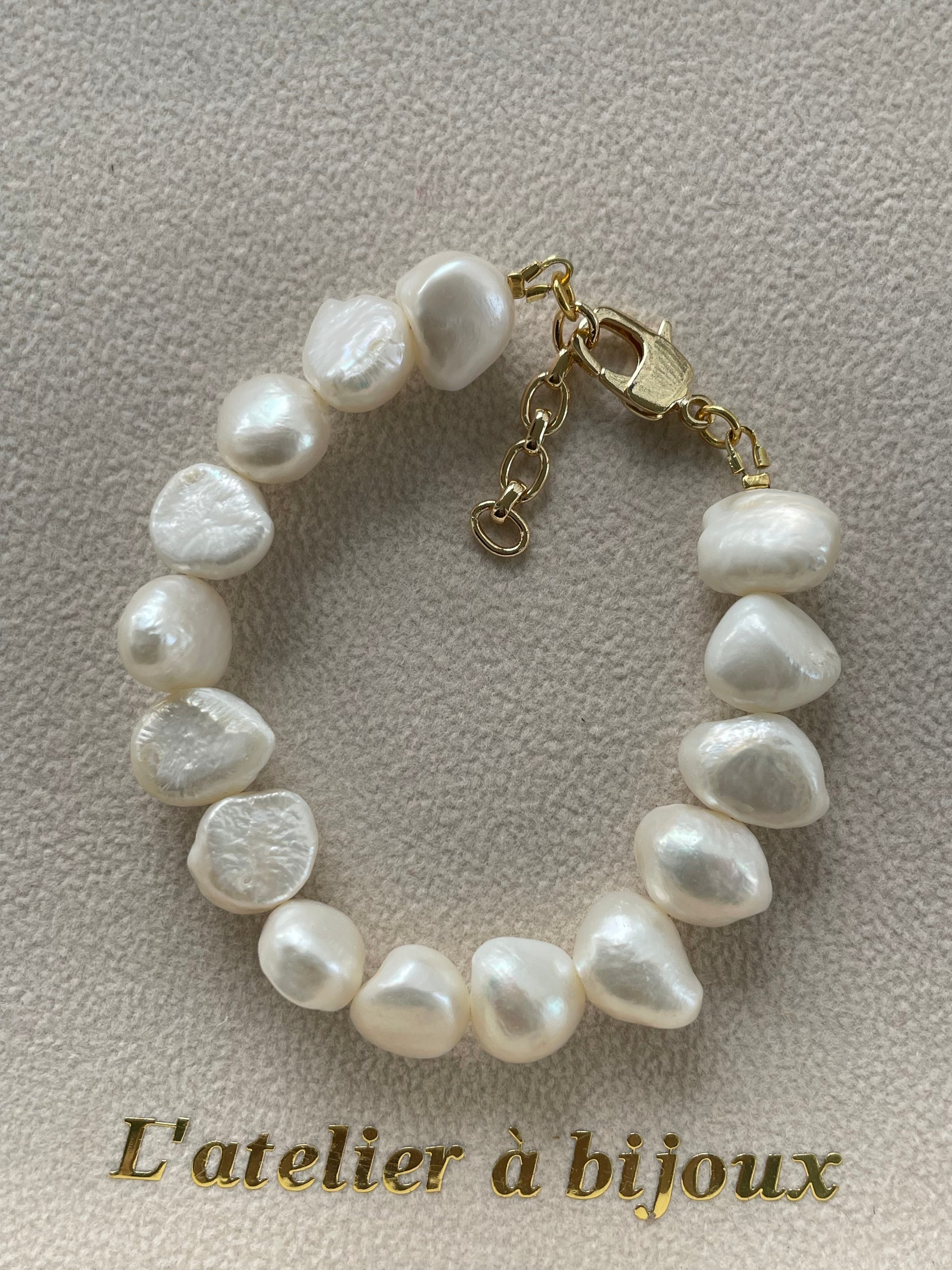 Chiếc vòng tay nổi bật với thiết kế tự nhiên và sang trọng, được tạo nên từ những viên ngọc trai baroque trắng tự nhiên có hình dáng độc đáo, bề mặt óng ánh xà cừ bắt sáng đầy cuốn hút. Phần khóa kim loại mạ vàng cao cấp chắc chắn, kèm theo charm logo thương hiệu tinh xảo, tạo điểm nhấn tinh tế và khẳng định dấu ấn riêng biệt.