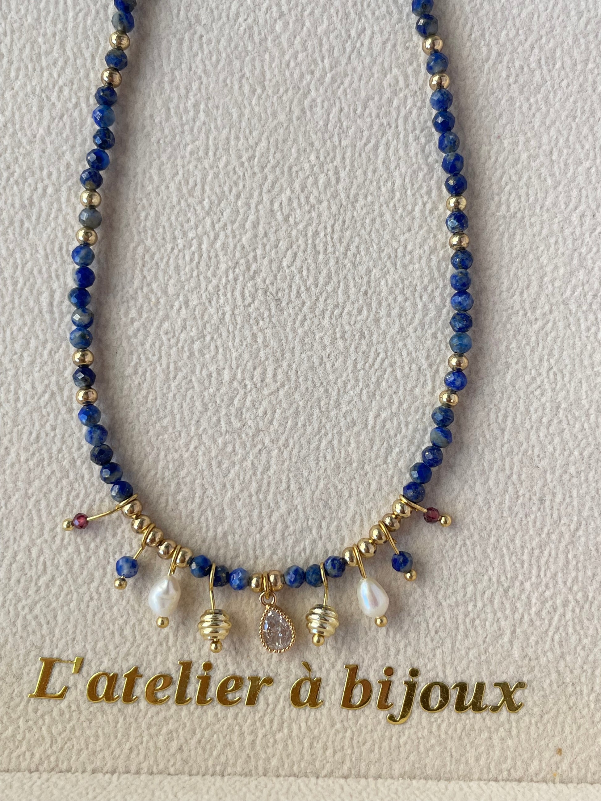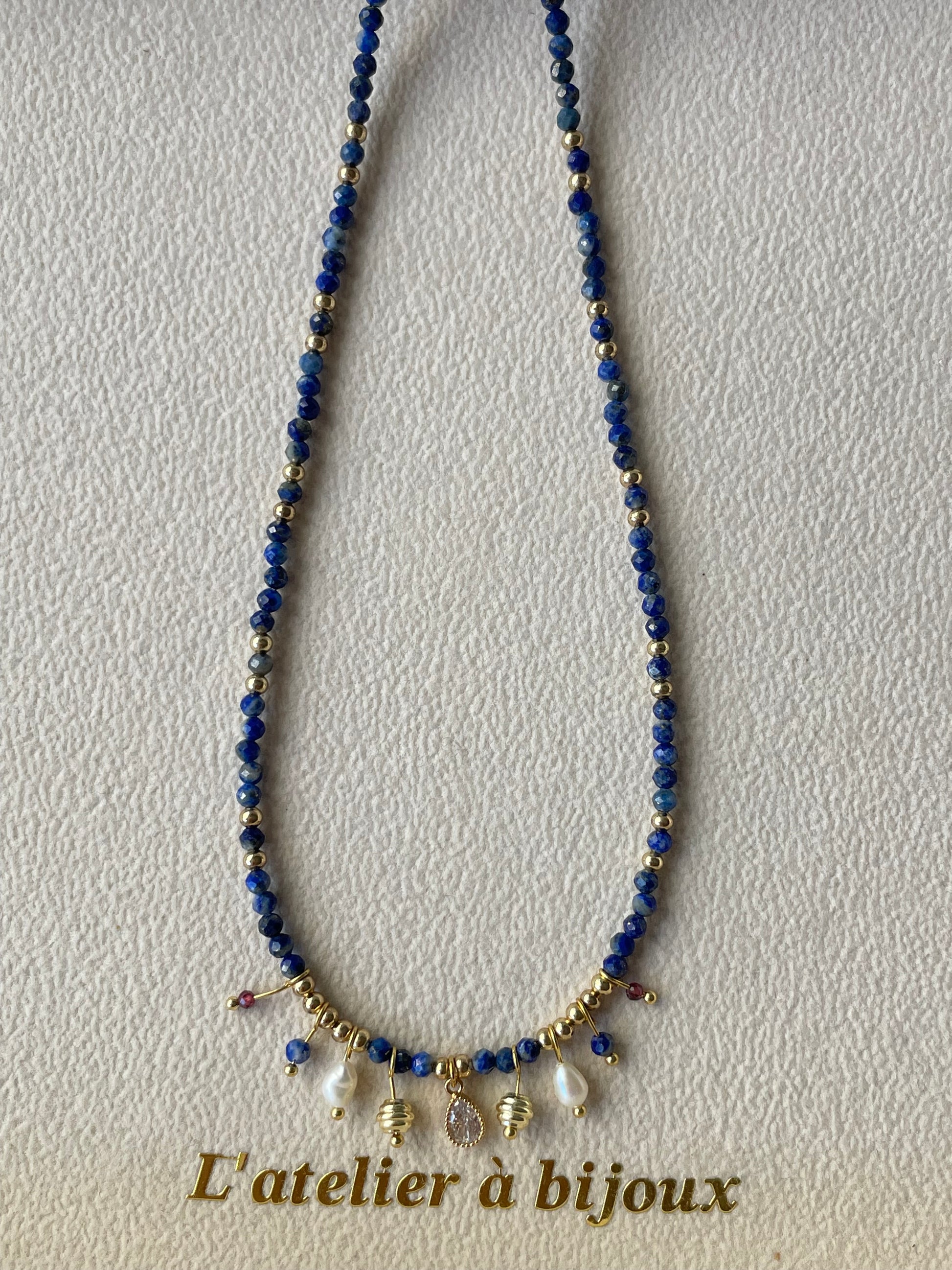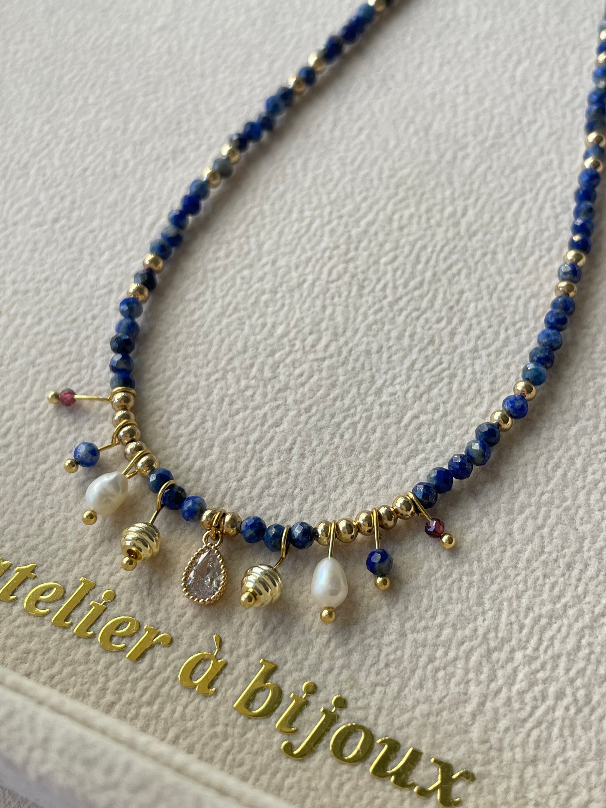 Chiếc vòng cổ đá Lapis Lazuli phối charm ngọc trai & vàng mang đến một thiết kế đầy cảm hứng với sự kết hợp hài hòa giữa đá Lapis Lazuli thiên nhiên sắc xanh sâu thẳm và charm vàng 18k xen kẽ tinh xảo. Từng viên đá được cắt facet tỉ mỉ, bắt sáng lung linh, tôn lên chiều sâu cuốn hút của màu xanh navy đặc trưng.