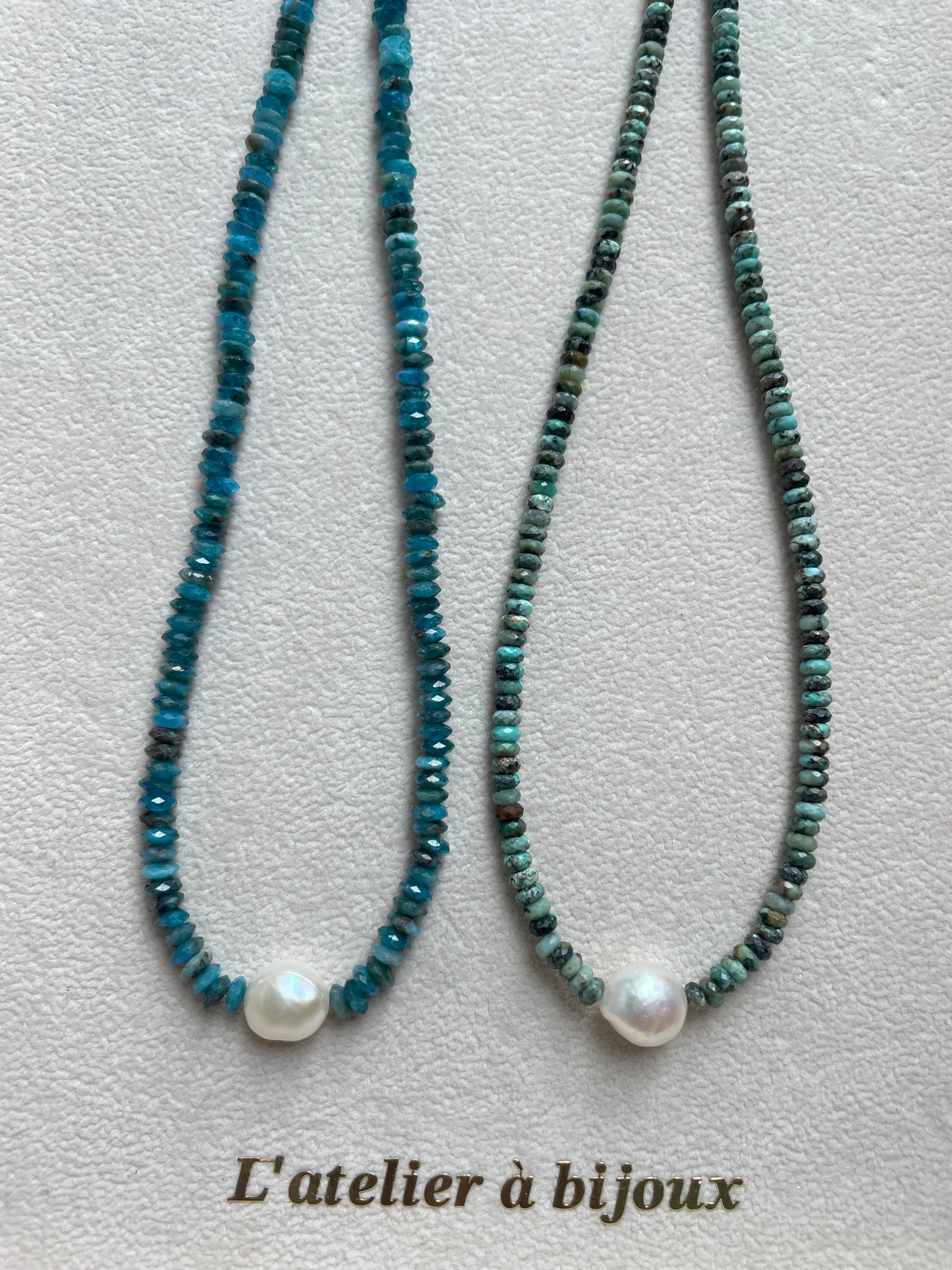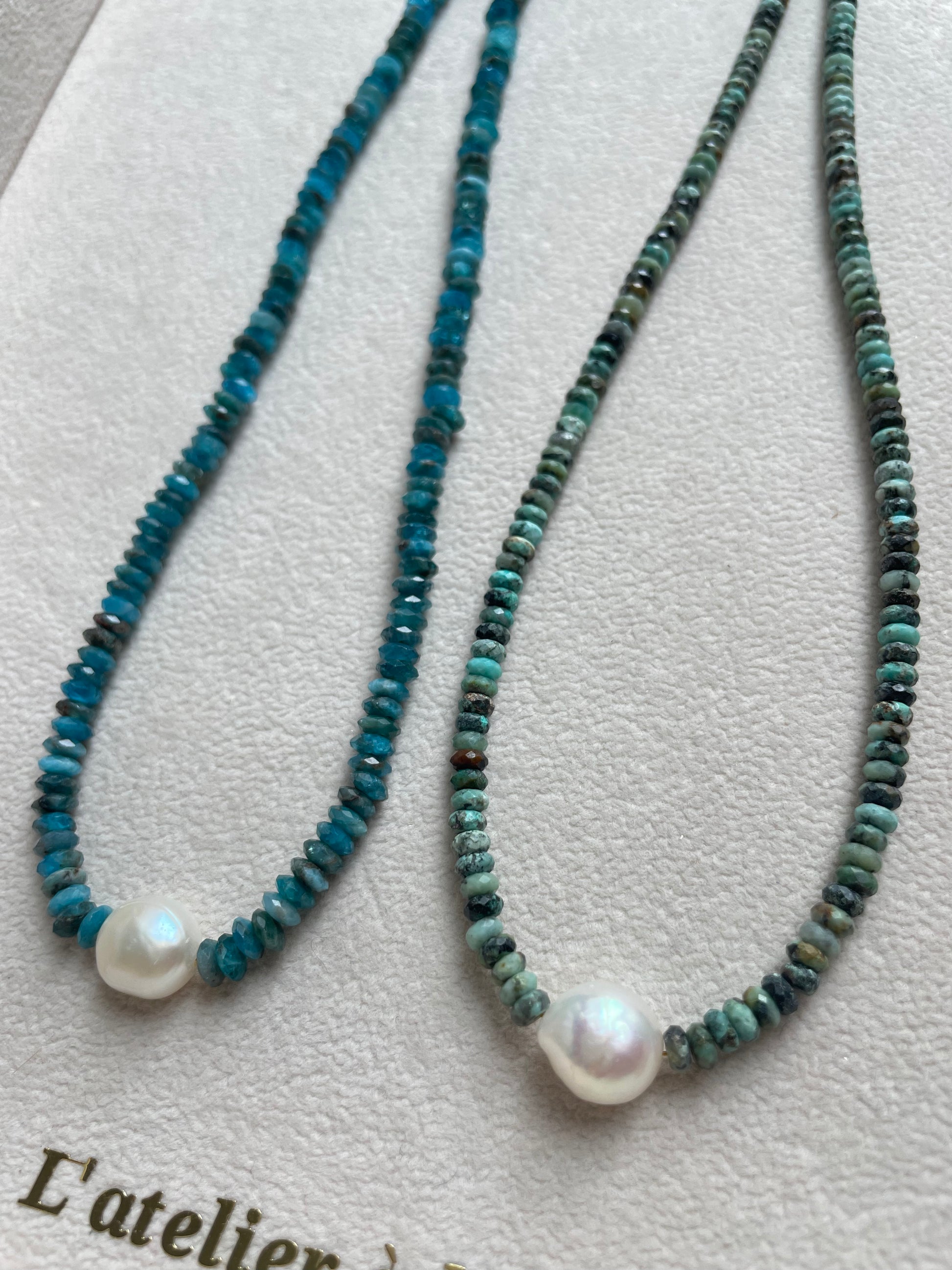 Chiếc vòng cổ mang hơi thở tươi mới của thiên nhiên, được chế tác từ chuỗi đá quý cắt giác với sắc xanh biển và xanh rêu độc đáo. Ở chính giữa, một viên ngọc trai nước ngọt dáng tròn tự nhiên được đặt làm điểm nhấn, tạo sự cân bằng hài hòa giữa vẻ lấp lánh hiện đại của đá và nét tinh khôi cổ điển của ngọc trai.