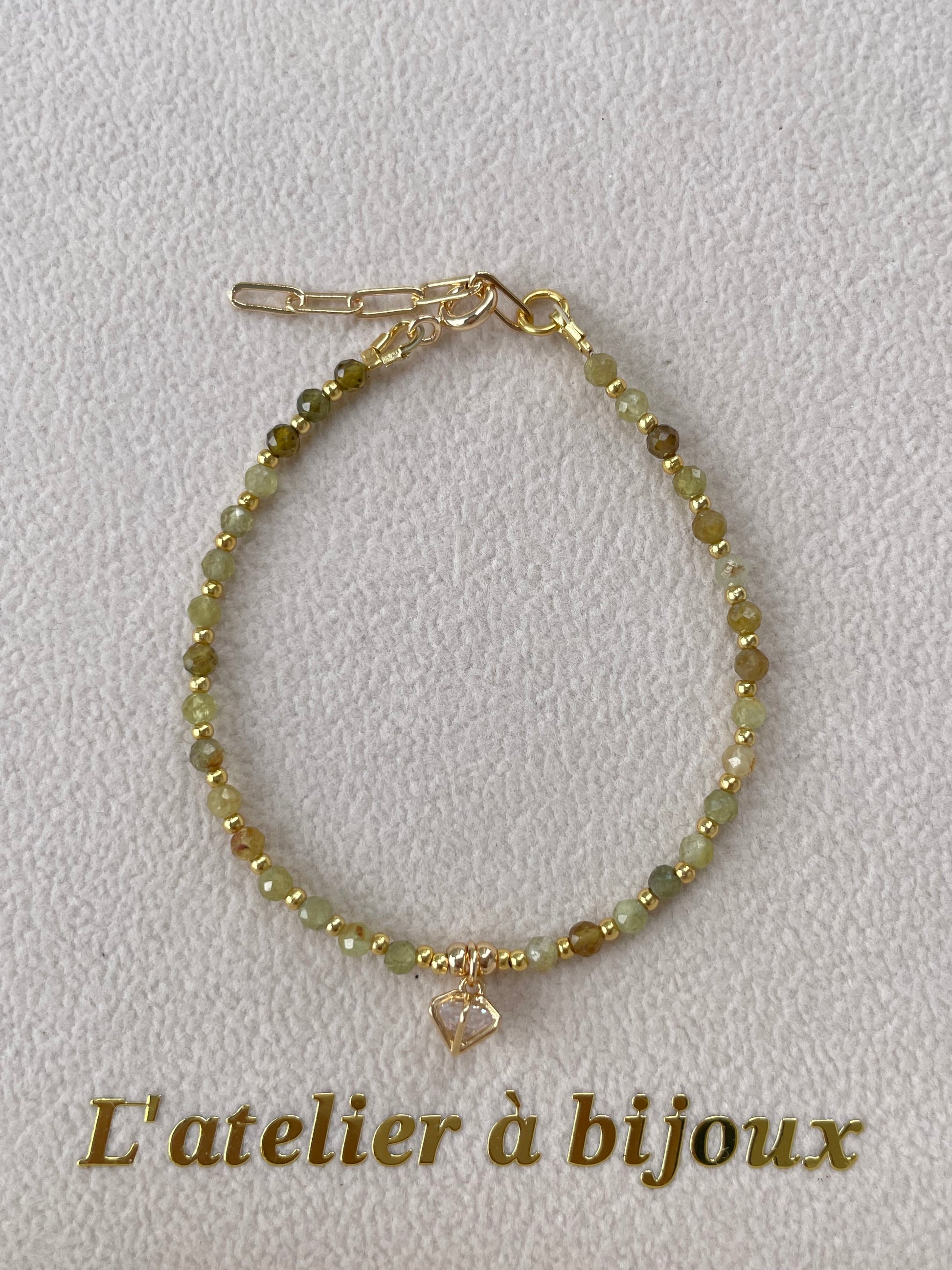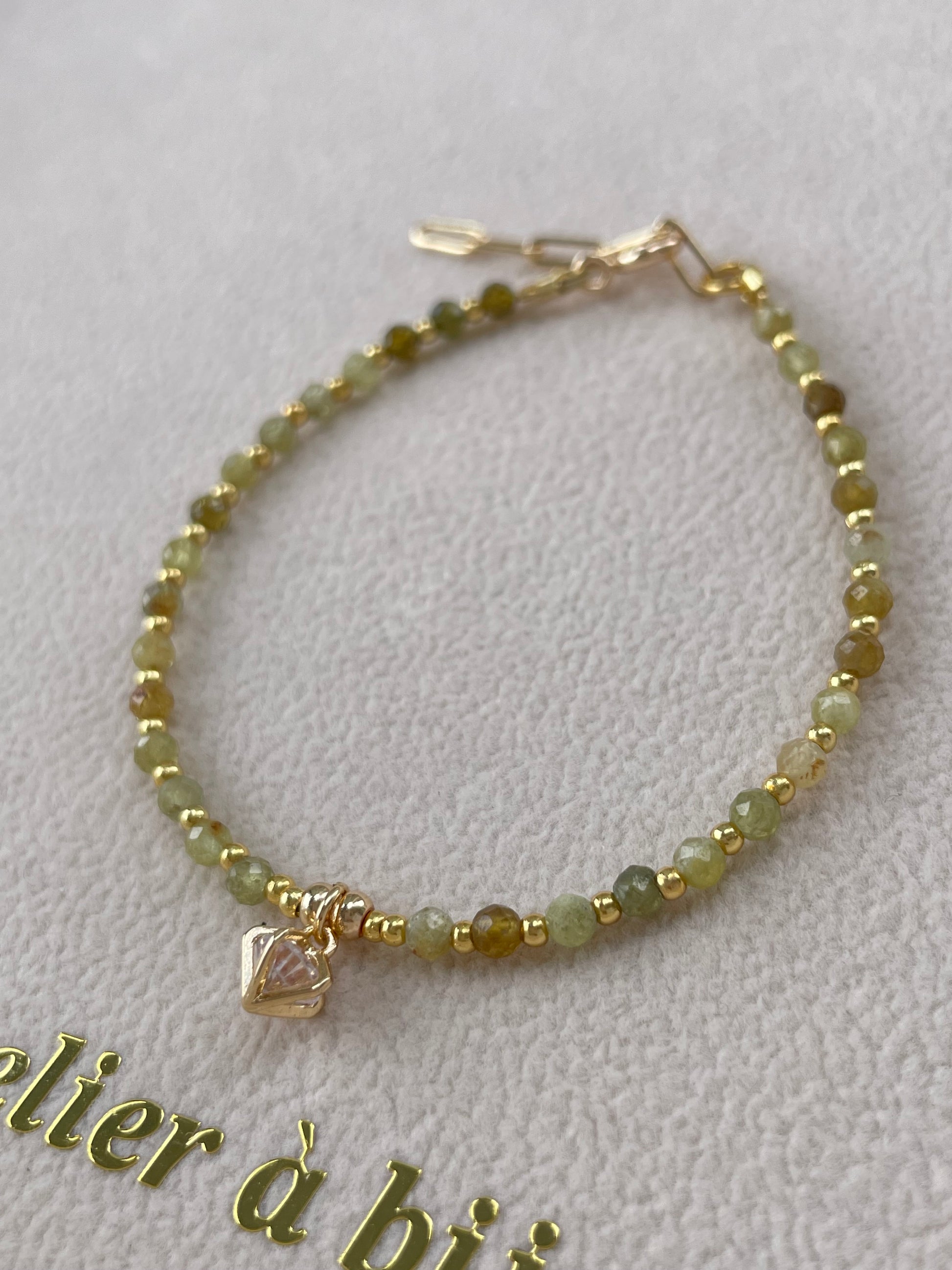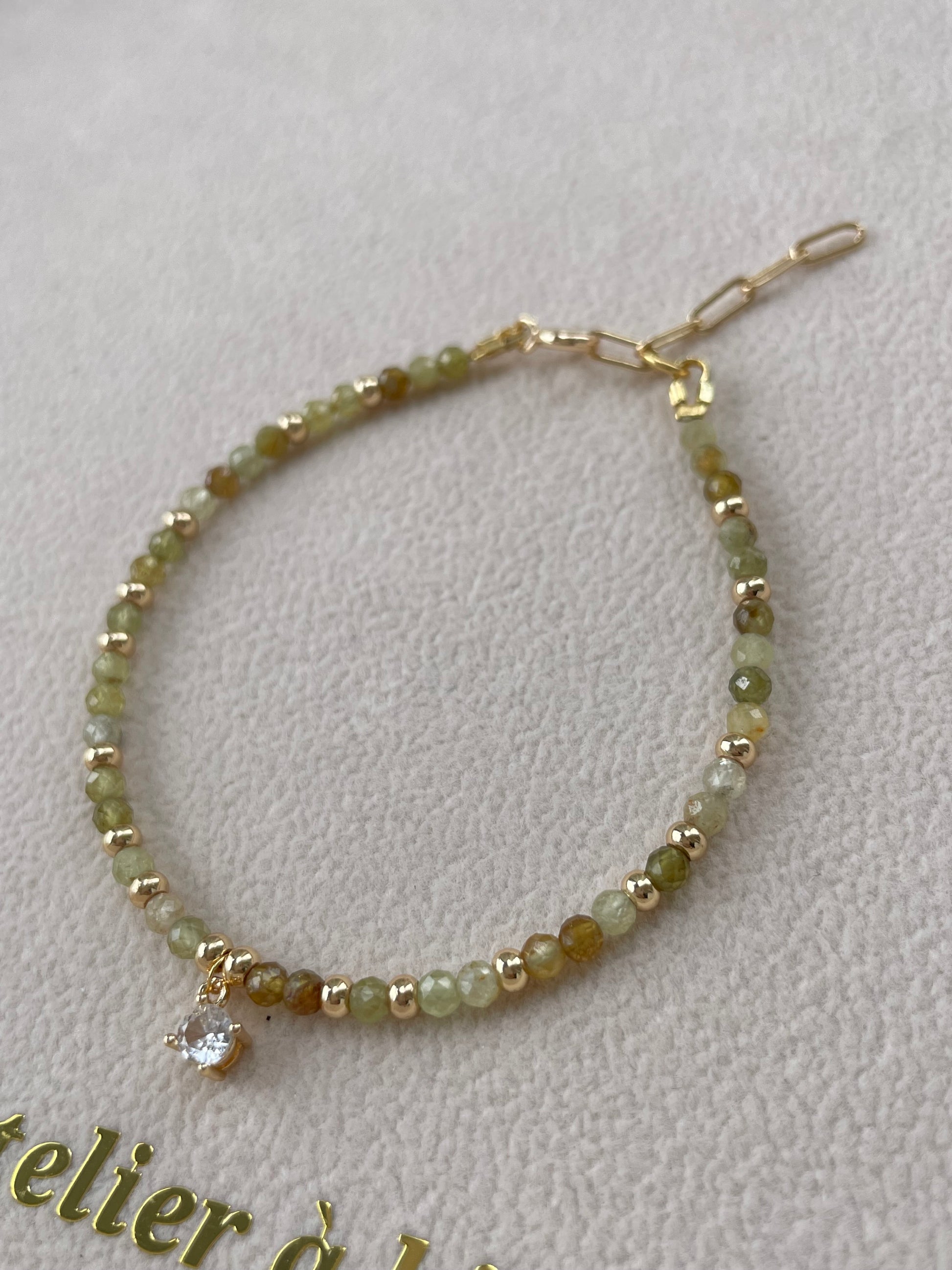 Chiếc vòng tay nổi bật với thiết kế tinh tế, kết hợp hạt đá xanh olive cắt facet lấp lánh xen kẽ cùng hạt kim loại mạ vàng sang trọng. Điểm nhấn nằm ở charm đá zircon trong suốt tỏa sáng tinh khôi, kết hợp cùng charm logo thương hiệu được gắn tinh xảo, mang lại vẻ hiện đại và cao cấp cho thiết kế.