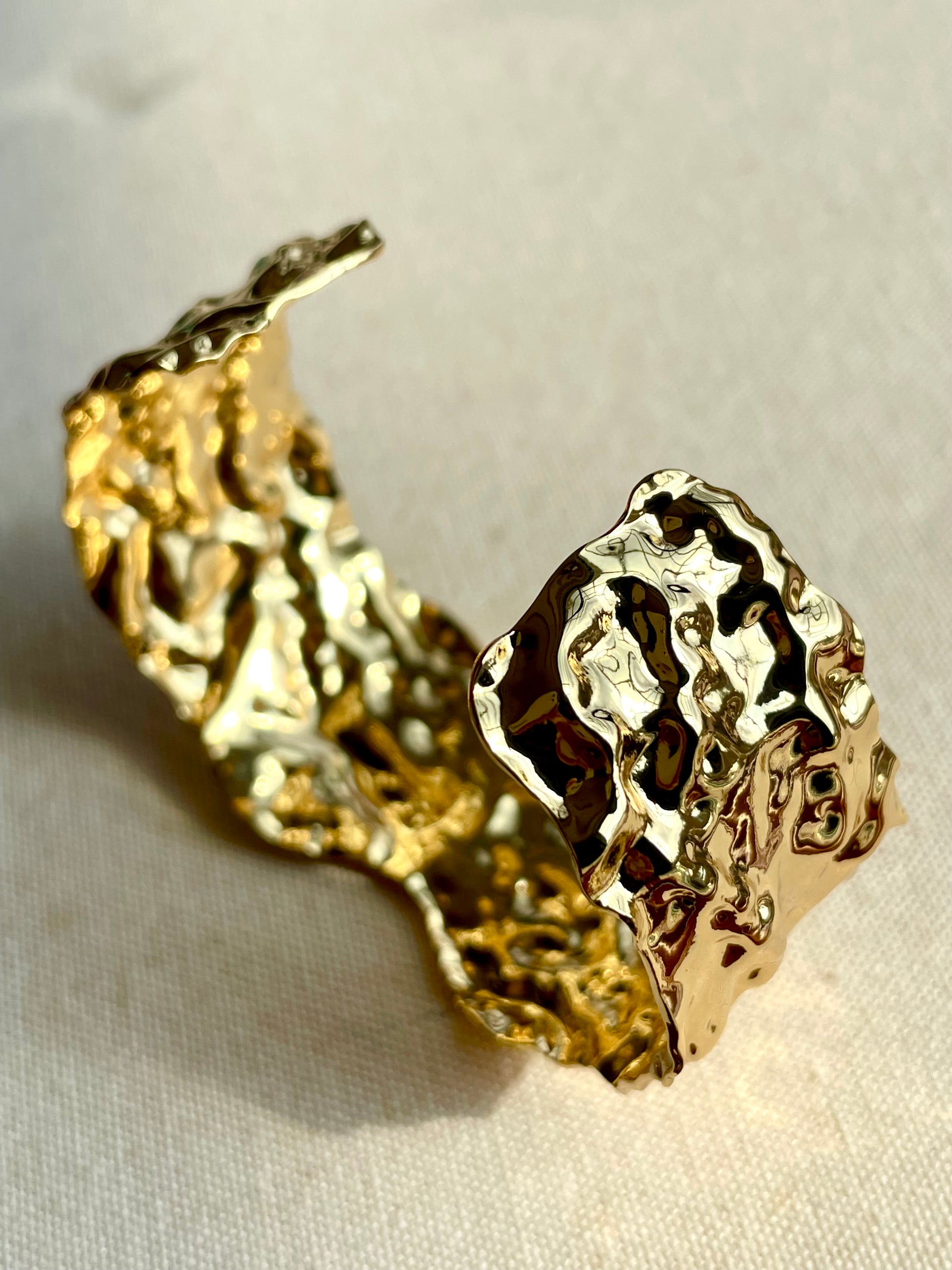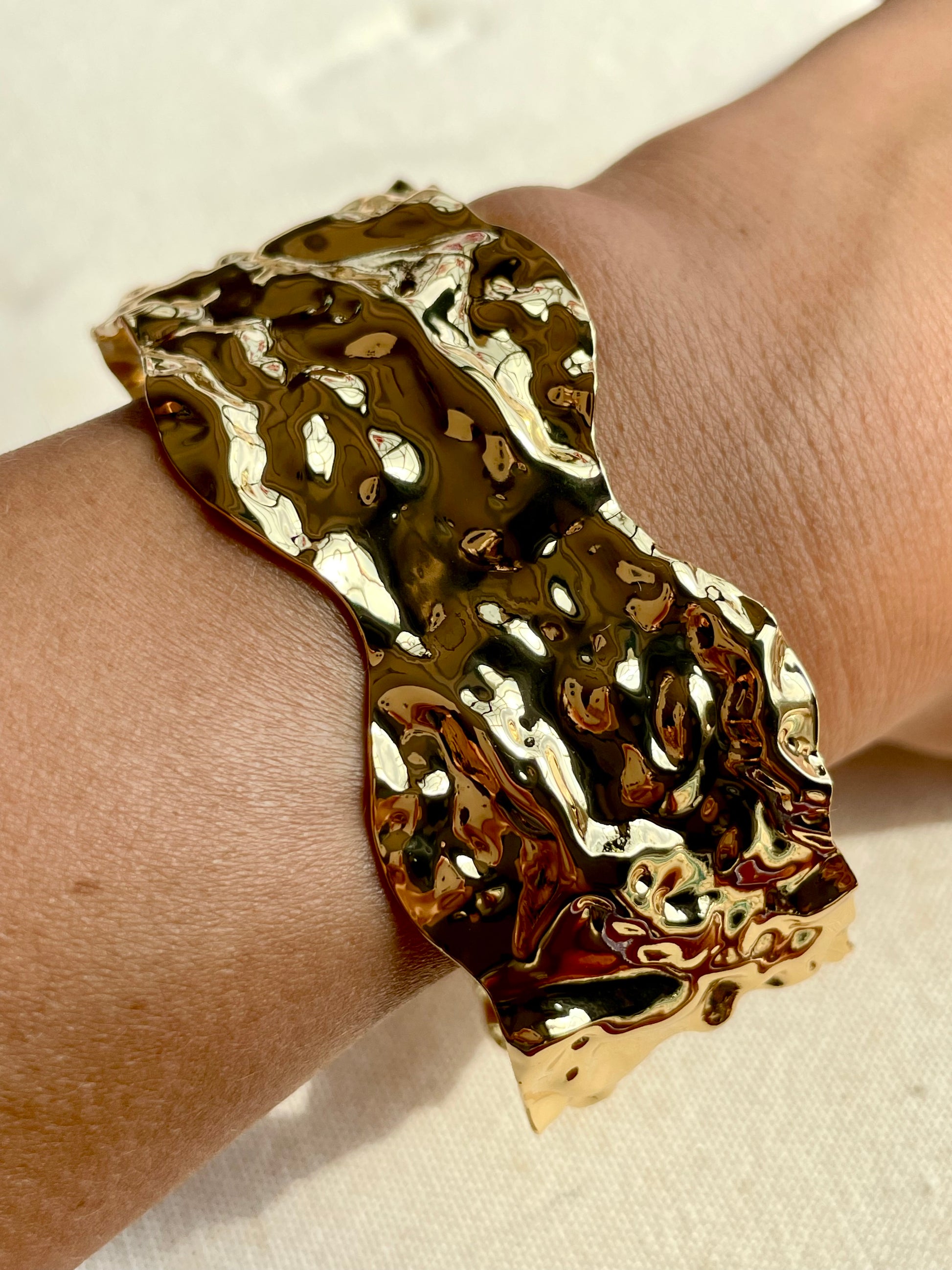 Chiếc lắc tay này gây ấn tượng với thiết kế bản rộng độc đáo, lấy cảm hứng từ những đường vân tự nhiên mềm mại, tạo nên vẻ đẹp phóng khoáng và nghệ thuật. Được chế tác từ kim loại mạ vàng 18k cao cấp, bề mặt sáng bóng với hiệu ứng phản chiếu bắt mắt giúp chiếc lắc trở thành điểm nhấn nổi bật, tôn lên phong cách thời thượng và cá tính của người đeo.