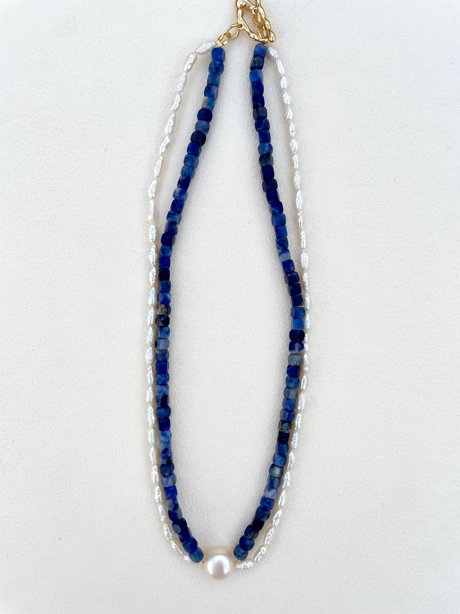 Chiếc vòng cổ Blue Vein Pearl mang vẻ đẹp tinh tế và sang trọng với sự kết hợp hài hòa giữa đá Blue-vein tự nhiên và ngọc trai nước ngọt cao cấp. Sắc xanh sâu của đá Blue-vein cùng ánh óng ánh của ngọc trai tạo nên một thiết kế thanh lịch nhưng đầy cuốn hút, lý tưởng để nâng tầm phong cách trong mọi dịp.