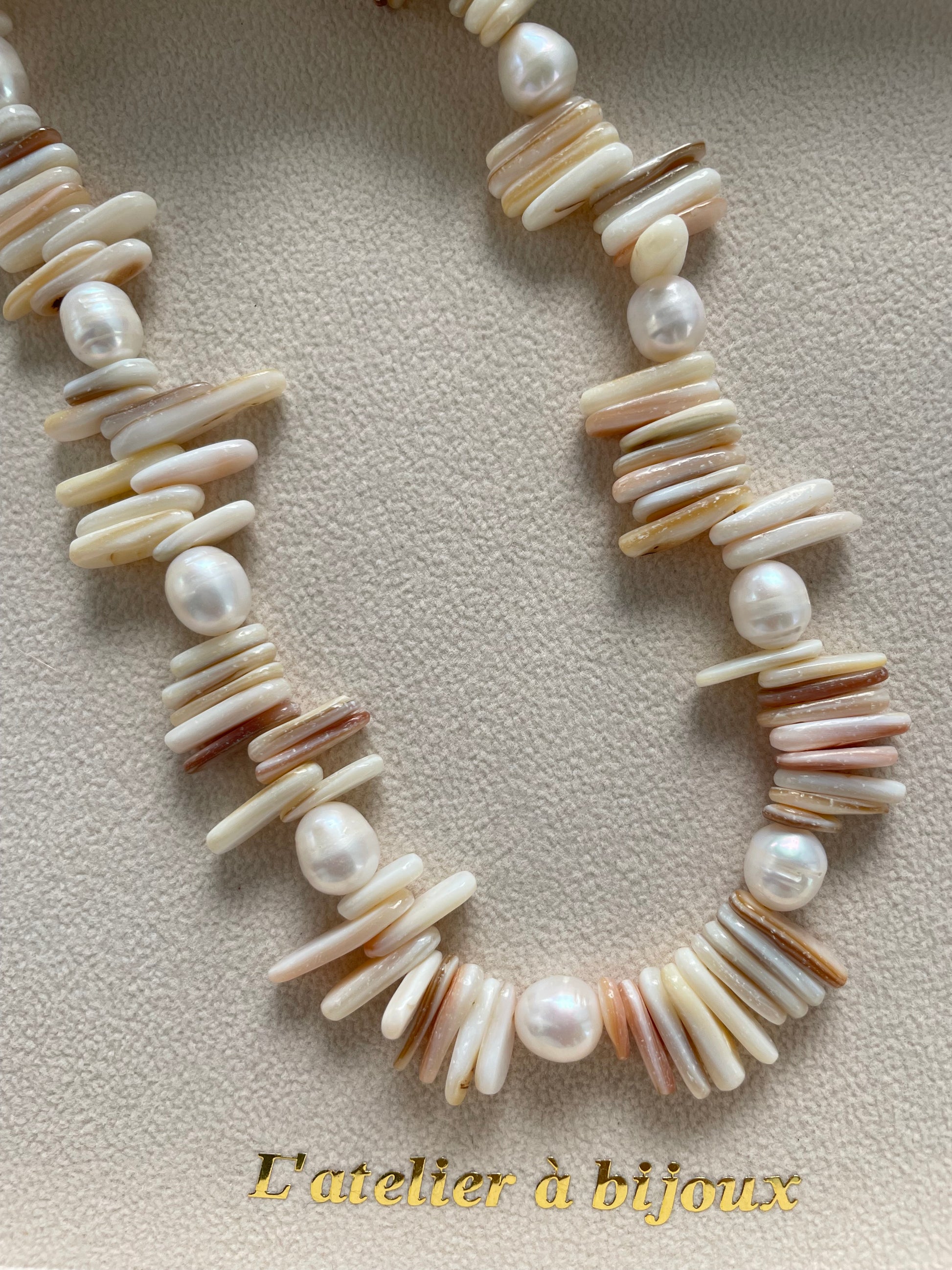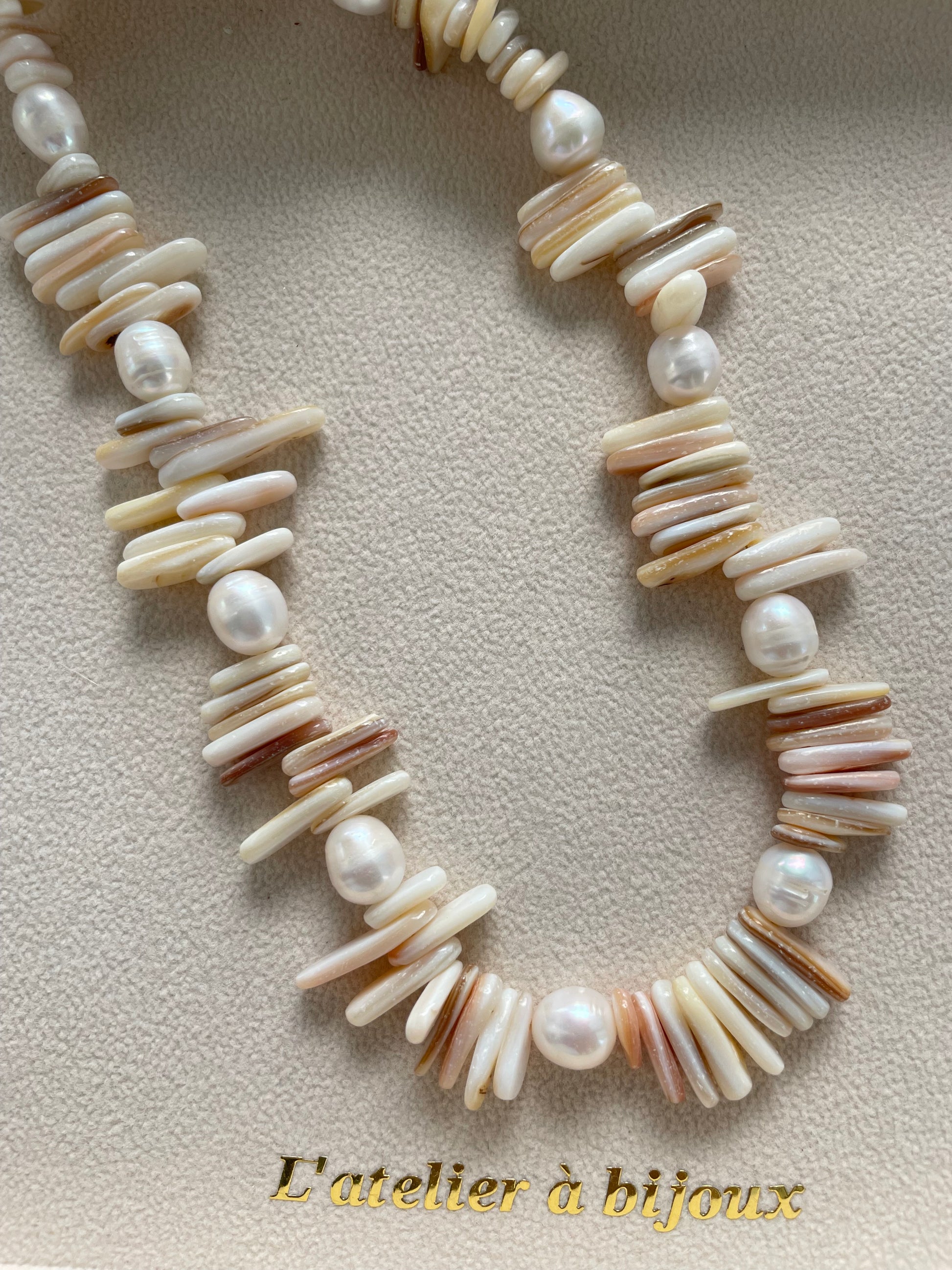 Chiếc vòng cổ vỏ sò phối ngọc trai mang thiết kế độc đáo và đầy cảm hứng từ thiên nhiên, kết hợp giữa những mảnh vỏ sò tự nhiên với sắc hồng kem nhạt hài hòa và ngọc trai nước ngọt cao cấp trắng ngọc. Sự xen kẽ tinh tế giữa các chất liệu tạo nên một tổng thể hài hòa nhưng nổi bật, mang đậm tinh thần boho-chic hiện đại.