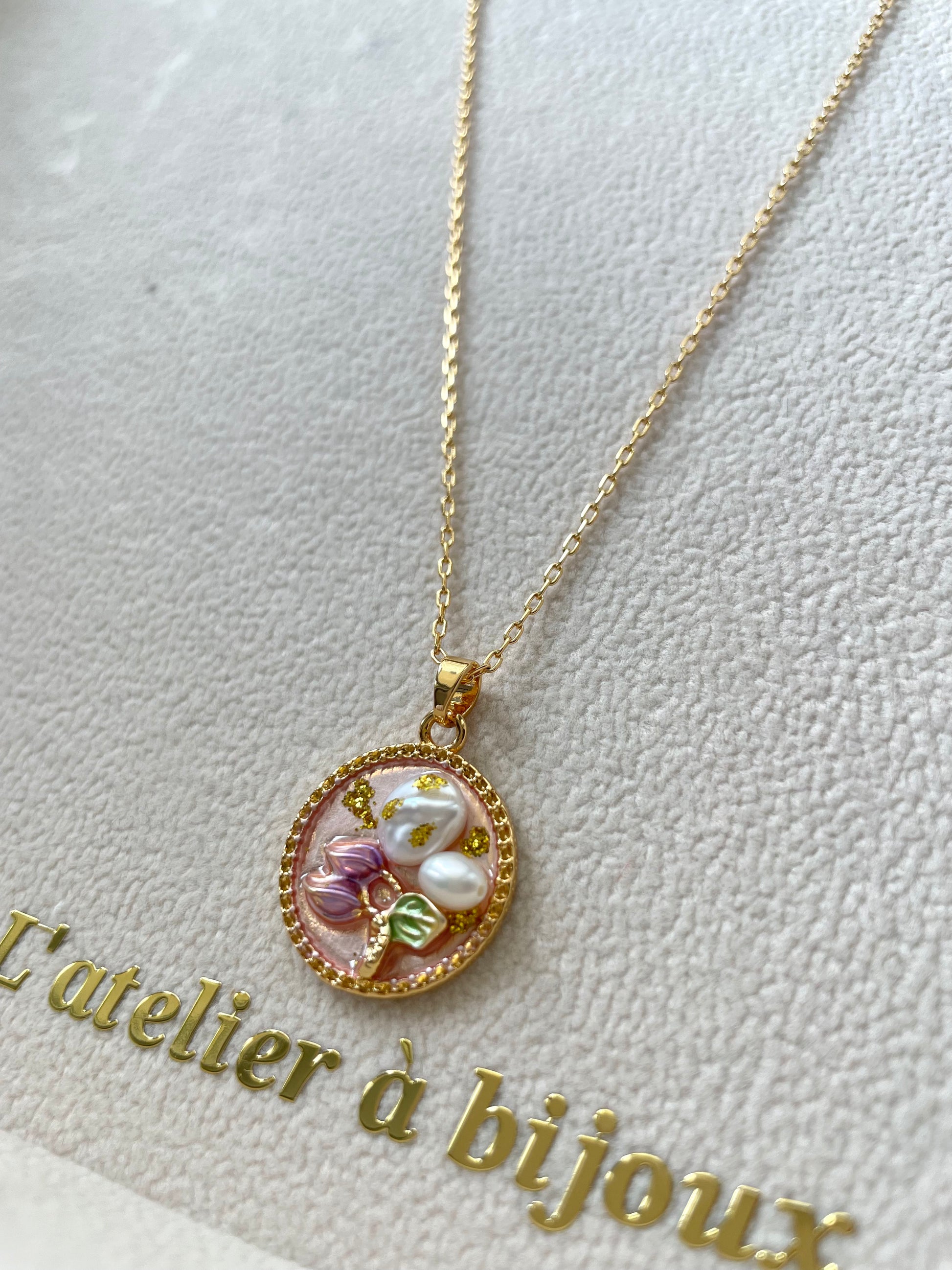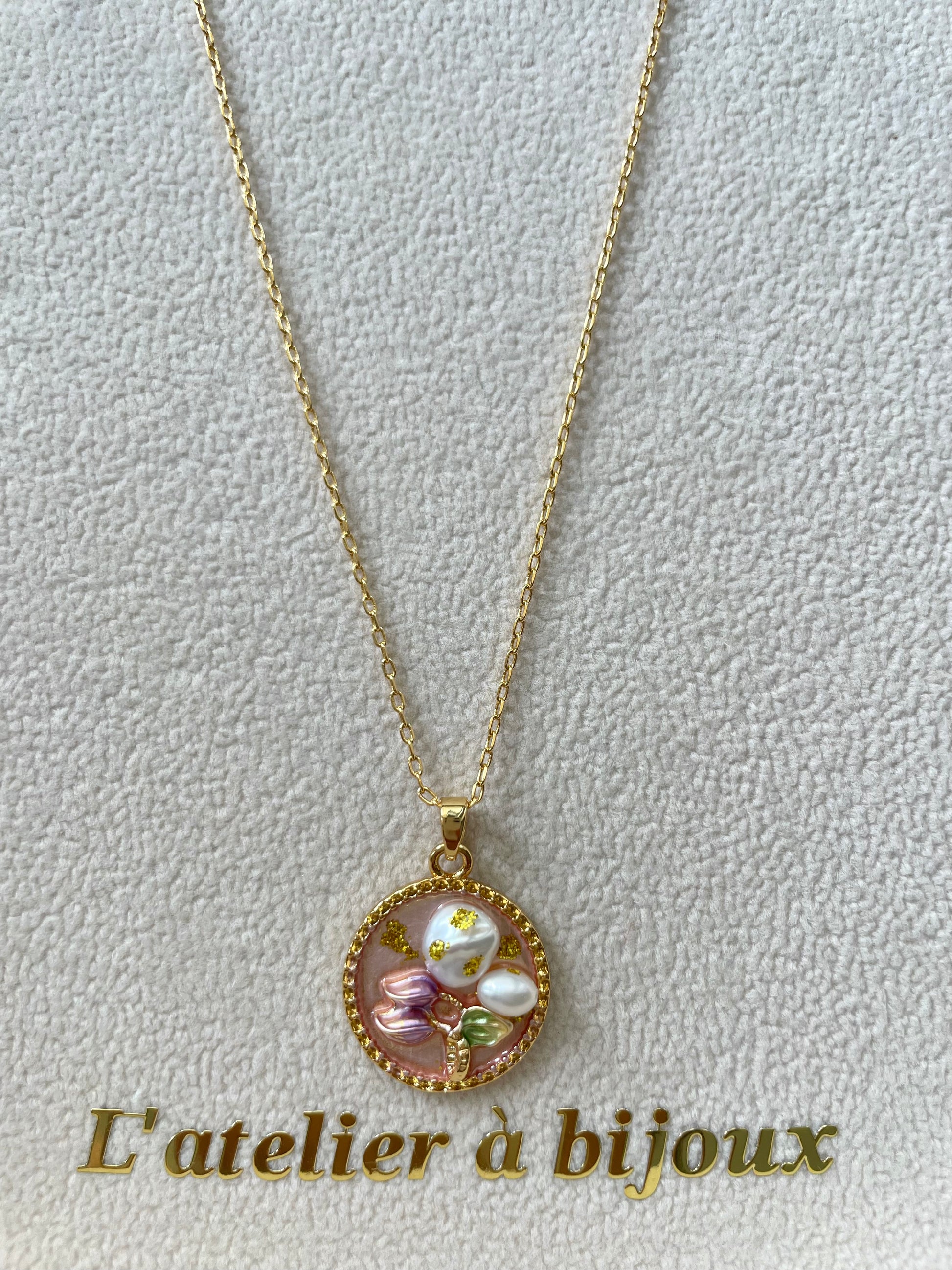Chiếc vòng cổ mặt hoa phối ngọc trai đa sắc là một thiết kế đầy nghệ thuật và nữ tính, được chế tác tinh xảo từ những viên ngọc trai nước ngọt với sắc trắng, hồng và ánh champagne dịu dàng. Mặt dây chuyền hình tròn viền hạt được thiết kế tỉ mỉ, điểm xuyết những cánh hoa nhỏ cùng chi tiết hoa lá thanh thoát, tạo nên tổng thể vừa tinh khôi vừa sang trọng.