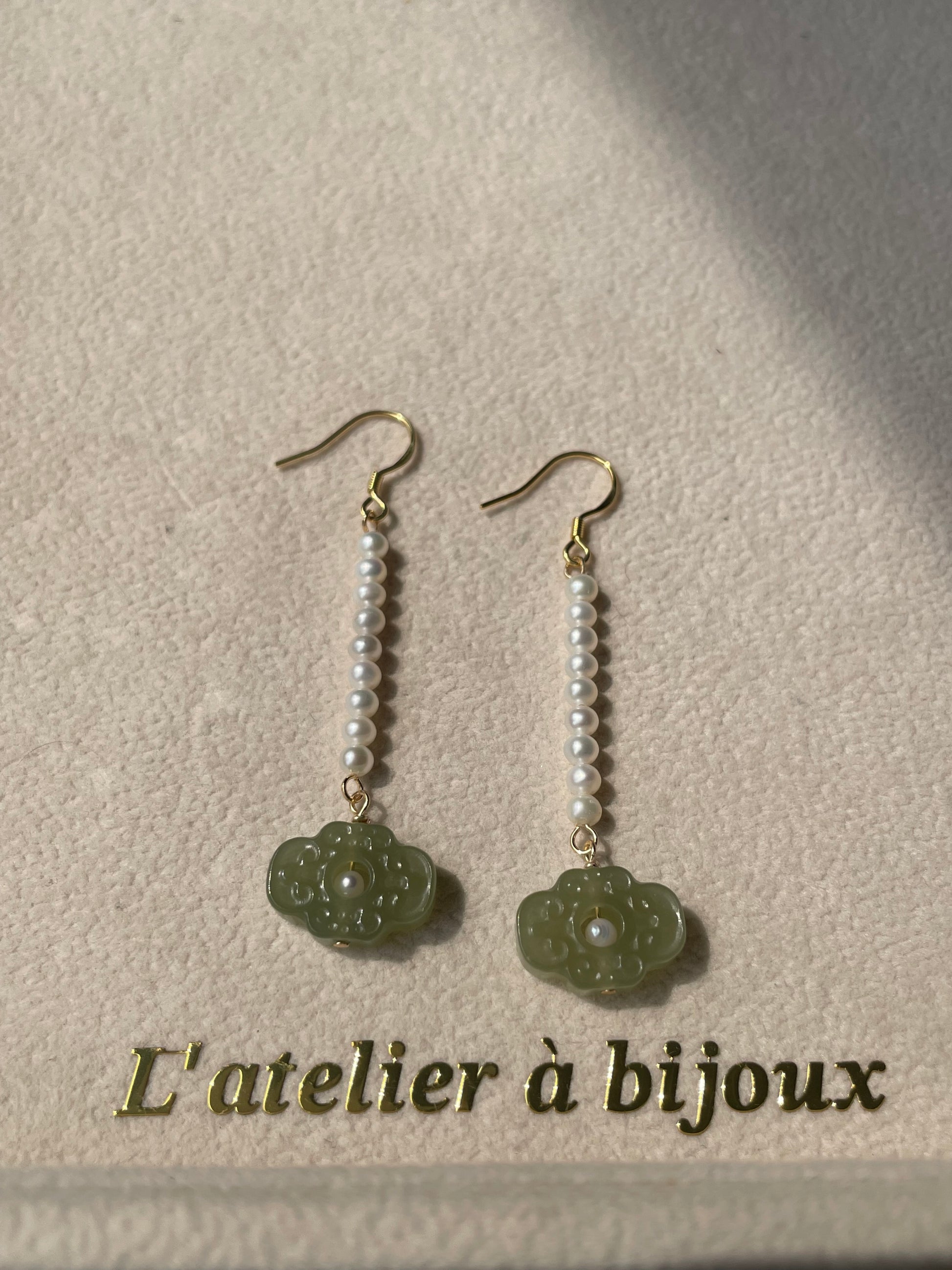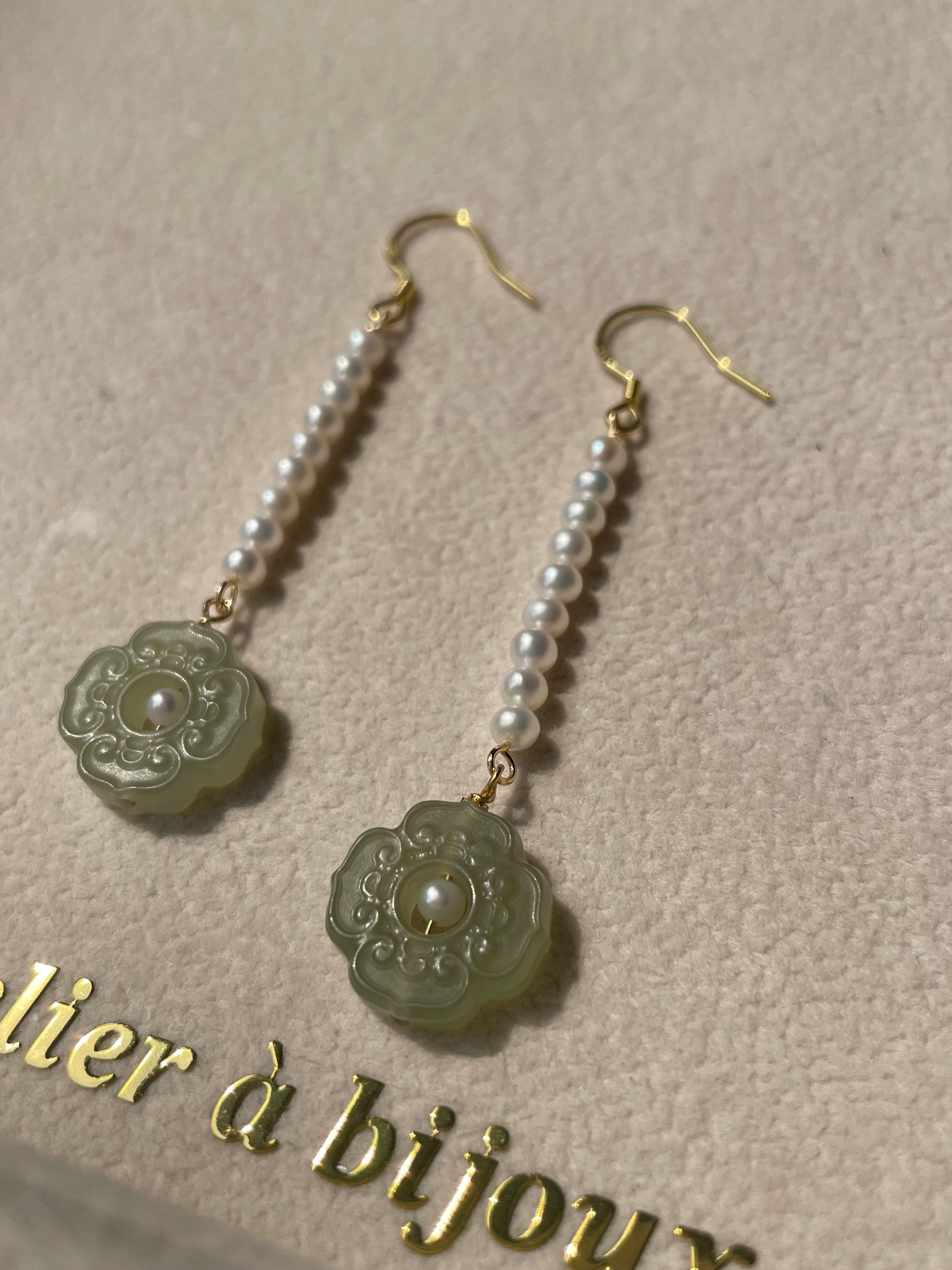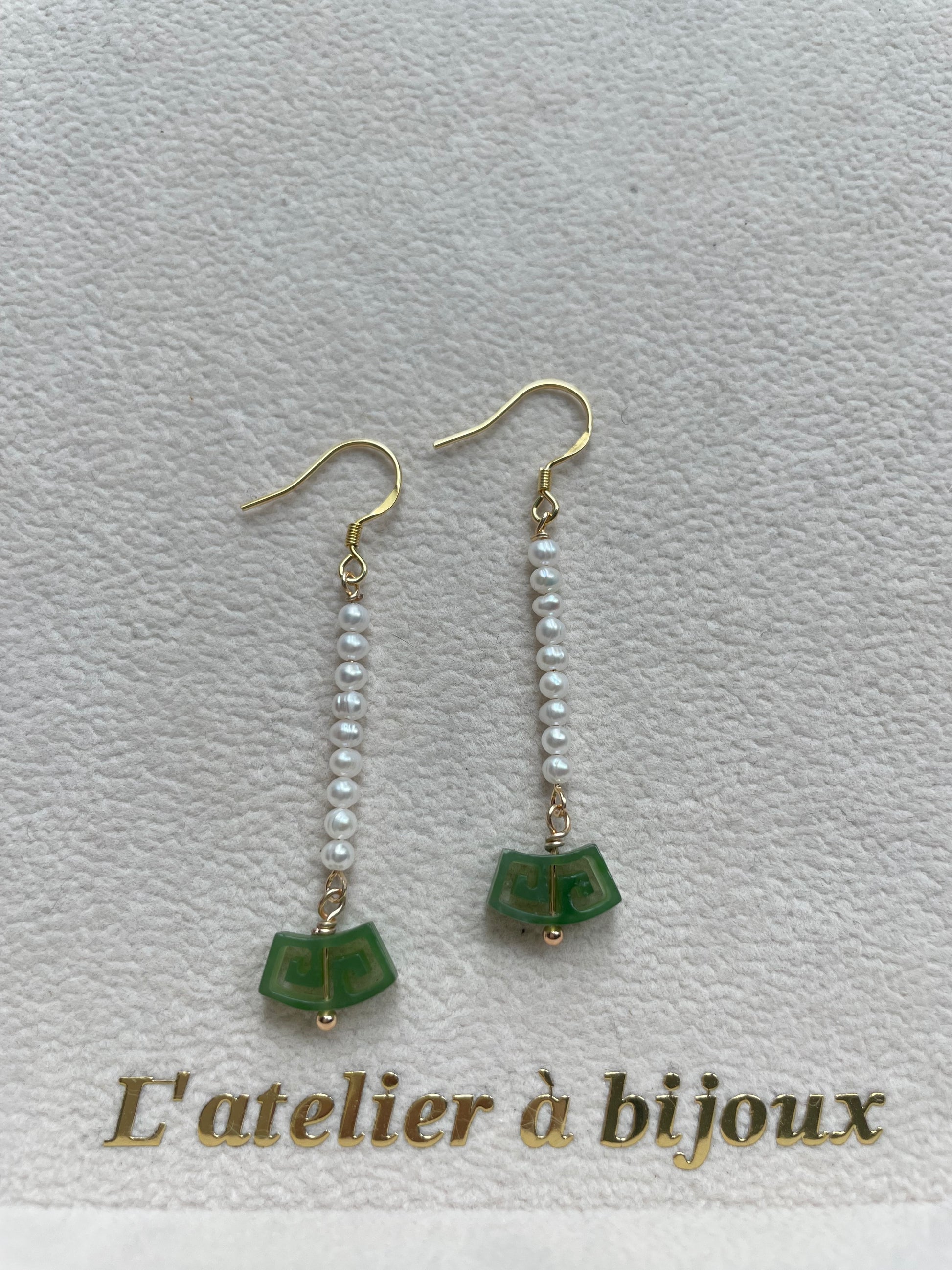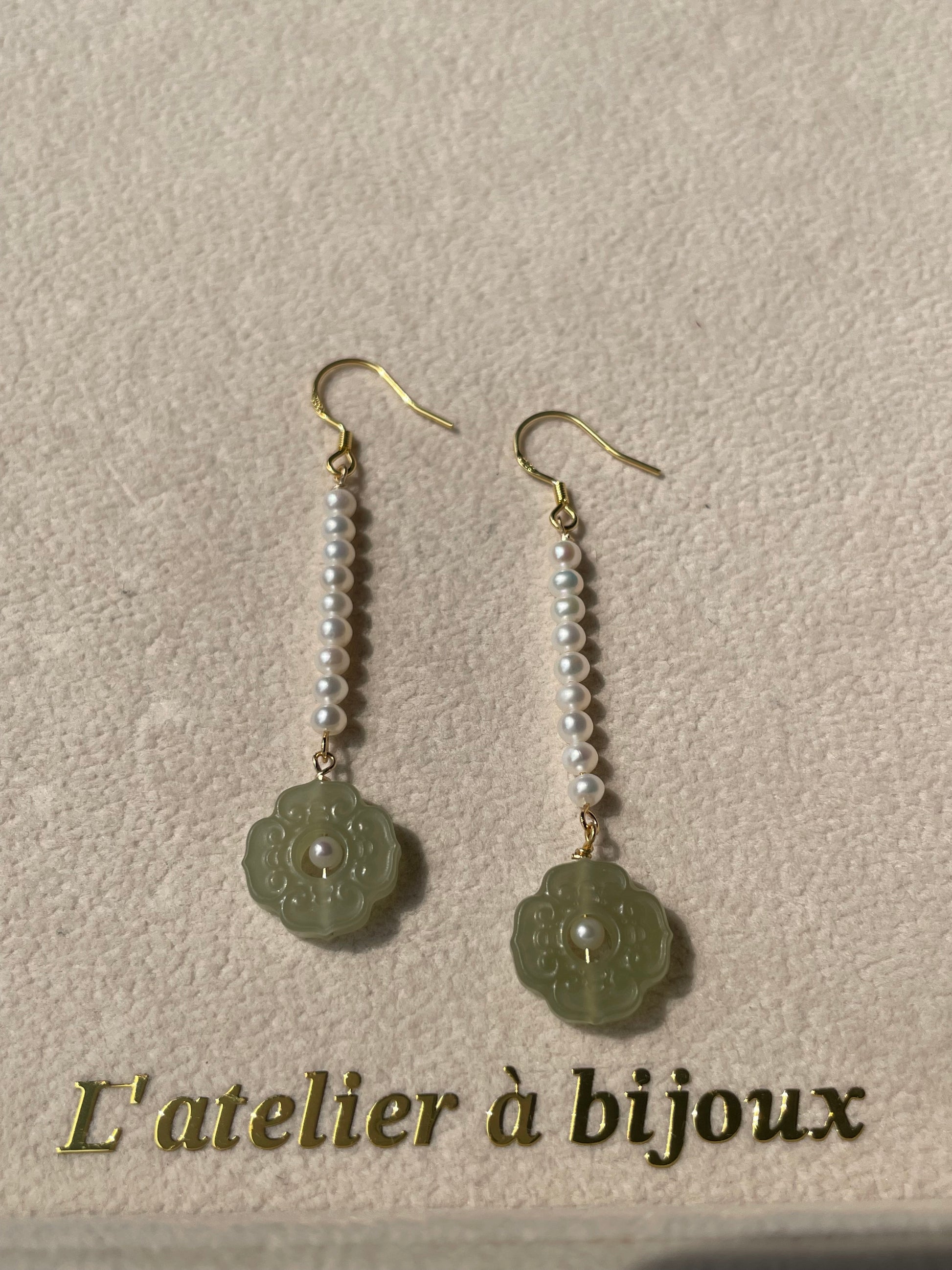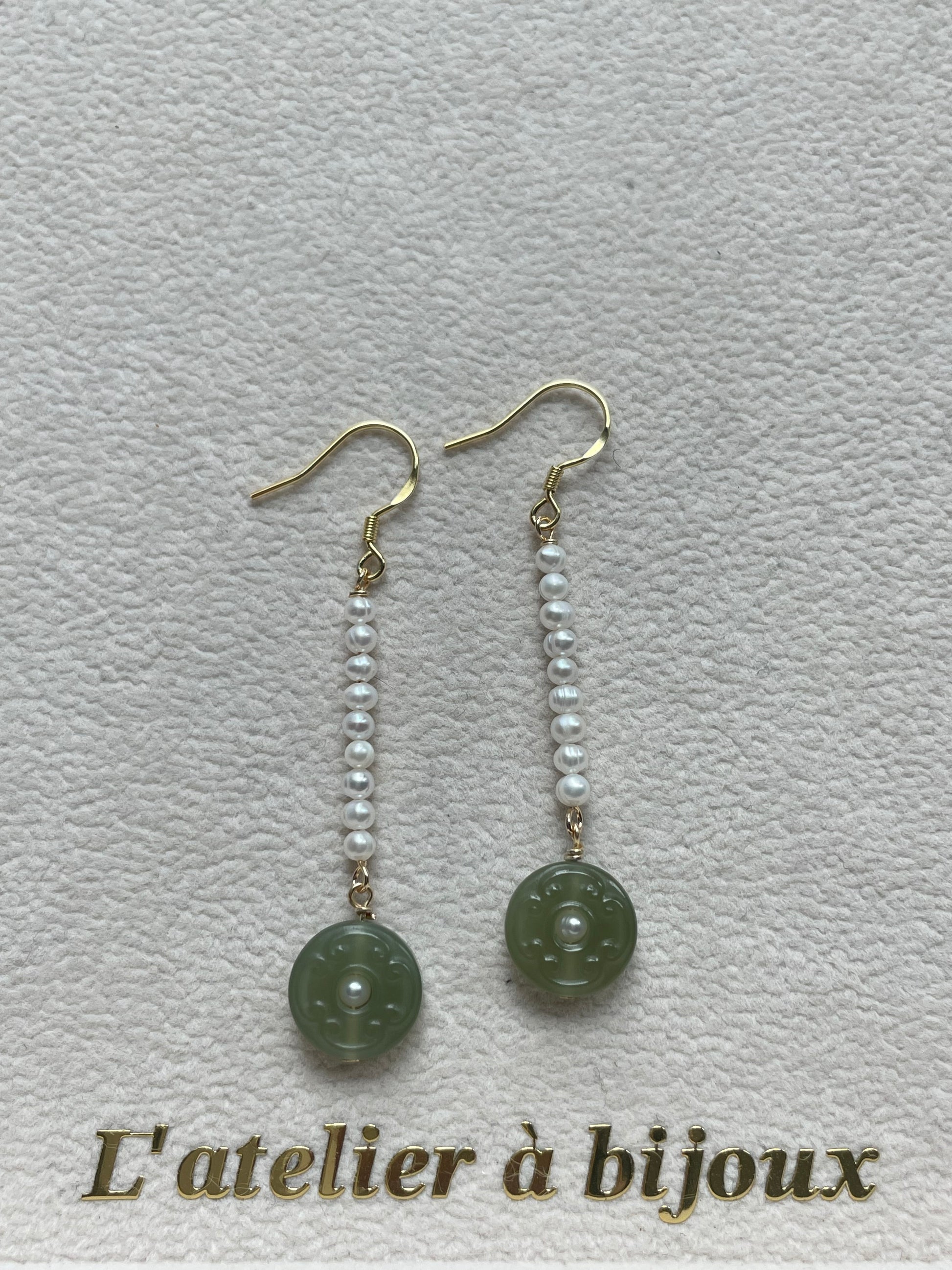 Đôi hoa tai ngọc trai Pi trong hình toát lên vẻ đẹp thanh lịch và tinh tế, nổi bật với thiết kế dáng dài mềm mại. Phần thân hoa tai được kết từ những viên ngọc trai nước ngọt nhỏ, tròn đều, xếp thẳng hàng tạo hiệu ứng rủ nhẹ nhàng và uyển chuyển. Điểm nhấn đặc biệt nằm ở mặt Pi tròn bằng ngọc bích màu xanh, bề mặt bóng mịn, sắc xanh trầm dịu mang ý nghĩa bình an, may mắn và cân bằng. Sự kết hợp hài hòa giữa ánh trắng ngọc trai và sắc xanh ngọc bích tạo nên tổng thể vừa sang trọng, vừa mang nét cổ điển Á Đông đầy cuốn hút.