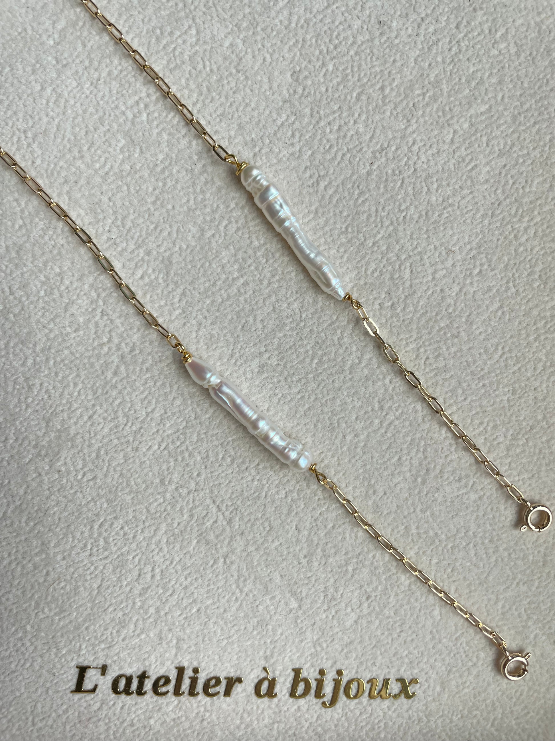 Vòng tay nổi bật với viên ngọc trai dài tự nhiên, kết hợp cùng dây xích mạ vàng sáng bóng, tạo nên vẻ sang trọng và phong cách hiện đại. Thiết kế thanh mảnh, thích hợp để phối cùng nhiều phong cách trang phục, từ nhẹ nhàng đến cá tính.