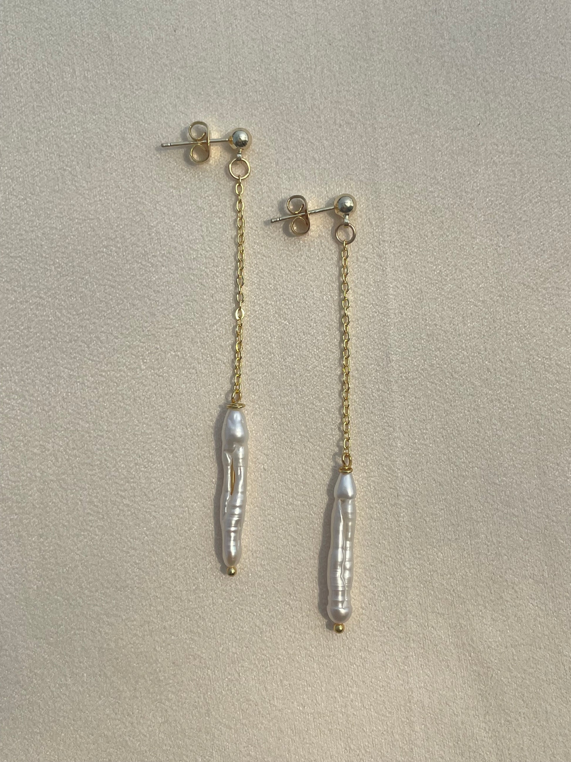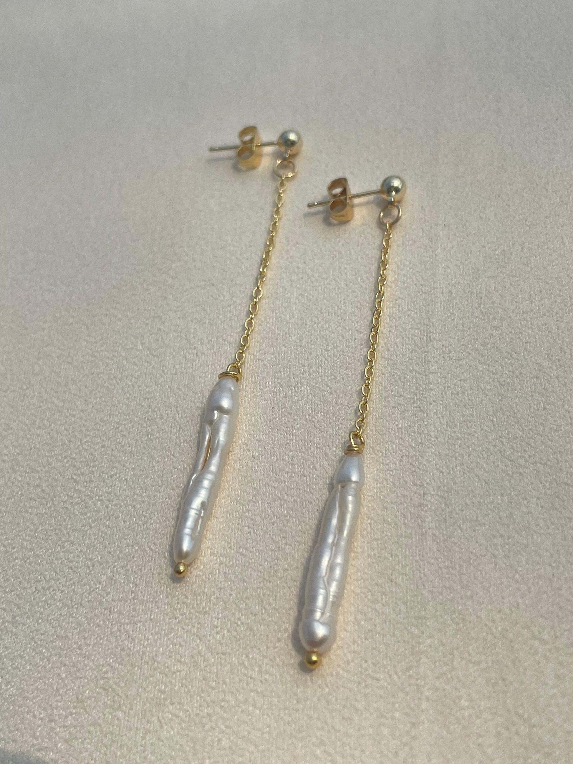 Đôi hoa tai chuỗi ngọc trai dài mang phong cách tối giản nhưng đầy tinh tế, là điểm nhấn hoàn hảo cho những cô nàng yêu thích sự thanh lịch và hiện đại. Thiết kế nổi bật với chuỗi ngọc trai nước ngọt tự nhiên thả dài mềm mại, kết hợp cùng dây kim loại mạ vàng 18k sang trọng, tạo hiệu ứng chuyển động uyển chuyển và cuốn hút theo từng bước đi.