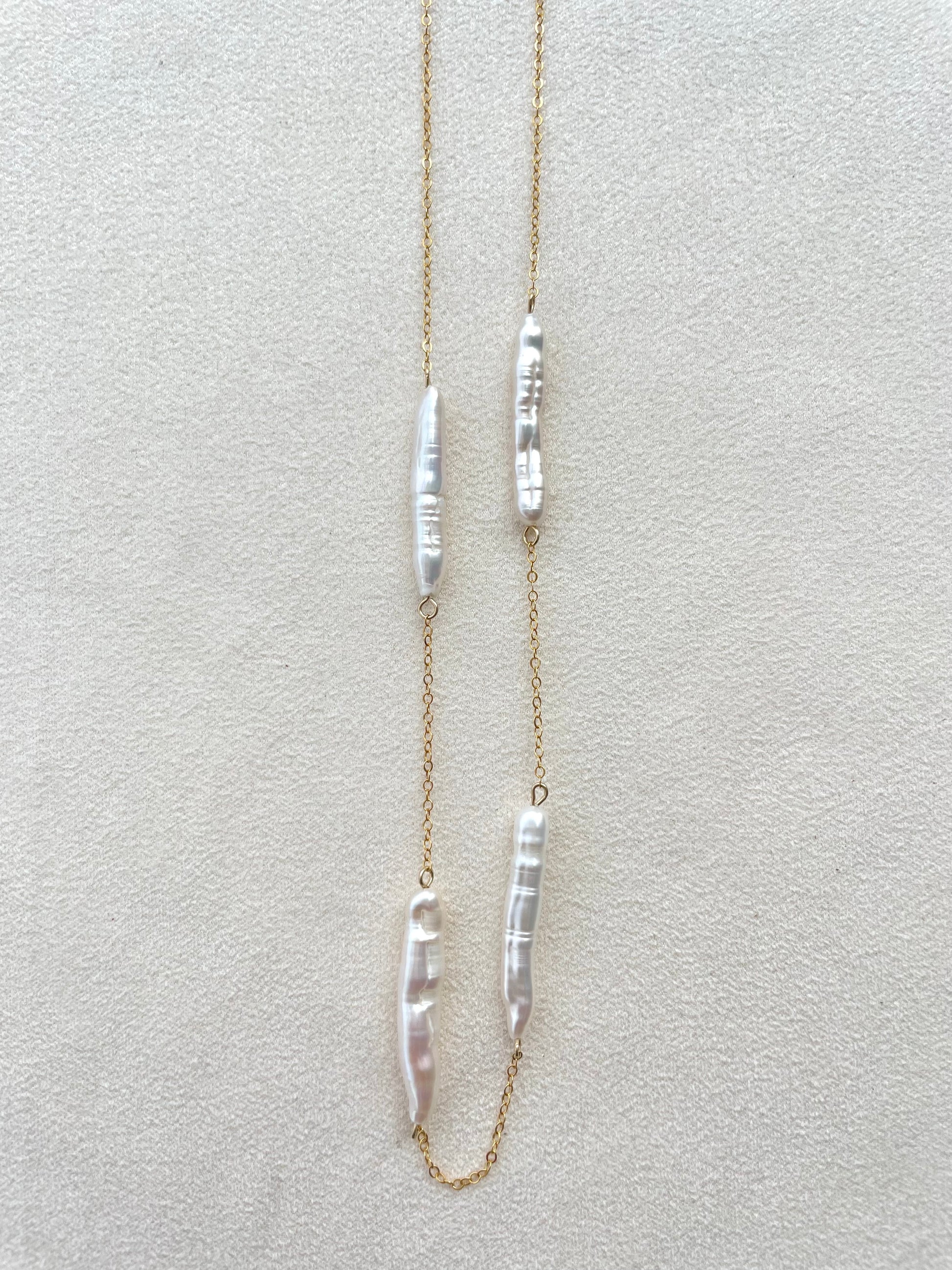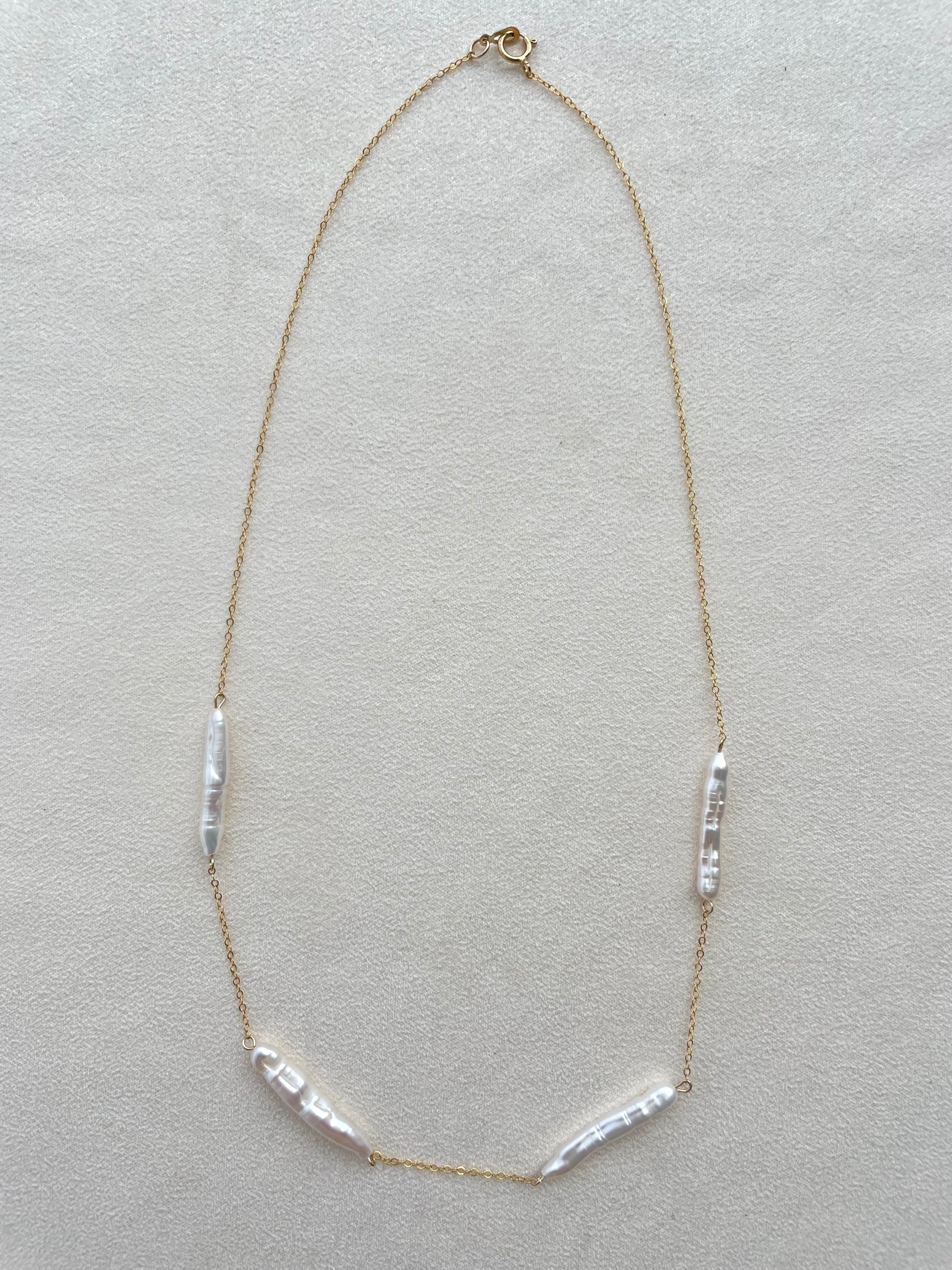 Chiếc vòng cổ ngọc trai Biwa kết hợp dây vàng mảnh mang thiết kế thanh lịch và hiện đại, được chế tác từ ngọc trai Biwa tự nhiên với dáng thuôn dài độc đáo, bề mặt ánh xà cừ óng ánh bắt sáng mềm mại. Các viên ngọc được bố trí cân đối trên dây xích vàng mảnh, tạo cảm giác tinh tế, nhẹ nhàng nhưng đầy ấn tượng.