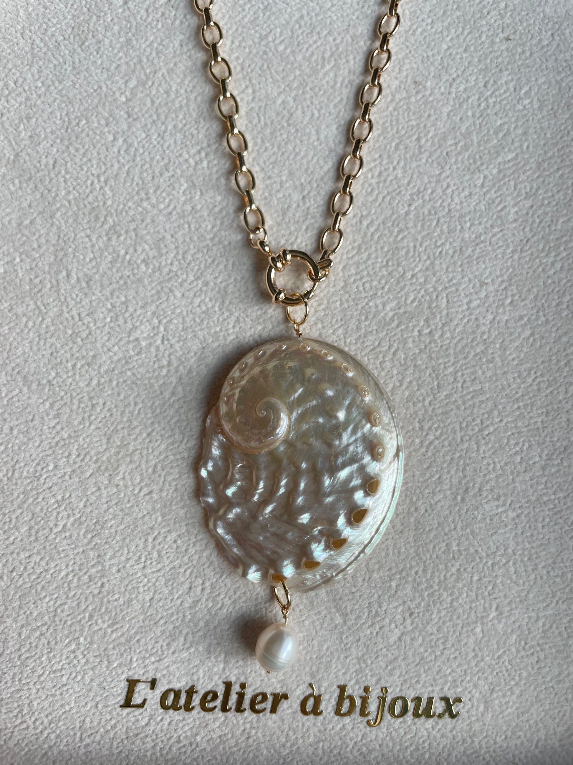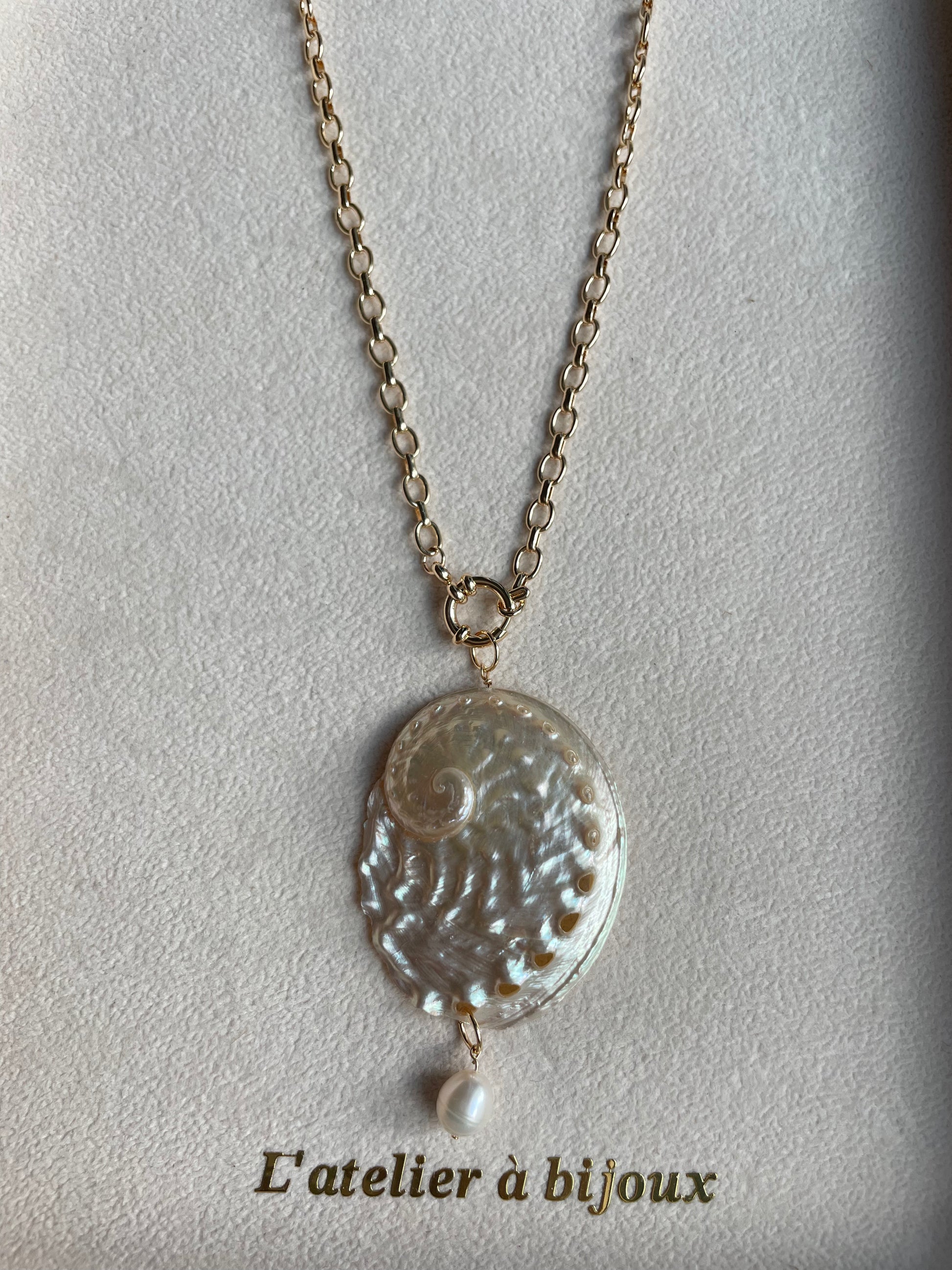 Chiếc vòng cổ nổi bật với thiết kế tinh xảo, điểm nhấn là mặt dây từ vỏ bào ngư tự nhiên được chạm khắc hình xoắn ốc độc đáo, bề mặt ánh xà cừ óng ánh bắt sáng đầy cuốn hút. Phía dưới mặt dây được tô điểm bởi một viên ngọc trai trắng nhỏ, cùng charm logo thương hiệu tinh xảo, mang đến sự hài hòa giữa vẻ đẹp tự nhiên và nét sang trọng.