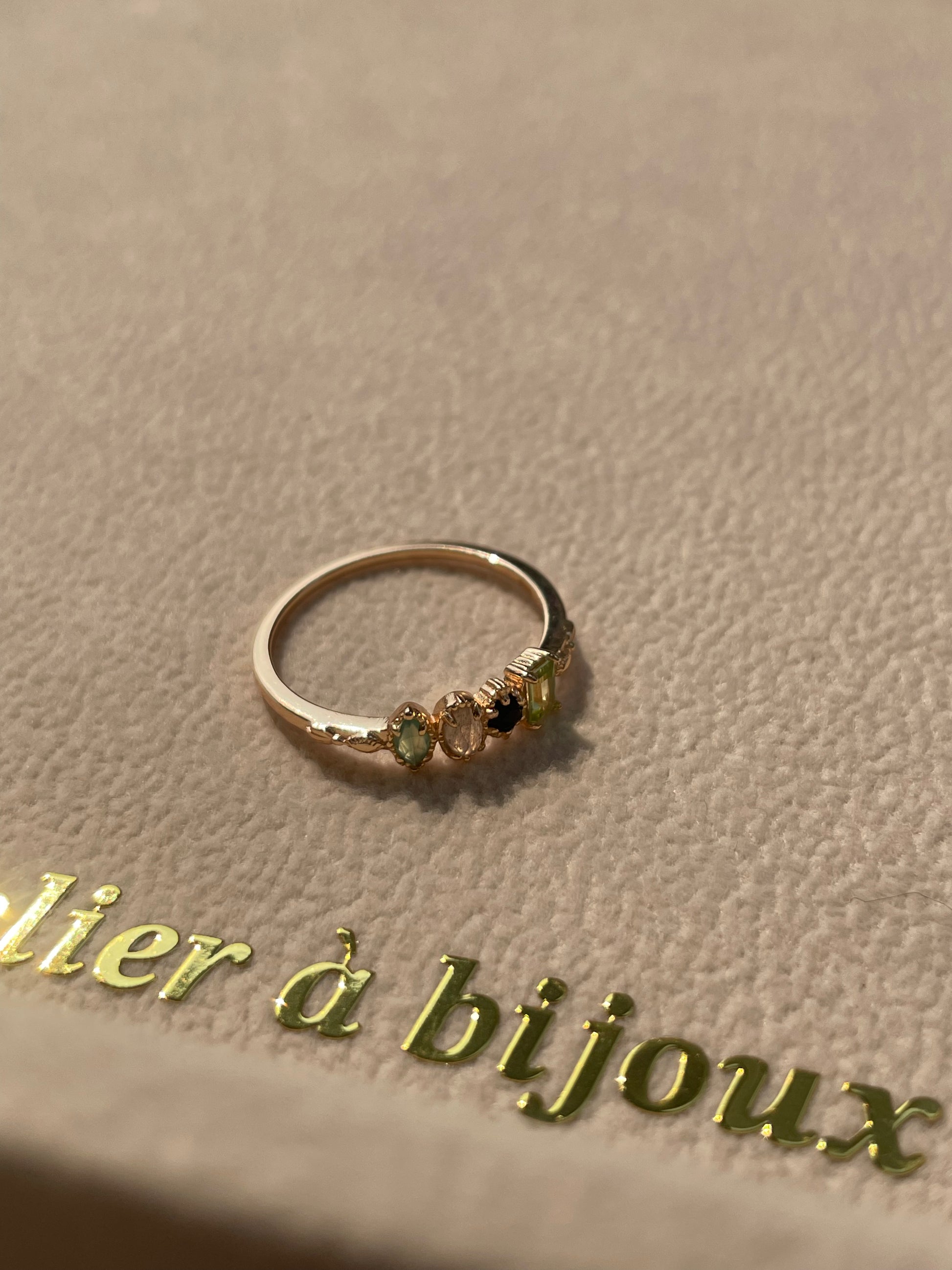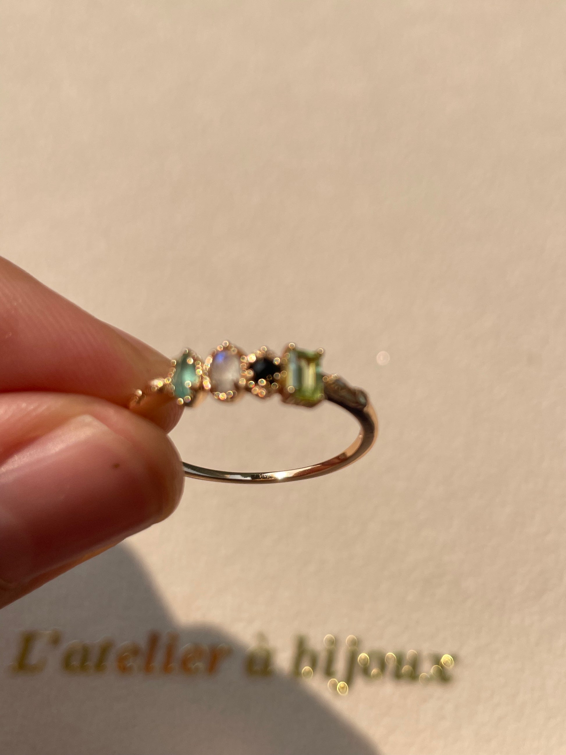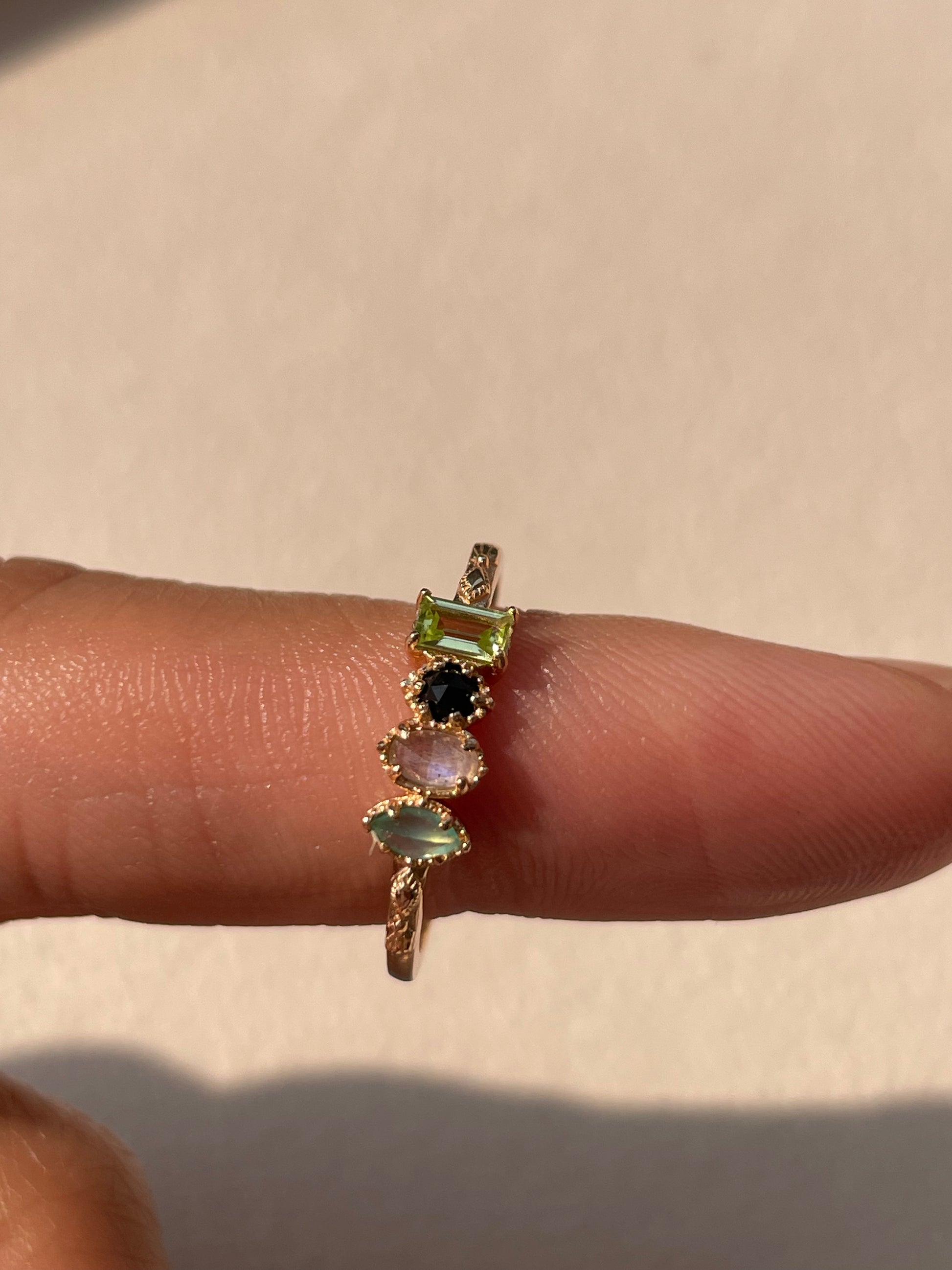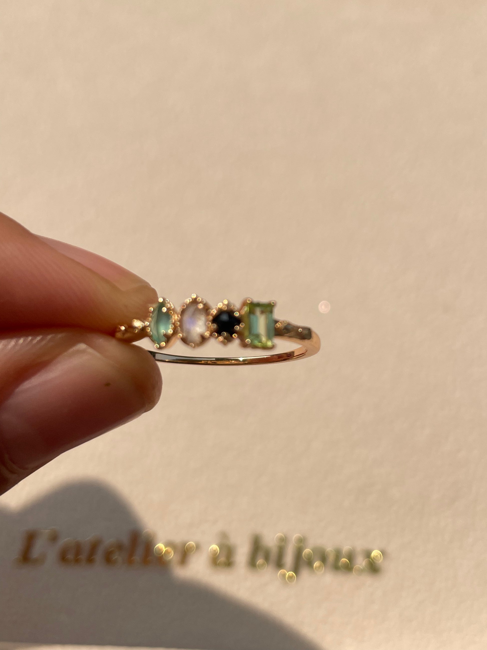 Chiếc nhẫn thanh mảnh được chế tác từ bạc S925 cao cấp, điểm xuyết 5 viên đá quý thiên nhiên: Peridot, Black Agate, Labradorite và Chrysoprase. Sự kết hợp giữa các gam màu xanh non, đen huyền bí, xám ánh khói và xanh ngọc dịu nhẹ tạo nên một tổng thể hài hòa, sang trọng và tinh tế.