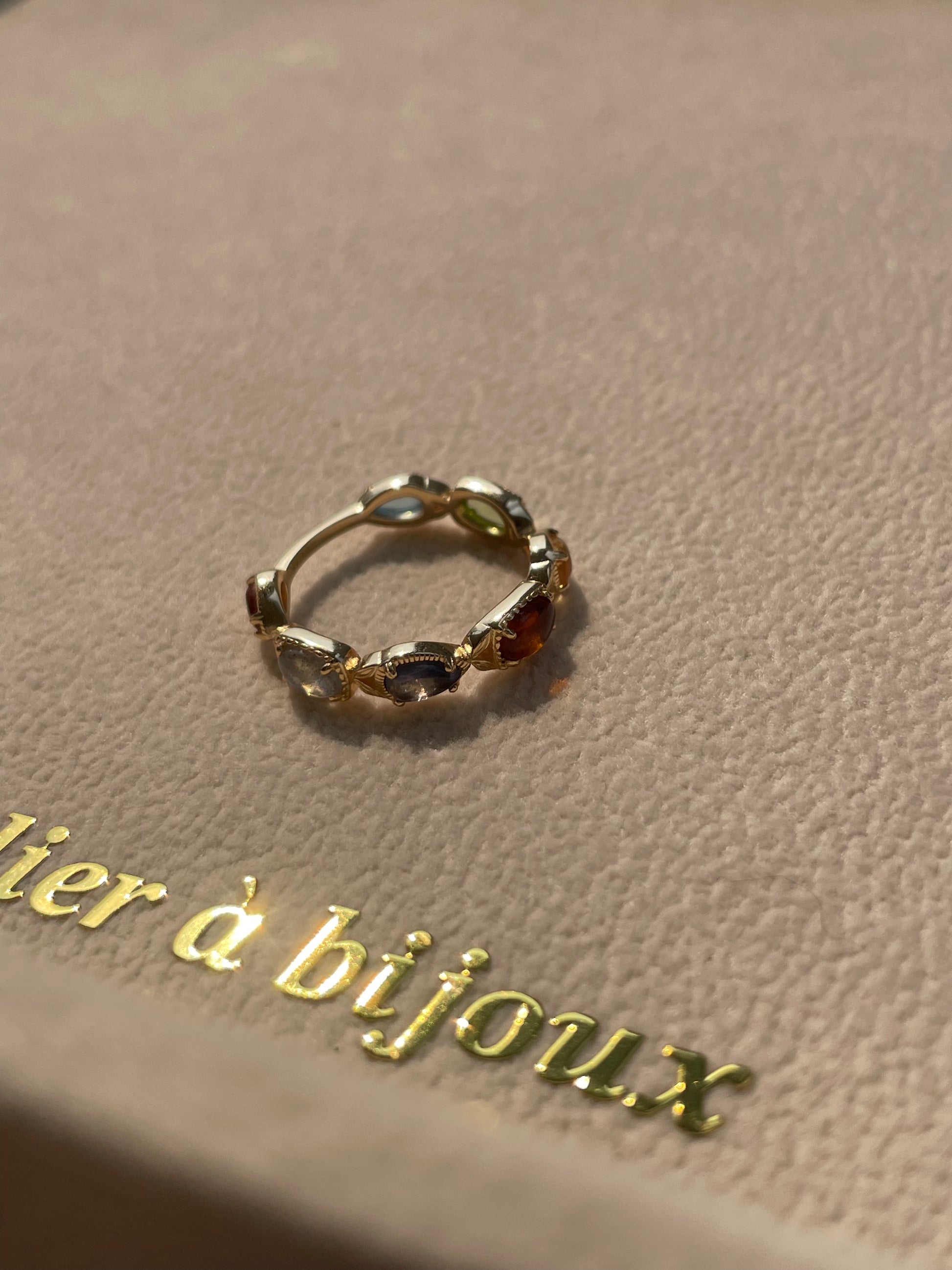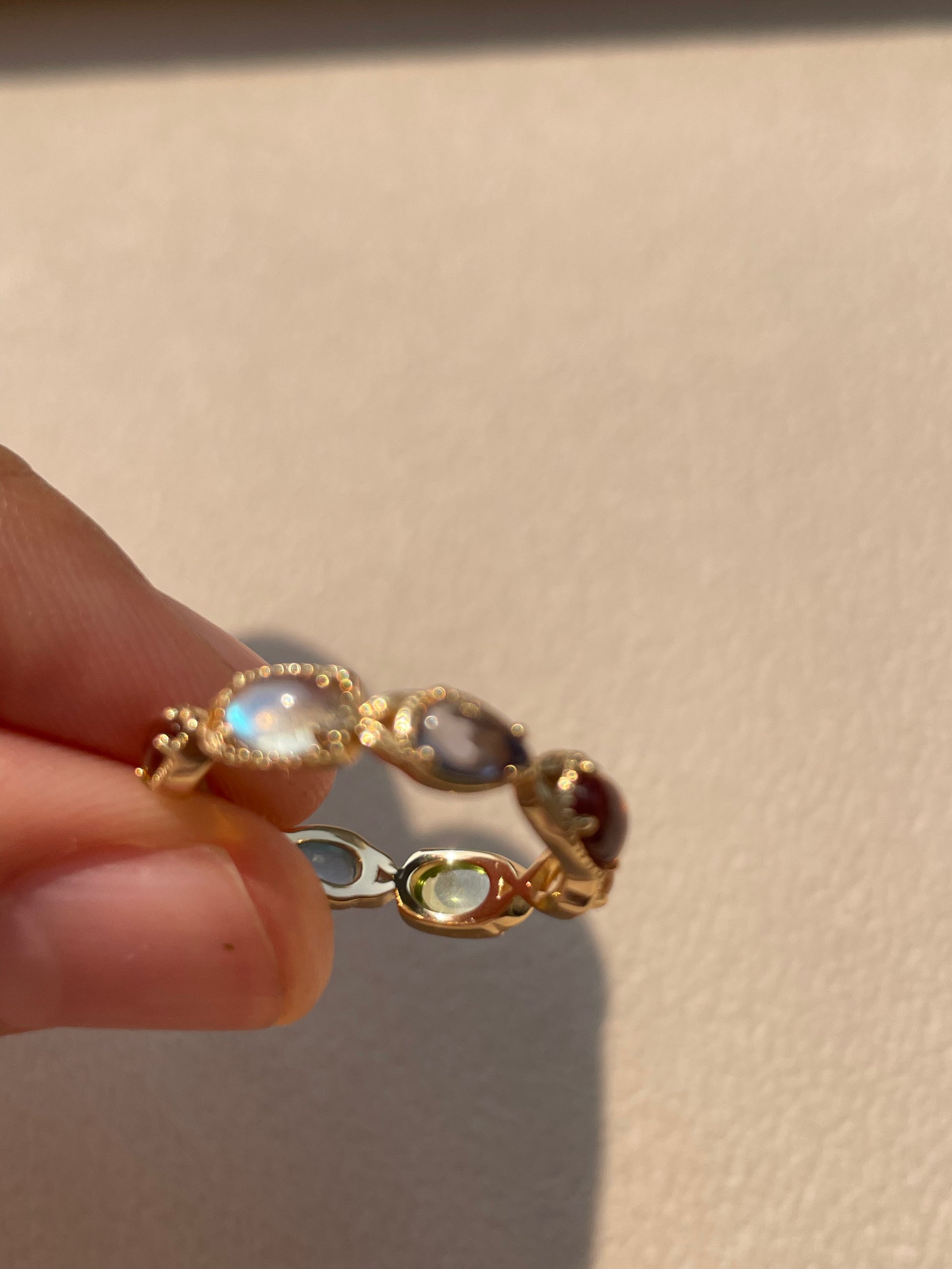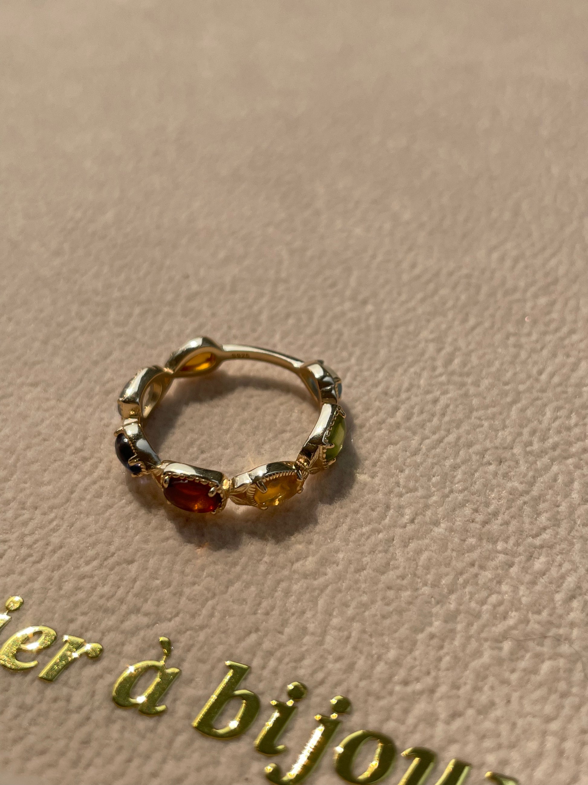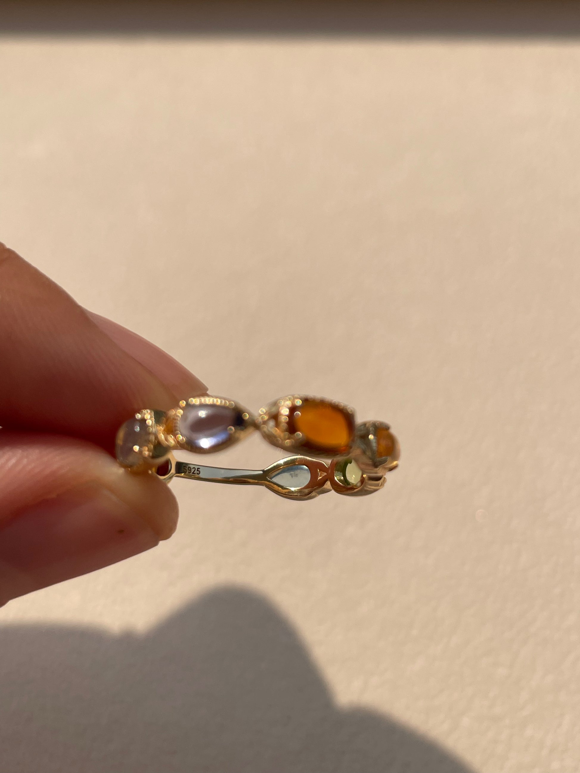 Chiếc nhẫn được chế tác từ bạc S925 cao cấp phủ mạ vàng 14K sang trọng, nổi bật với thiết kế tinh xảo và sự kết hợp hài hòa của 7 viên đá quý thiên nhiên. Bảng màu đa sắc trải dài từ vàng mật ong (Citrine), xanh non (Peridot), xám khói (Labradorite), hồng phấn (Lolita), xanh biển dịu (Aquamarine), hổ phách ấm áp (Amber) cho tới một viên đá tự nhiên lấp lánh đầy bí ẩn, tạo nên hiệu ứng ánh sáng vô cùng cuốn hút.