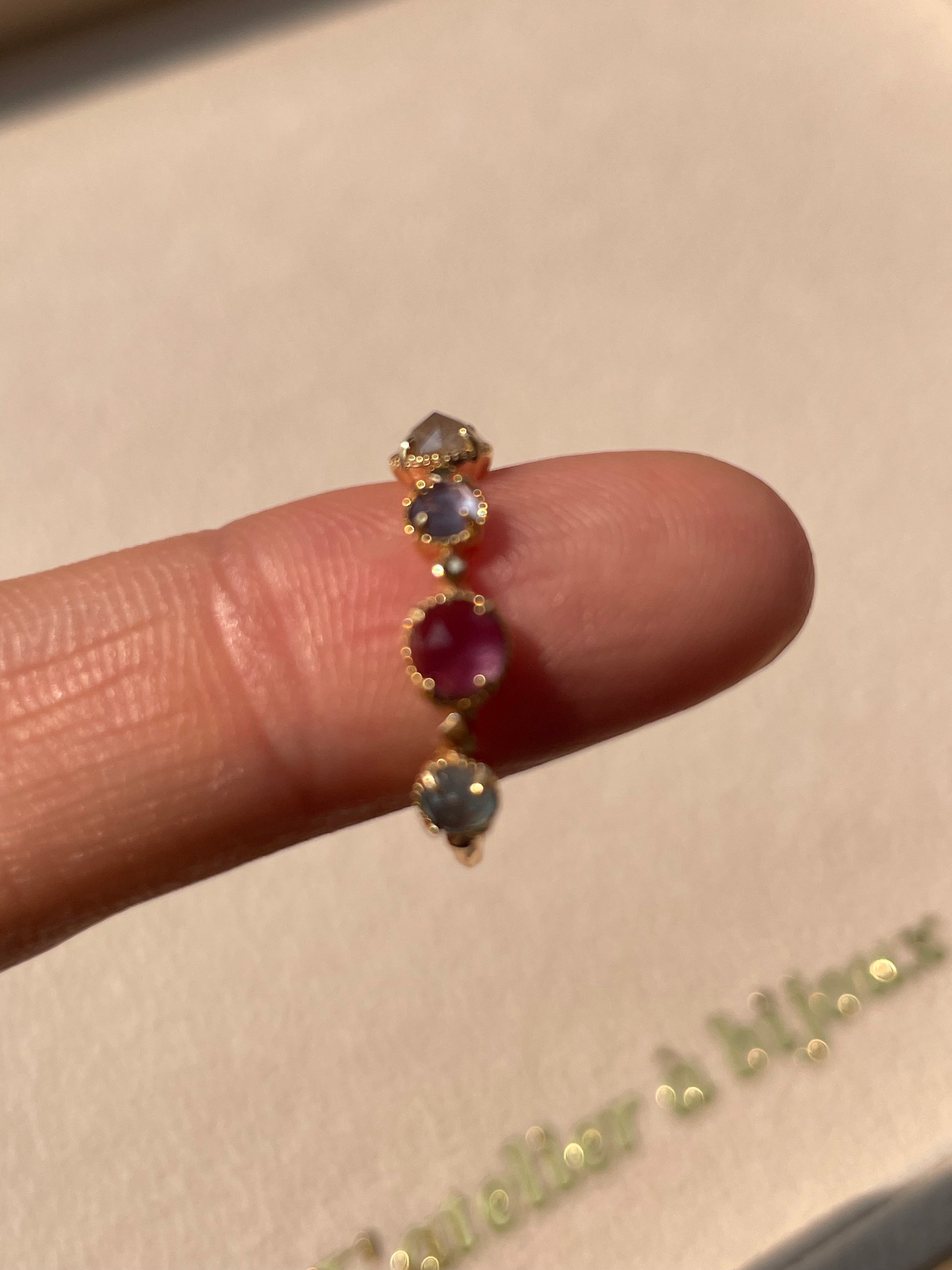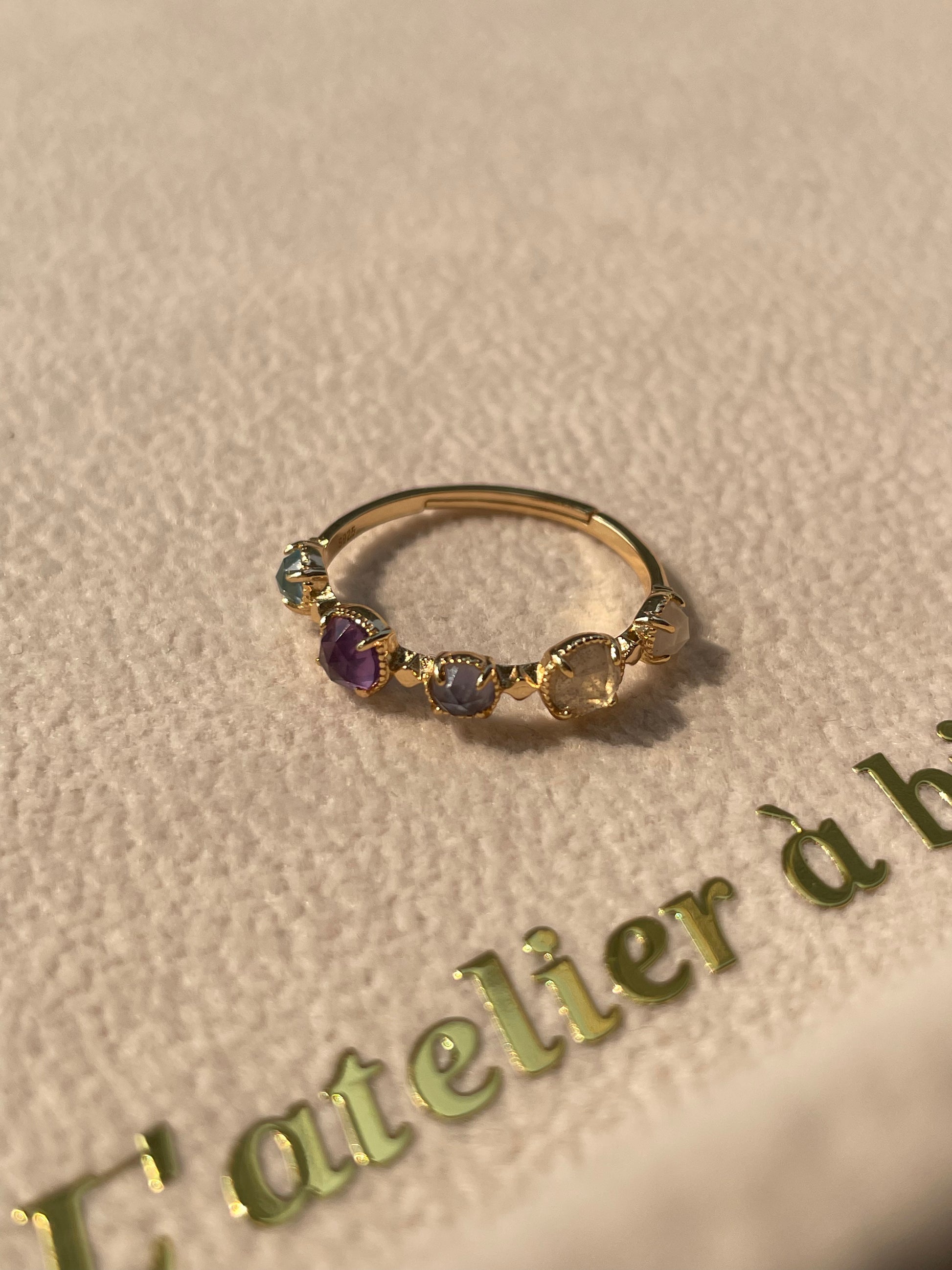 Chiếc nhẫn được chế tác từ bạc S925 cao cấp, nổi bật với thiết kế thanh mảnh kết hợp 5 viên đá quý tự nhiên được tuyển chọn kỹ lưỡng. Mỗi viên đá sở hữu sắc độ riêng biệt, từ trong suốt, xanh khói, tím dịu đến đỏ ruby rực rỡ, tạo nên một bảng màu sang trọng và hài hòa.