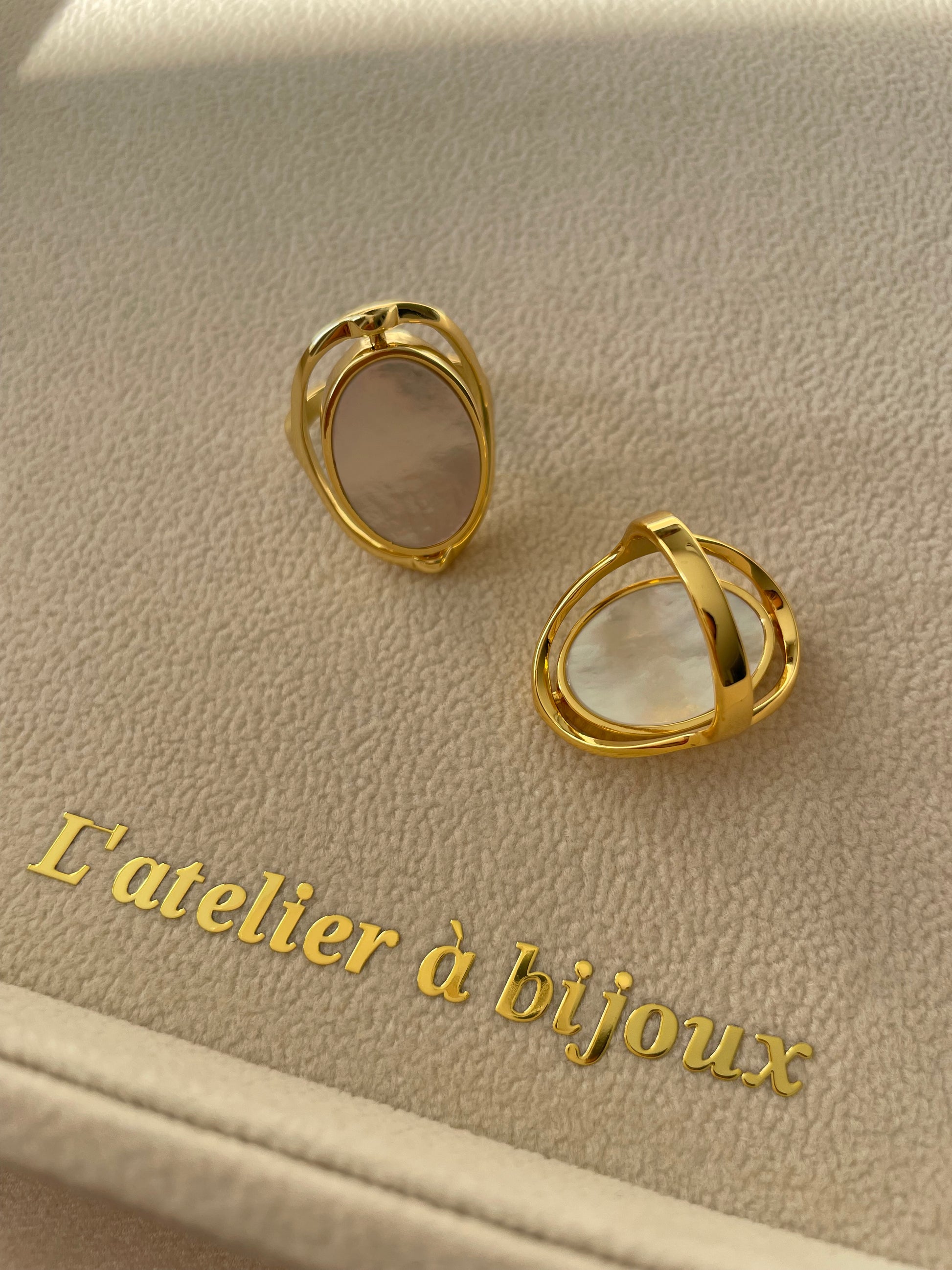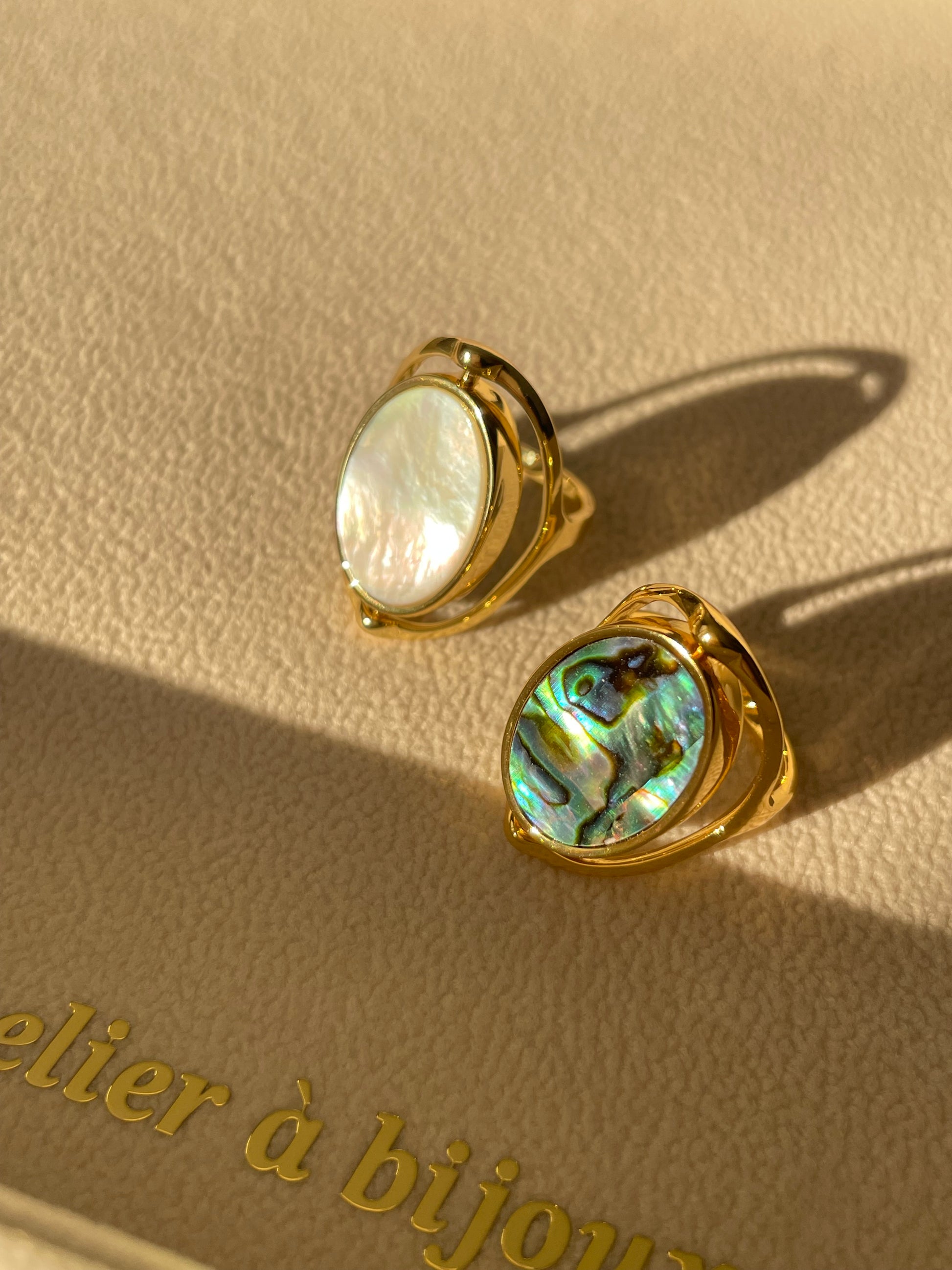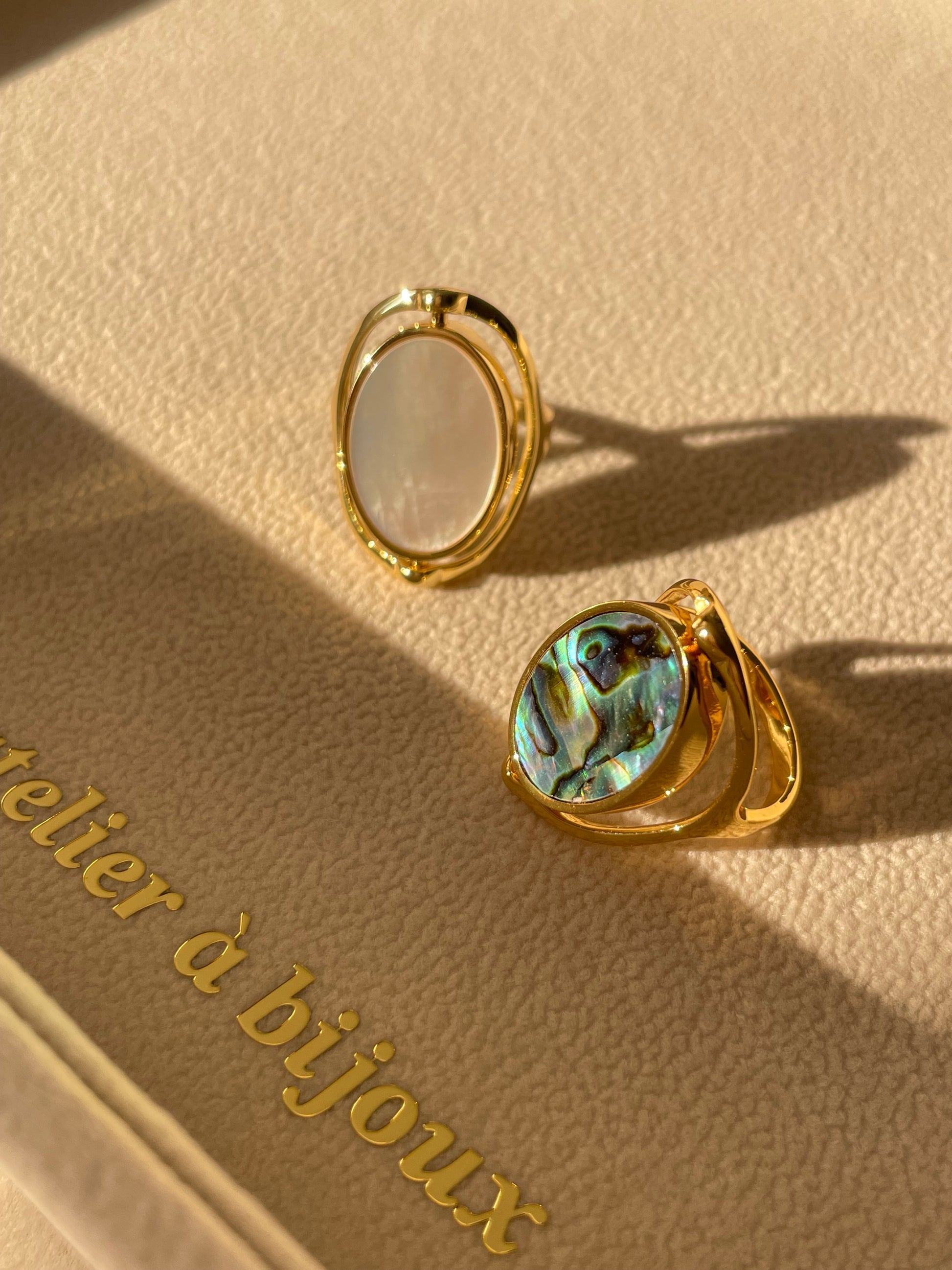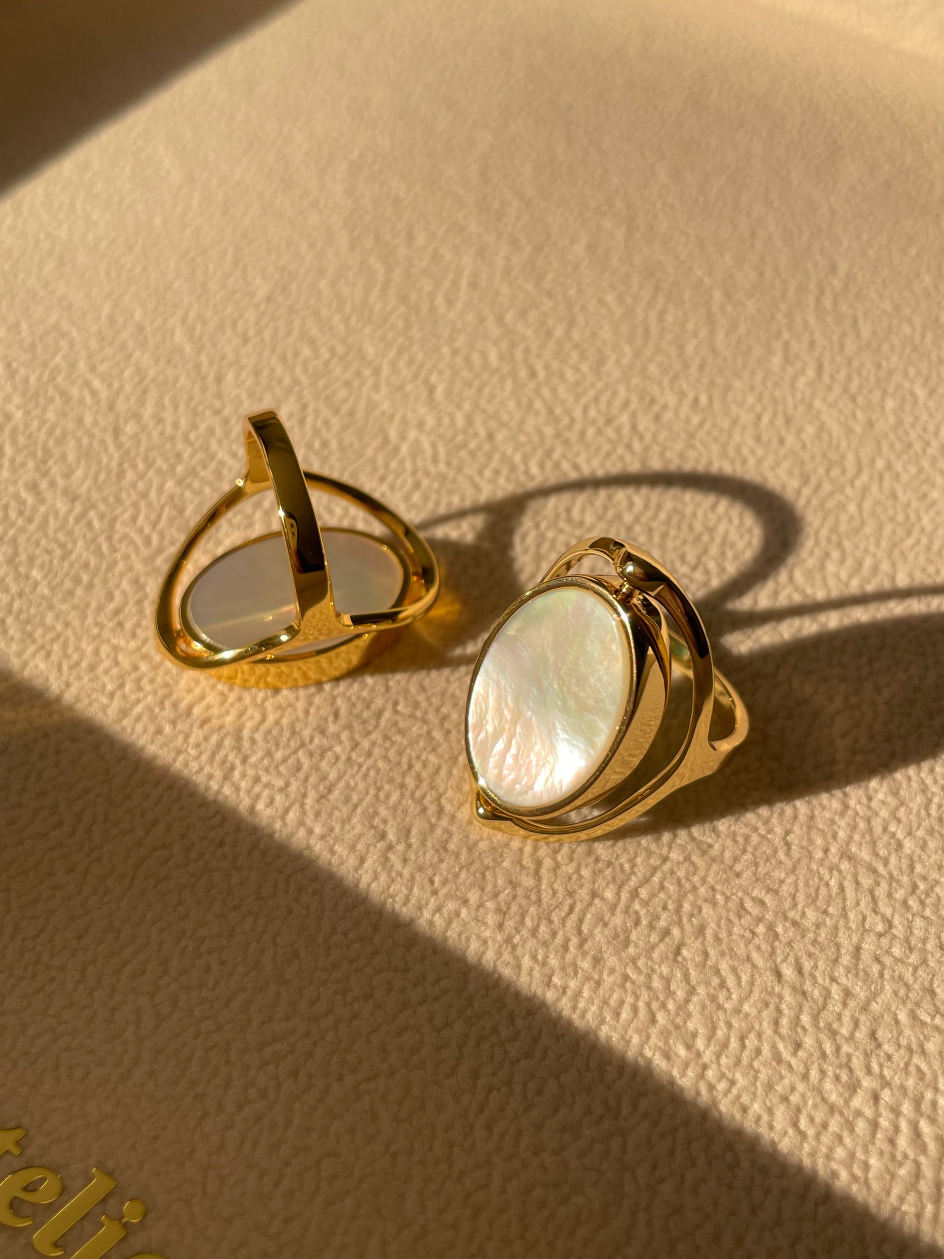 Chiếc nhẫn sở hữu thiết kế hai mặt độc đáo, nổi bật với sắc óng ánh của xà cừ tự nhiên được cắt mài tinh xảo, mang đến hiệu ứng chuyển sắc mềm mại dưới ánh sáng. Phần khung nhẫn được chế tác từ kim loại mạ vàng 18K cao cấp, đường nét bo tròn mềm mại tạo cảm giác hiện đại nhưng vẫn giữ được nét thanh lịch.