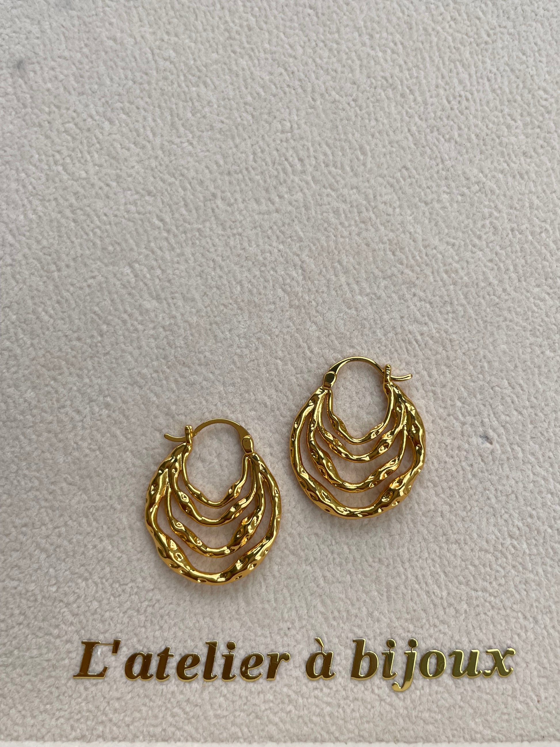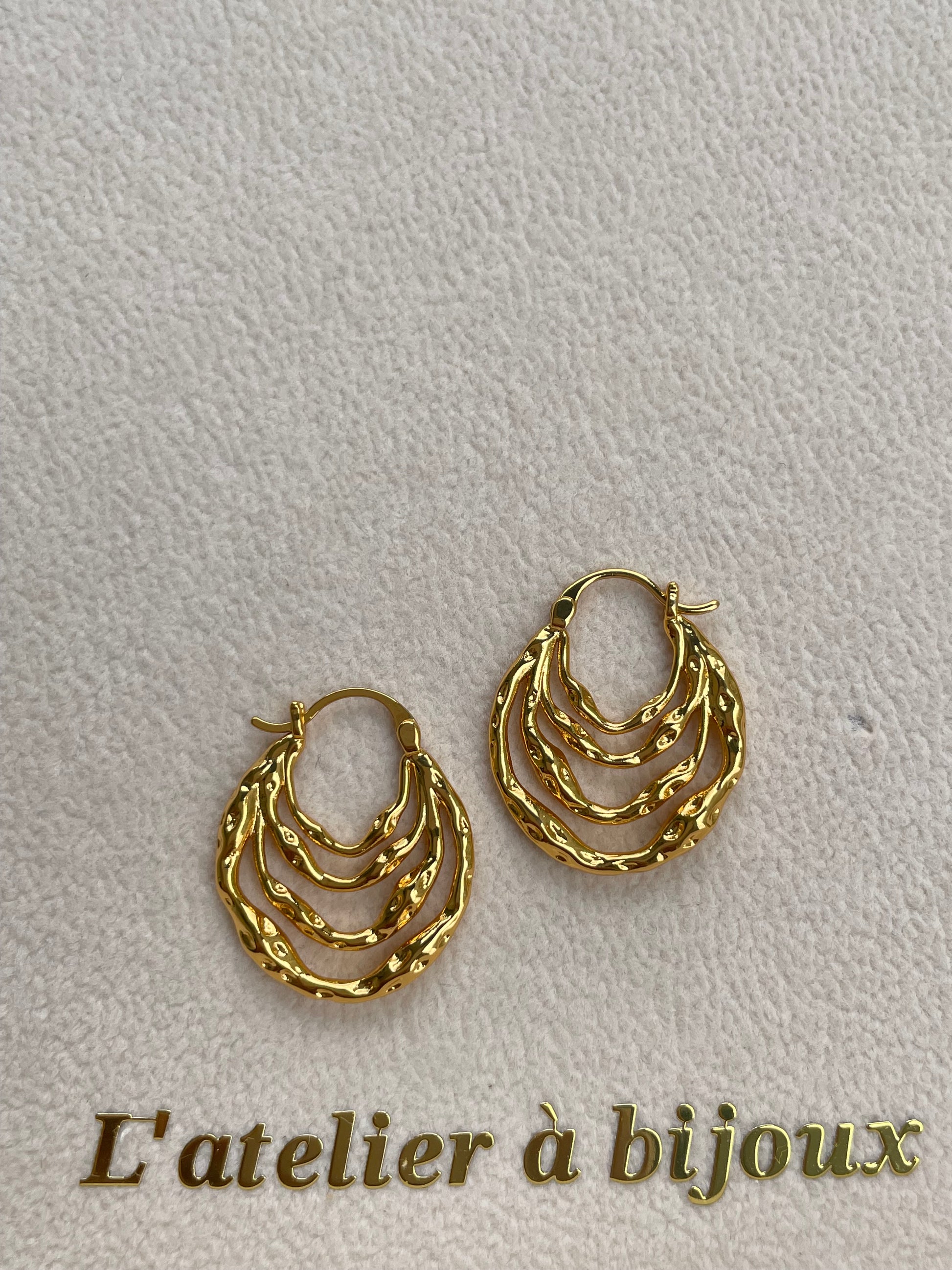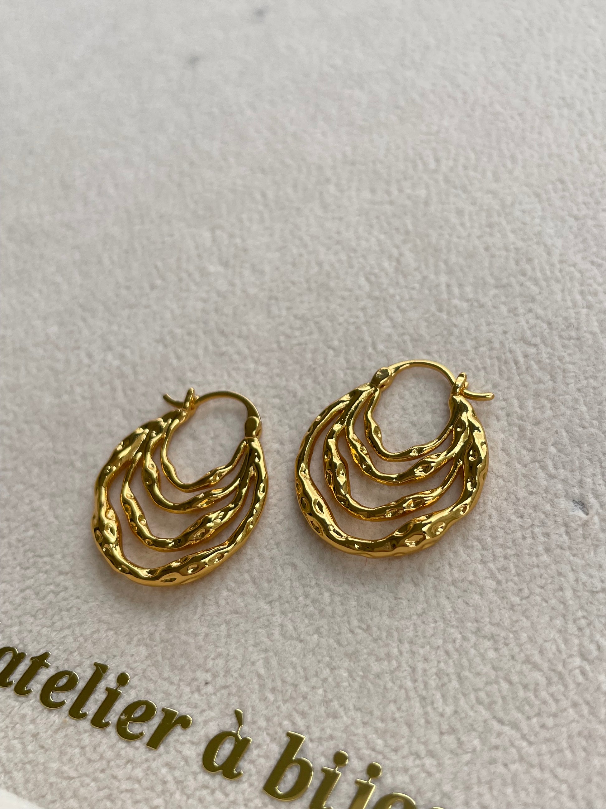 Đôi hoa tai vàng này gây ấn tượng với thiết kế đa tầng uốn lượn độc đáo, mang vẻ đẹp hiện đại xen lẫn sang trọng. Các vòng tròn lồng ghép tinh xảo tạo hiệu ứng bắt sáng nổi bật, giúp gương mặt thêm phần rạng rỡ. Chất liệu kim loại mạ vàng cao cấp mang đến sự bền đẹp và tinh tế, phù hợp để làm điểm nhấn cho nhiều phong cách khác nhau.