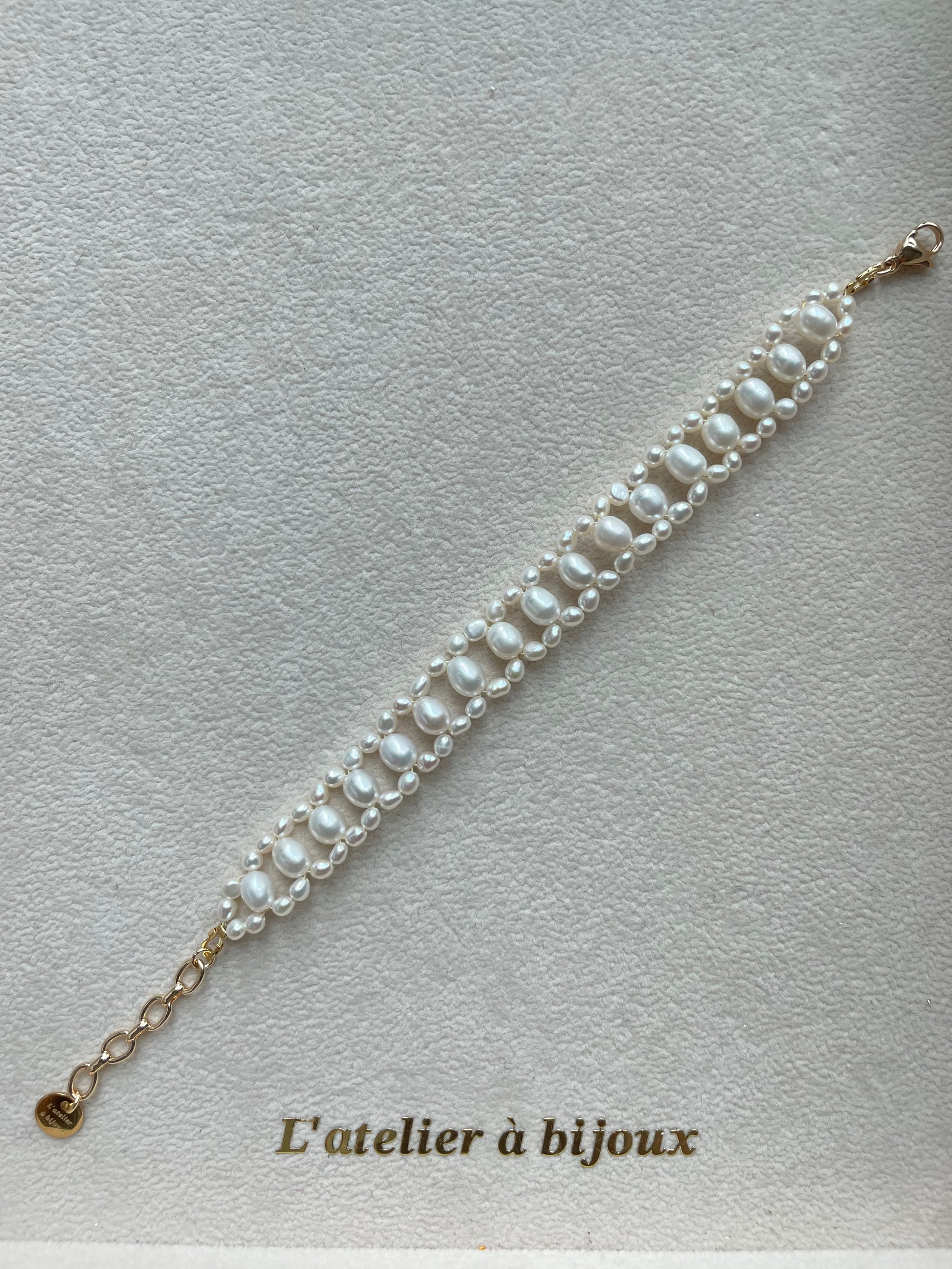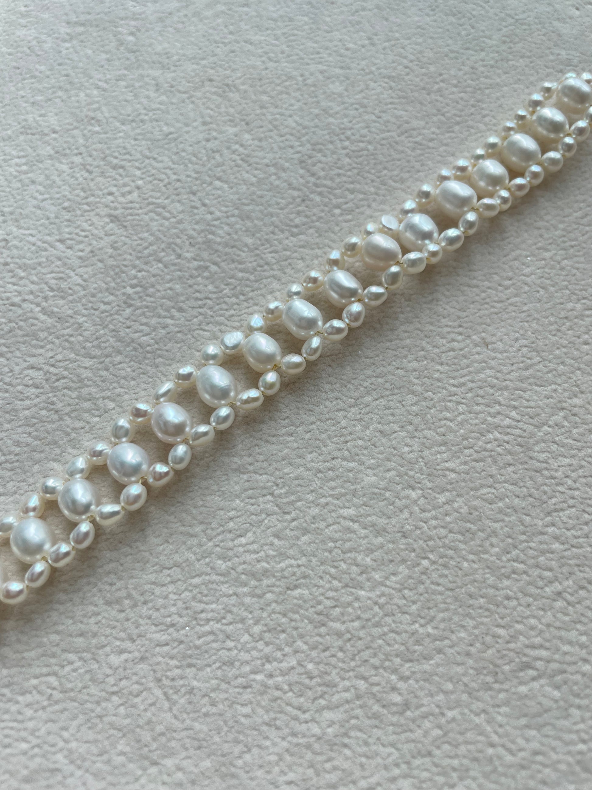 Tỏa sáng với vẻ đẹp sang trọng và cổ điển, chiếc vòng tay ngọc trai ba hàng là một tuyệt tác thủ công tinh xảo dành cho những ai yêu thích sự thanh lịch và đẳng cấp. Thiết kế ba hàng nổi bật với các viên ngọc trai nước ngọt tròn đều được đan xen khéo léo theo bố cục đối xứng, tạo hiệu ứng đầy đặn, hài hòa và nổi bật trên cổ tay.
