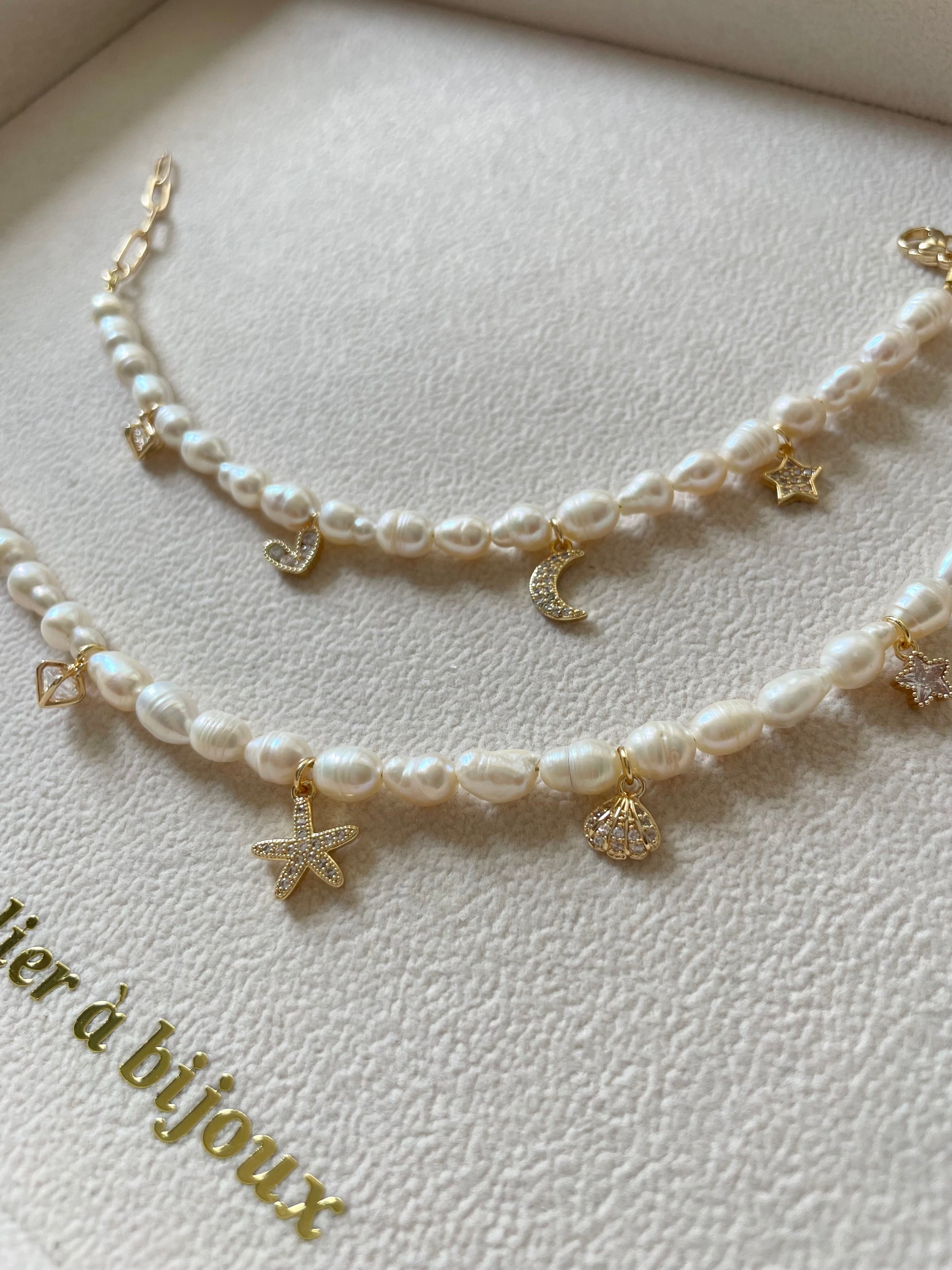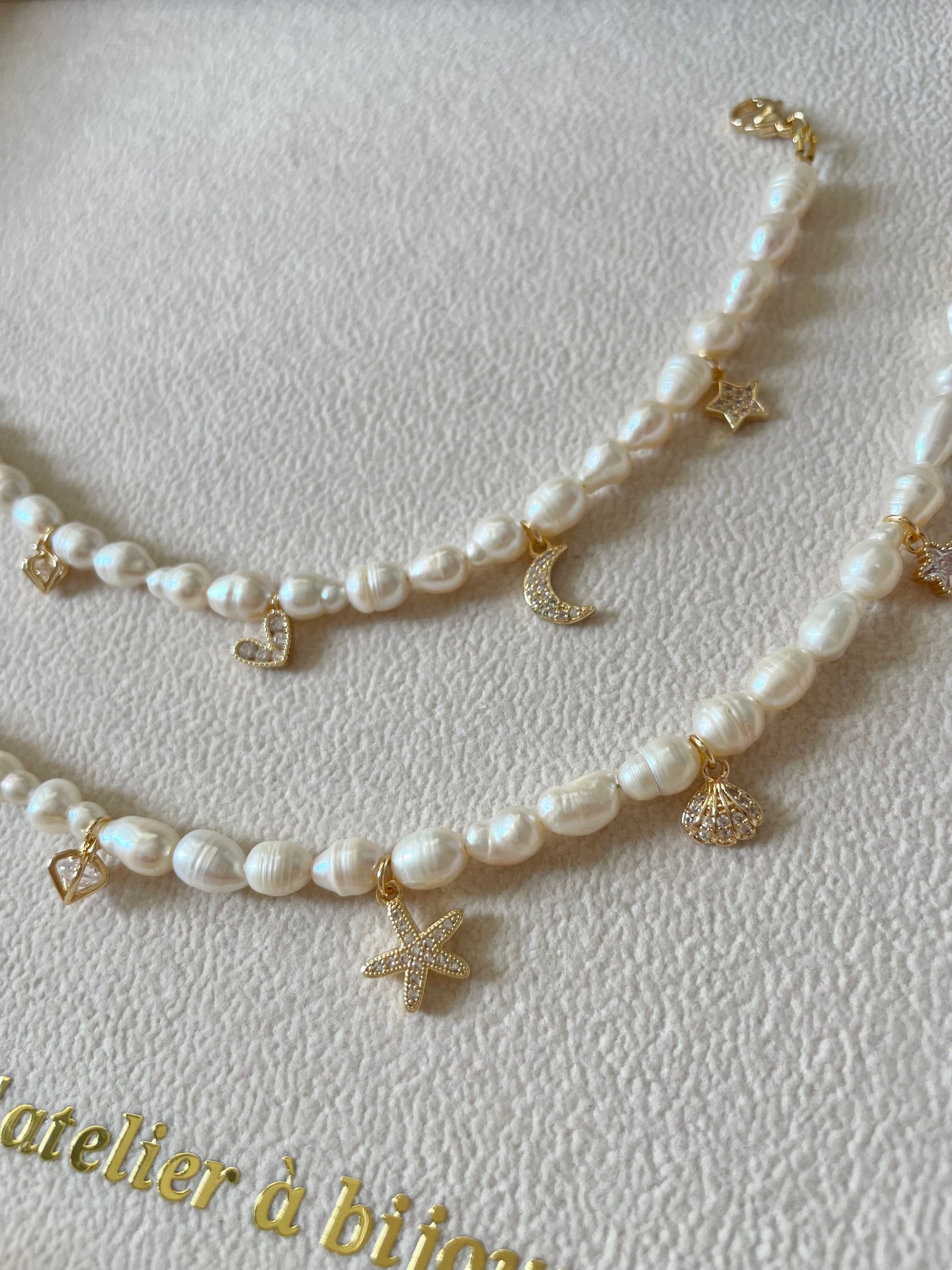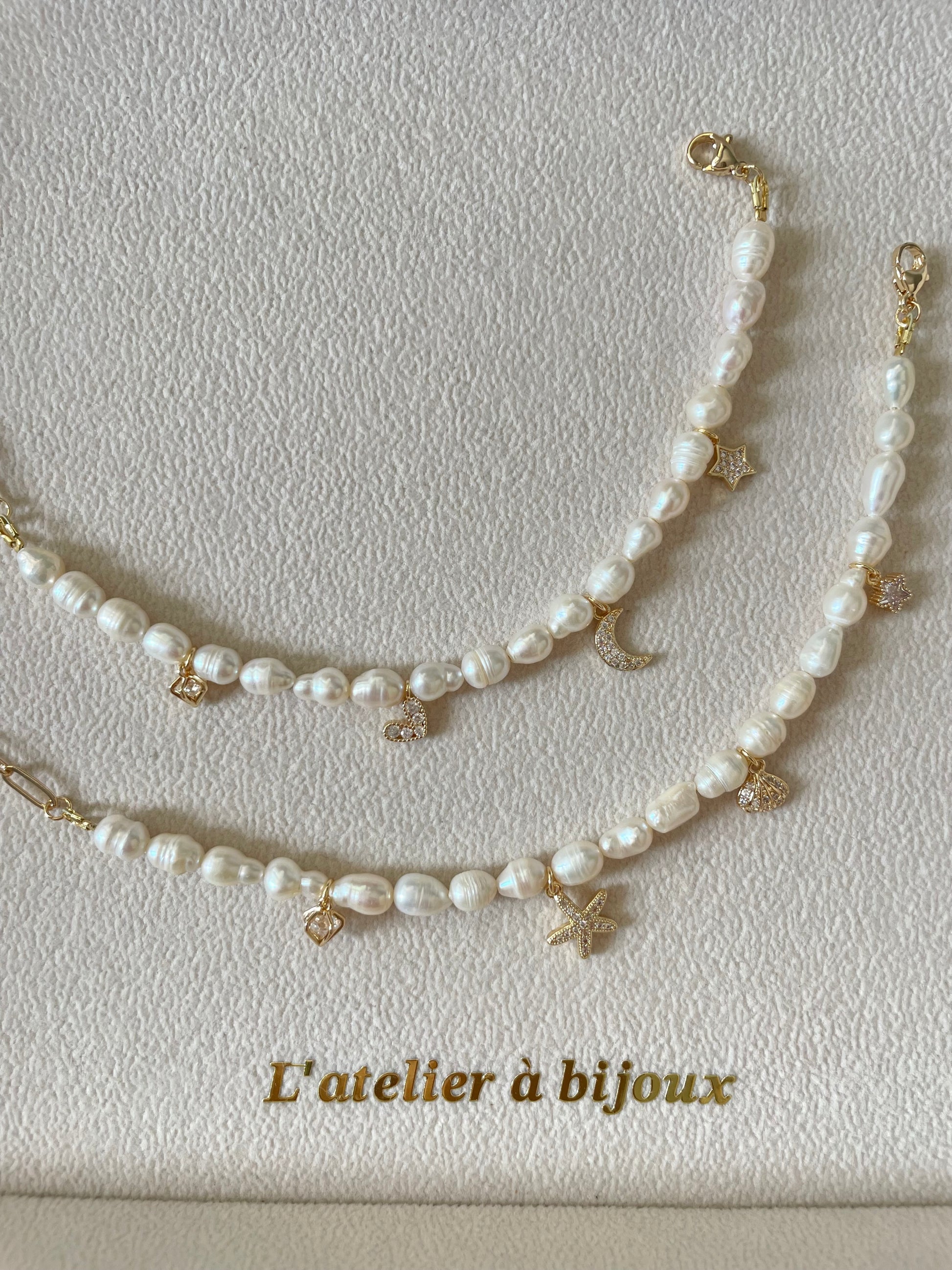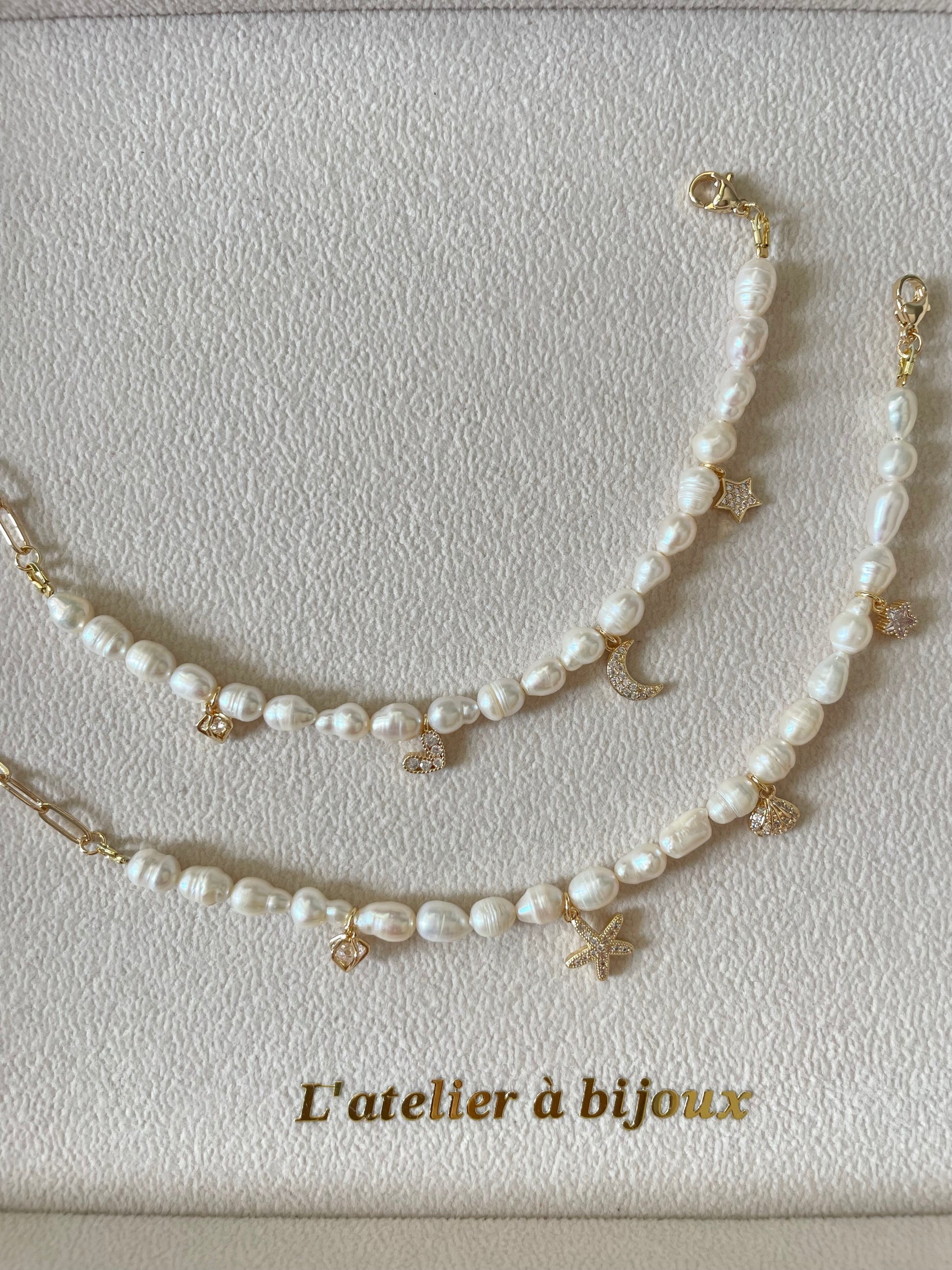 Những chiếc vòng tay nổi bật với thiết kế tinh tế và duyên dáng, được chế tác từ ngọc trai trắng tự nhiên nhỏ nhắn, óng ánh. Điểm nhấn đặc biệt đến từ charm vàng đính đá zircon với nhiều hình dáng như ngôi sao, mặt trăng, hoa và trái tim, tạo nên vẻ đẹp nhẹ nhàng nhưng đầy thu hút. Charm logo thương hiệu được gắn tinh xảo, khẳng định nét riêng biệt và đẳng cấp của thiết kế.