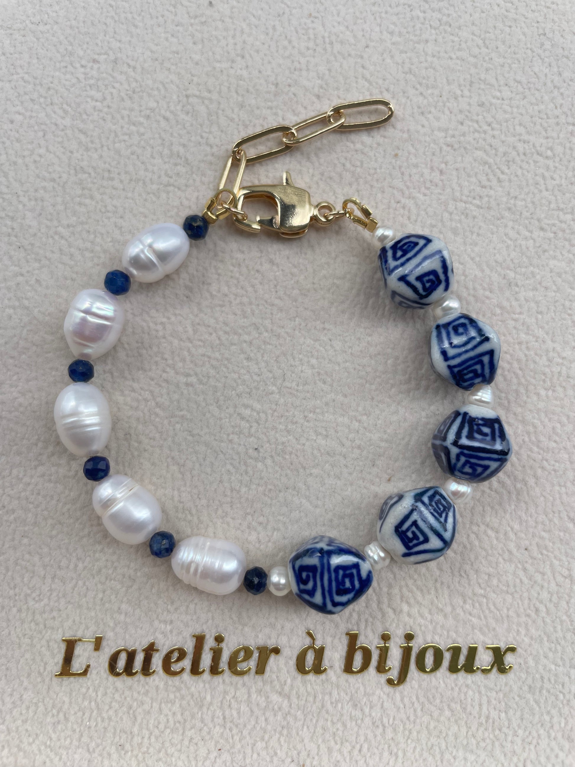 Chiếc vòng tay nổi bật với thiết kế độc đáo, kết hợp tinh tế giữa ngọc trai trắng tự nhiên, hạt đá xanh cắt facet và hạt gốm vẽ họa tiết xanh cobalt mang đậm phong cách Á Đông. Các chi tiết được phối hợp hài hòa, tạo nên tổng thể vừa sang trọng vừa nghệ thuật. Điểm nhấn đặc biệt nằm ở charm logo thương hiệu được gắn tinh xảo, tôn lên giá trị và nét riêng biệt của thiết kế.