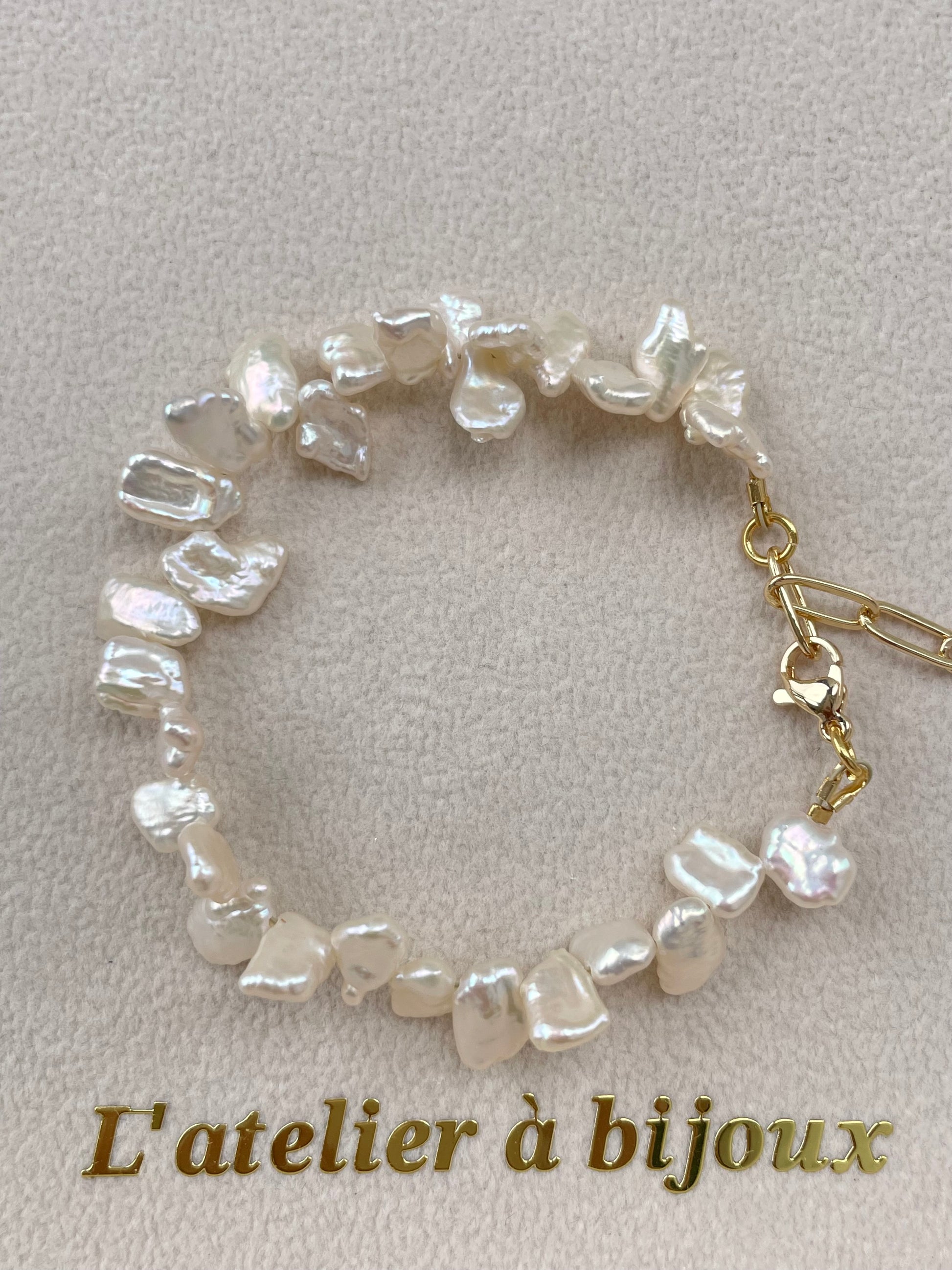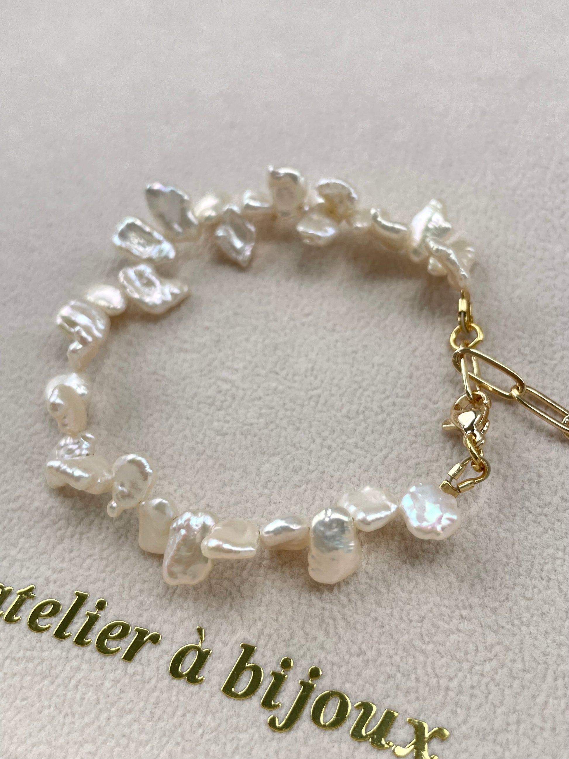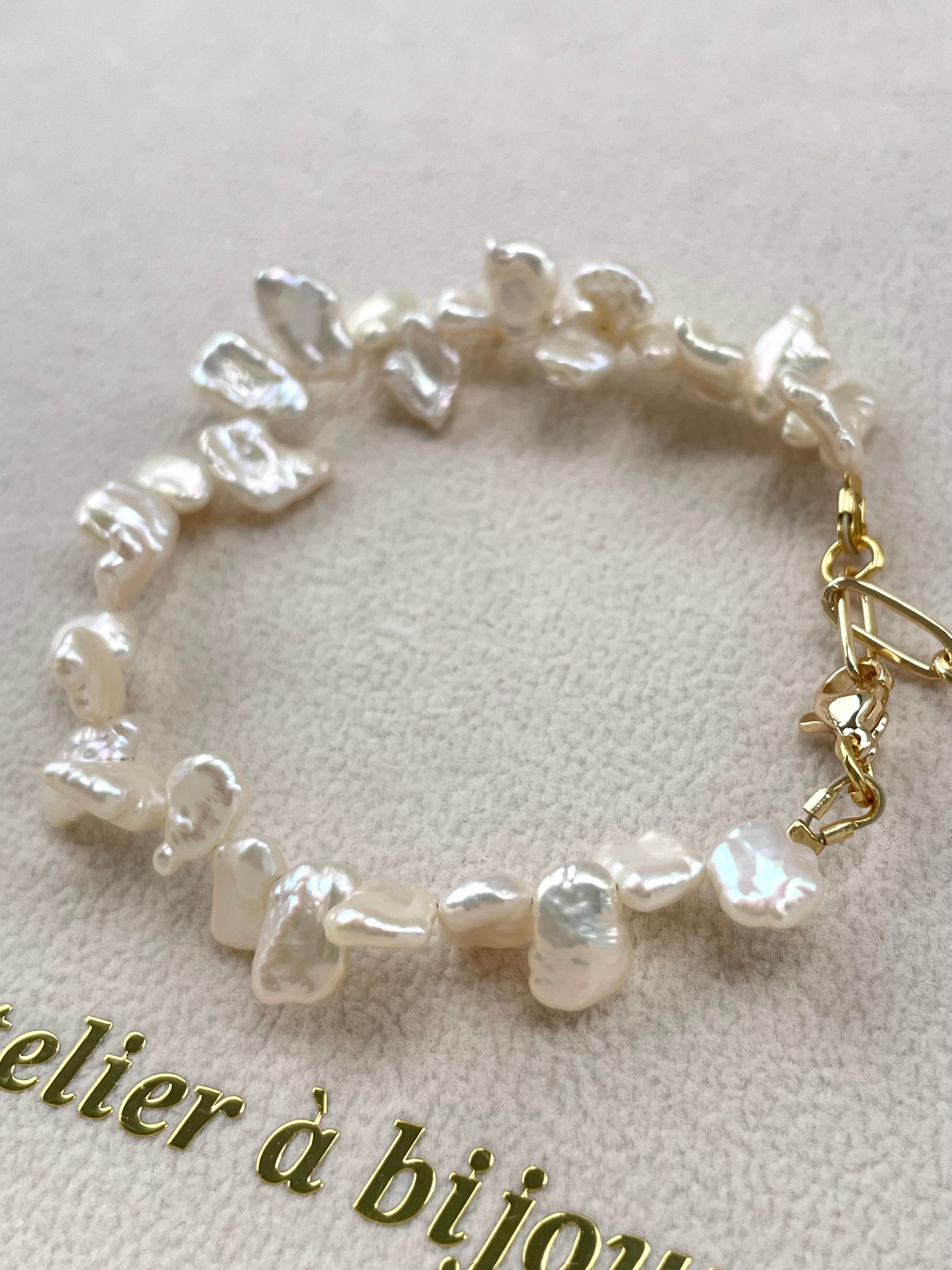 Chiếc vòng tay nổi bật với thiết kế tự nhiên và phóng khoáng, sử dụng ngọc trai baroque tự nhiên dáng thô với bề mặt ánh xà cừ óng ánh bắt sáng. Sự sắp xếp ngẫu hứng của các viên ngọc mang đến vẻ đẹp độc đáo và cá tính, đồng thời charm logo thương hiệu được gắn tinh tế tạo điểm nhấn sang trọng cho thiết kế.