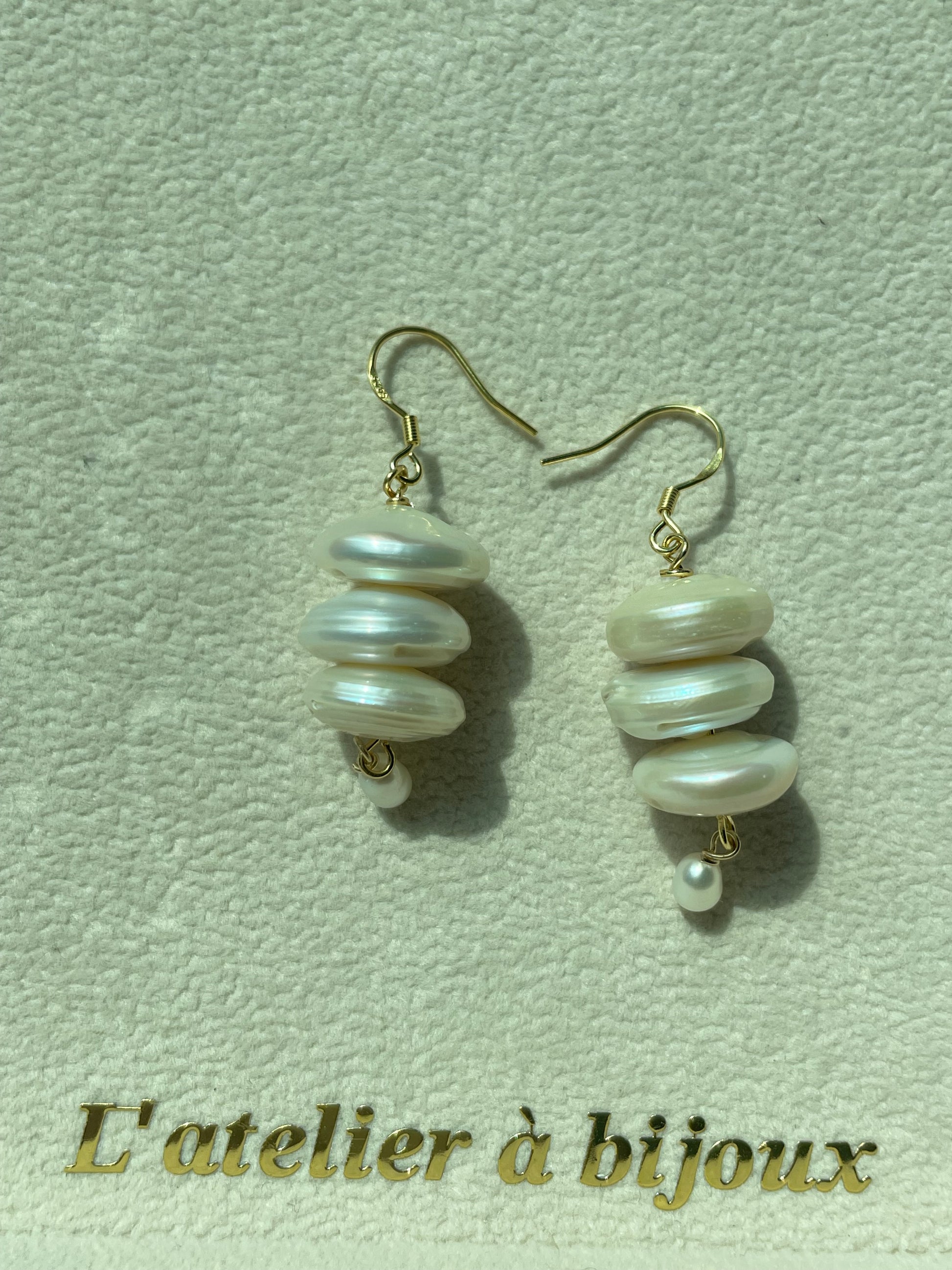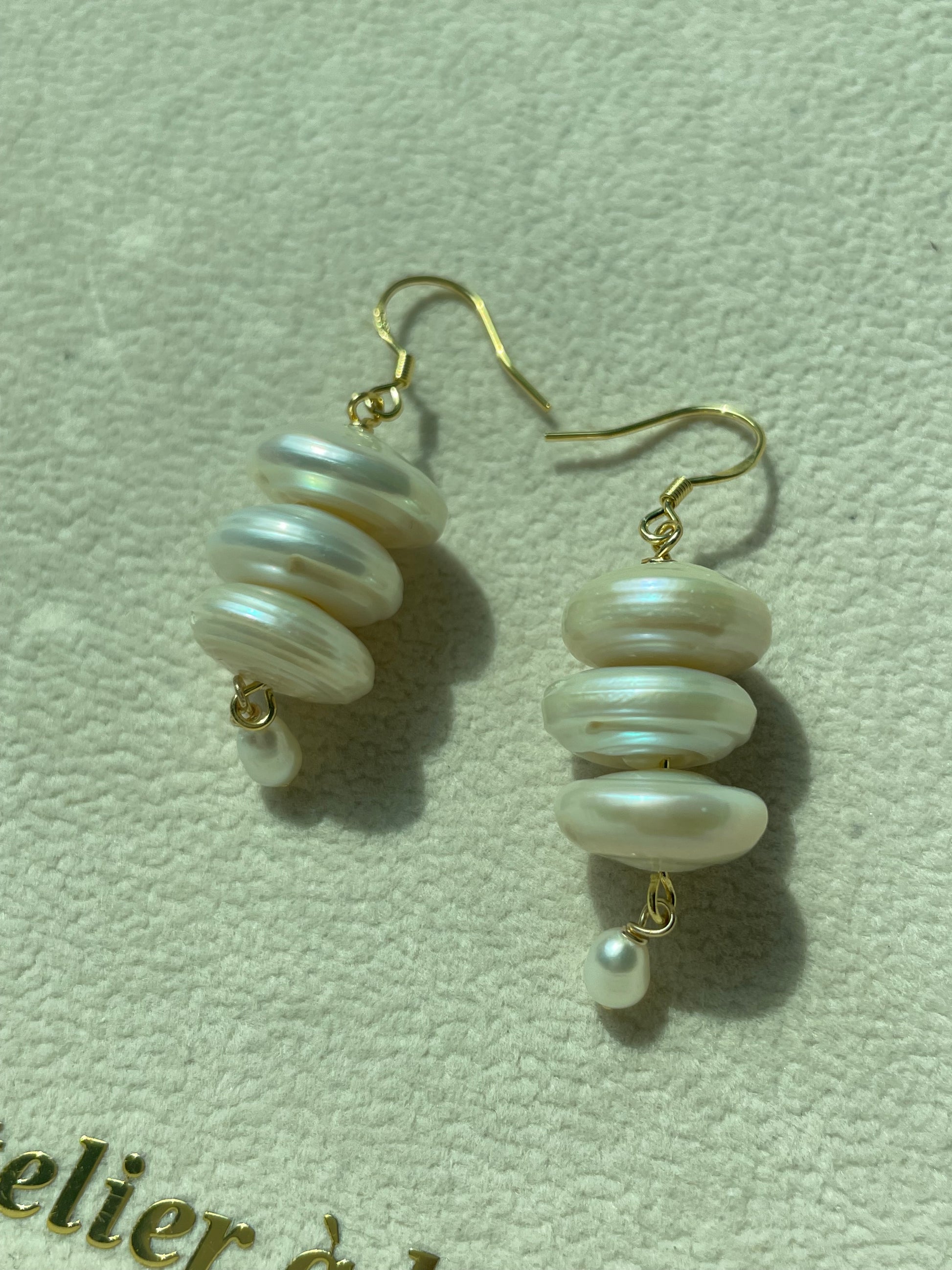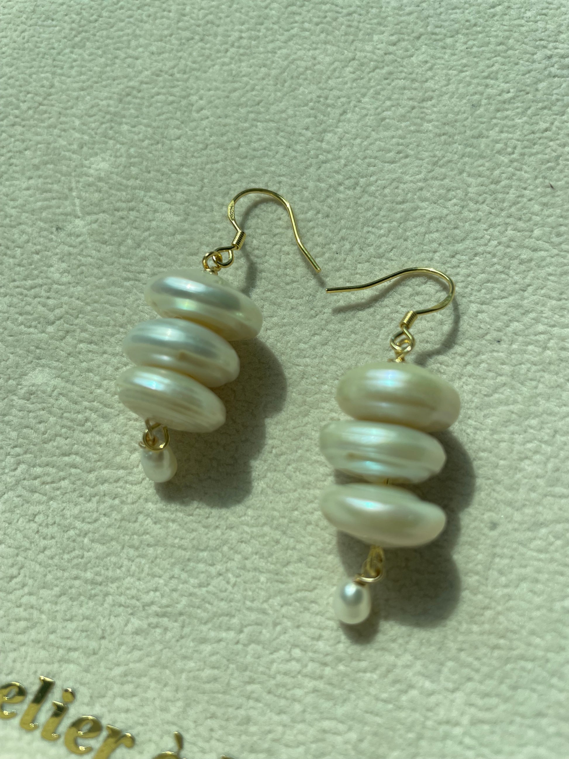Đôi hoa tai ngọc trai Pi mang thiết kế độc đáo và thanh lịch, nổi bật với những viên ngọc trai nước ngọt dẹt xếp chồng tinh xảo, tạo nên hiệu ứng thị giác lạ mắt và đầy cuốn hút. Phần móc hoa tai mạ vàng 18k cao cấp kết hợp hoàn hảo cùng sắc trắng ánh ngọc của ngọc trai, mang lại vẻ đẹp sang trọng và tinh tế cho người đeo. Đây là lựa chọn lý tưởng cho những ai yêu thích phong cách hiện đại nhưng vẫn muốn giữ sự nữ tính và quý phái.