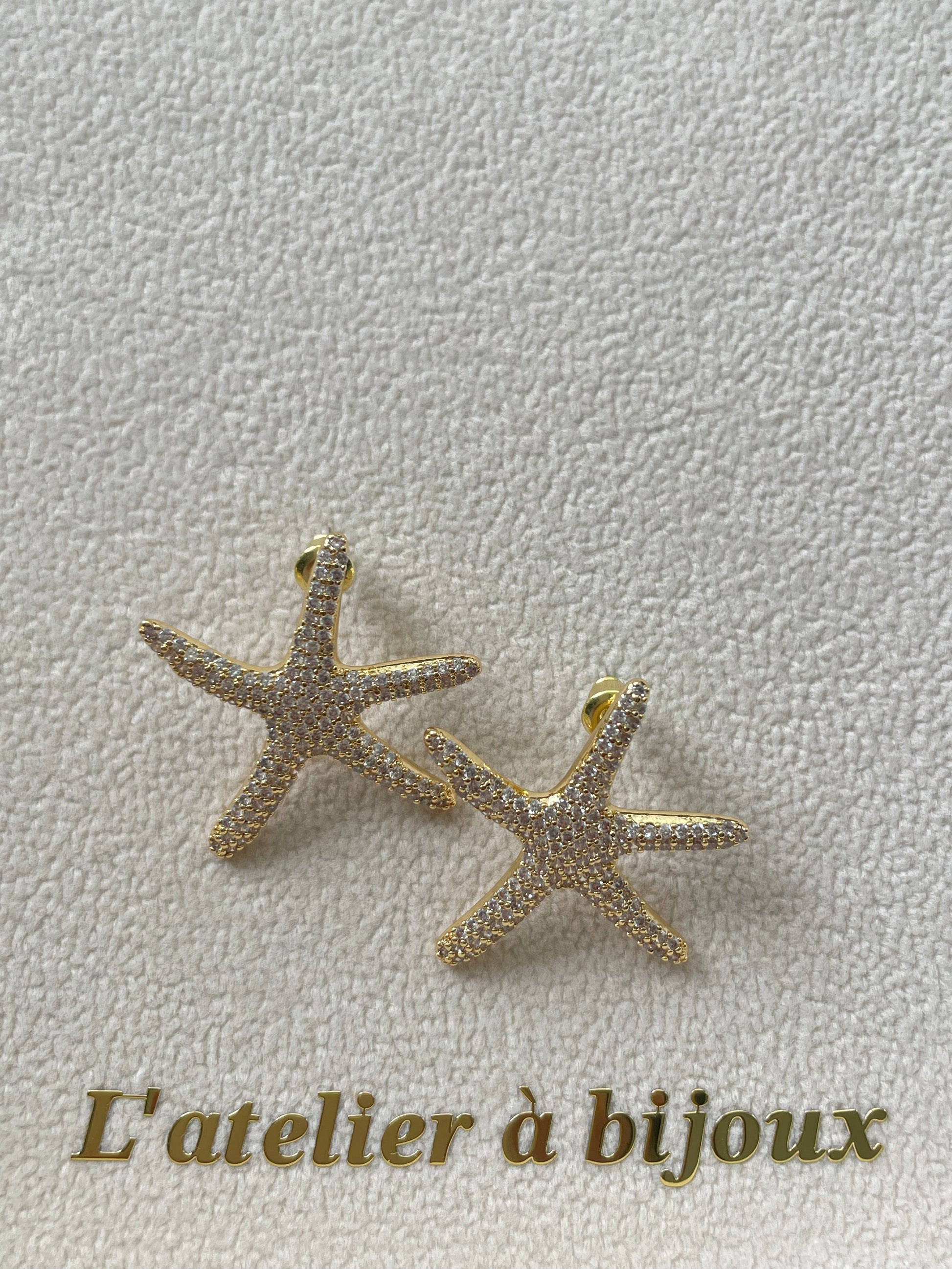 Đôi hoa tai sao biển này mang đậm cảm hứng đại dương với thiết kế hình sao biển duyên dáng, phủ đầy những viên đá cz lấp lánh trên nền mạ vàng cao cấp. Hiệu ứng ánh sáng từ bề mặt tinh xảo giúp đôi hoa tai trở thành điểm nhấn hoàn hảo, mang đến vẻ đẹp nổi bật và thời thượng cho người đeo.