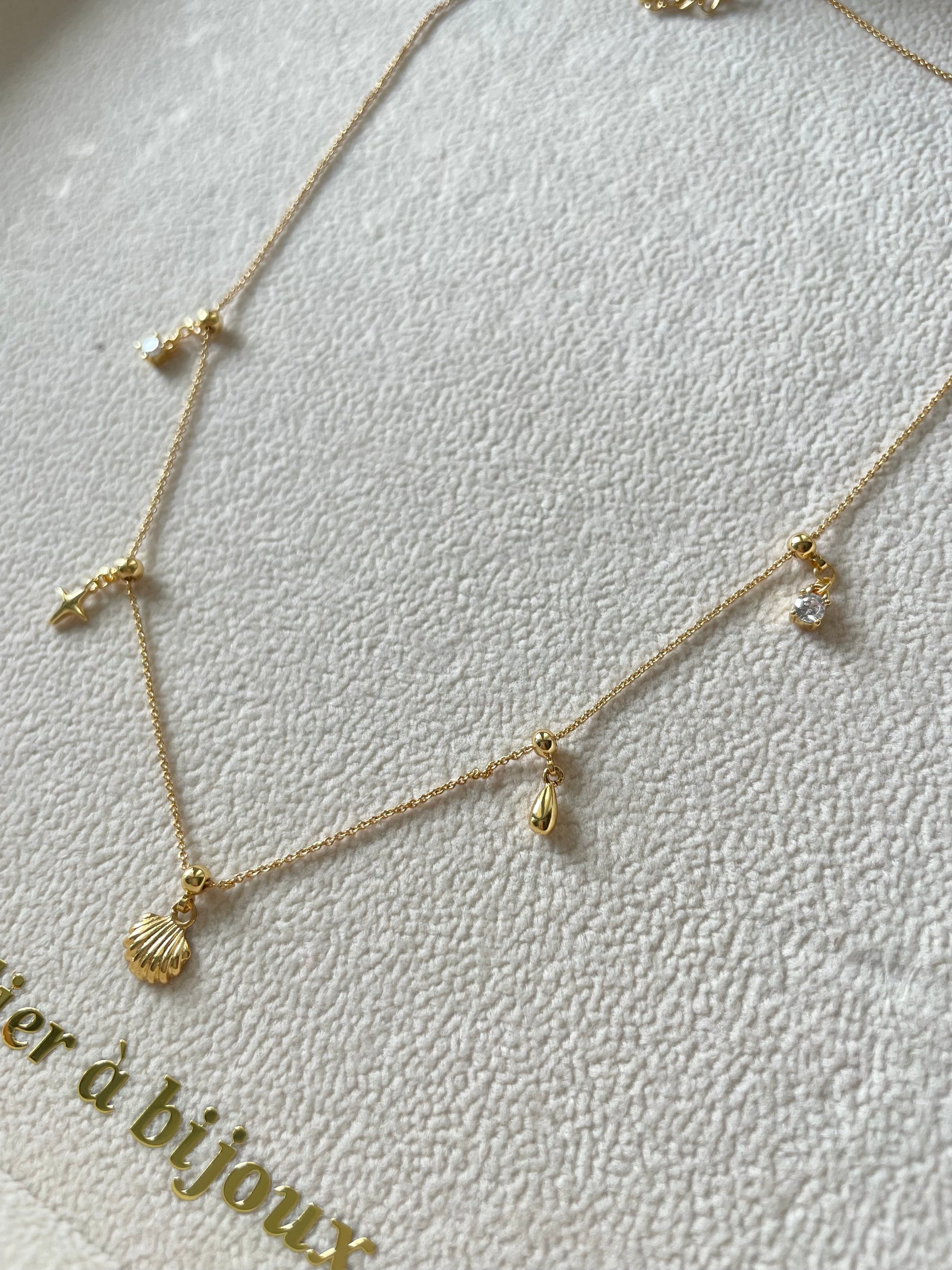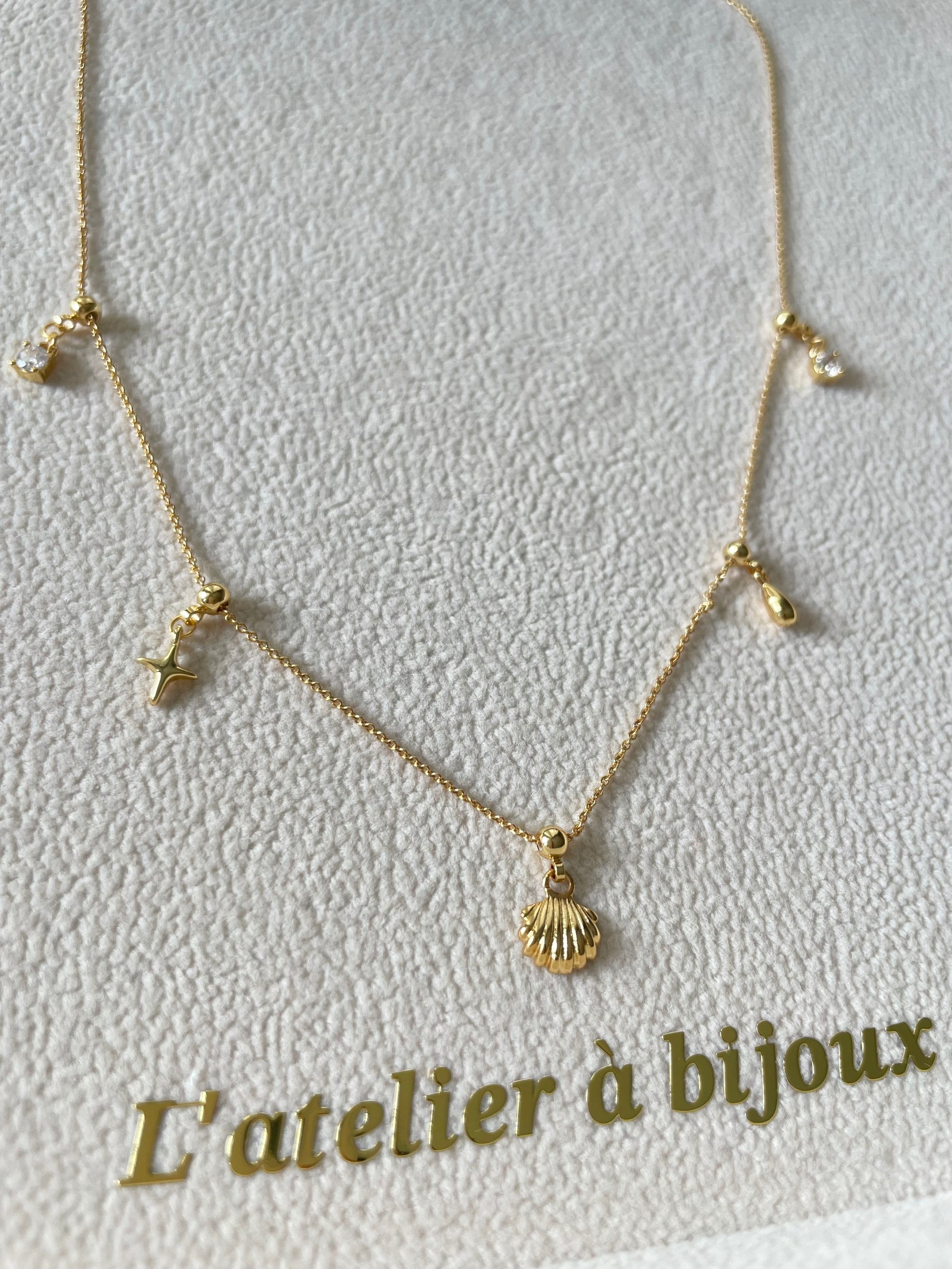 Chiếc vòng cổ charm vỏ sò vàng mang thiết kế tinh giản nhưng đầy duyên dáng, lấy cảm hứng từ vẻ đẹp của biển cả. Điểm nhấn nằm ở mặt charm hình vỏ sò nhỏ tinh xảo, kết hợp cùng các charm đá pha lê trắng đính kèm nhẹ nhàng, tạo hiệu ứng lấp lánh theo từng chuyển động.