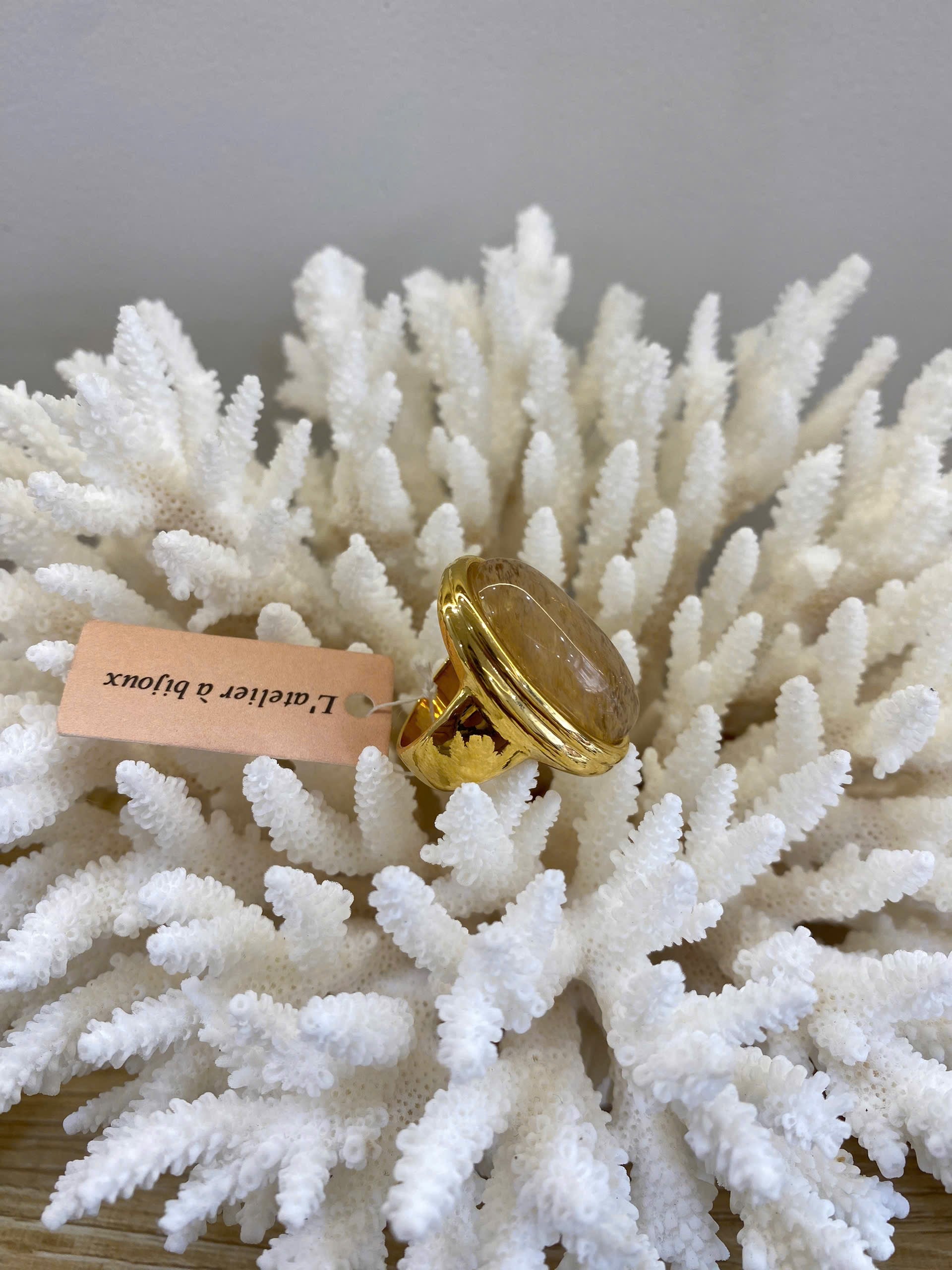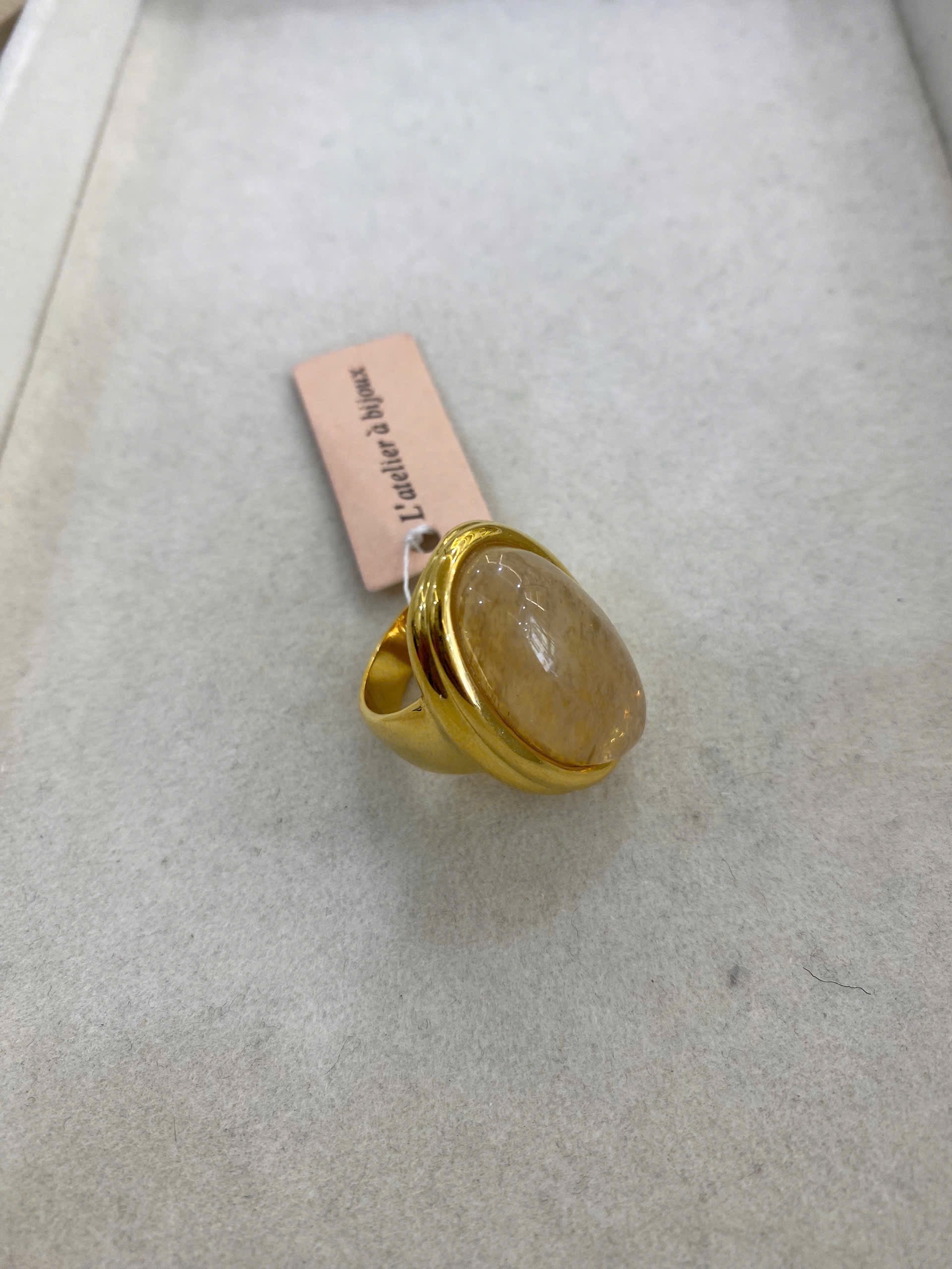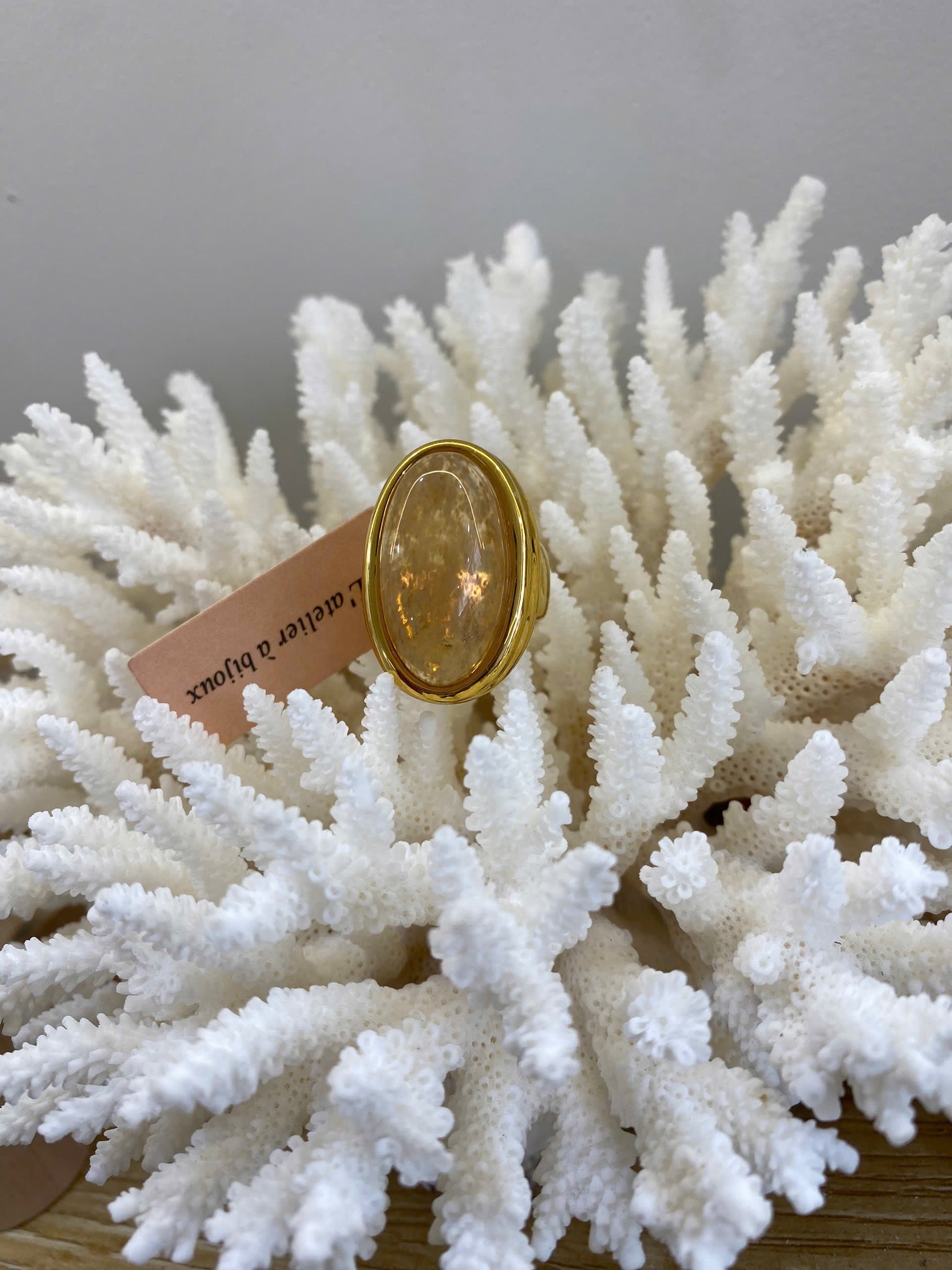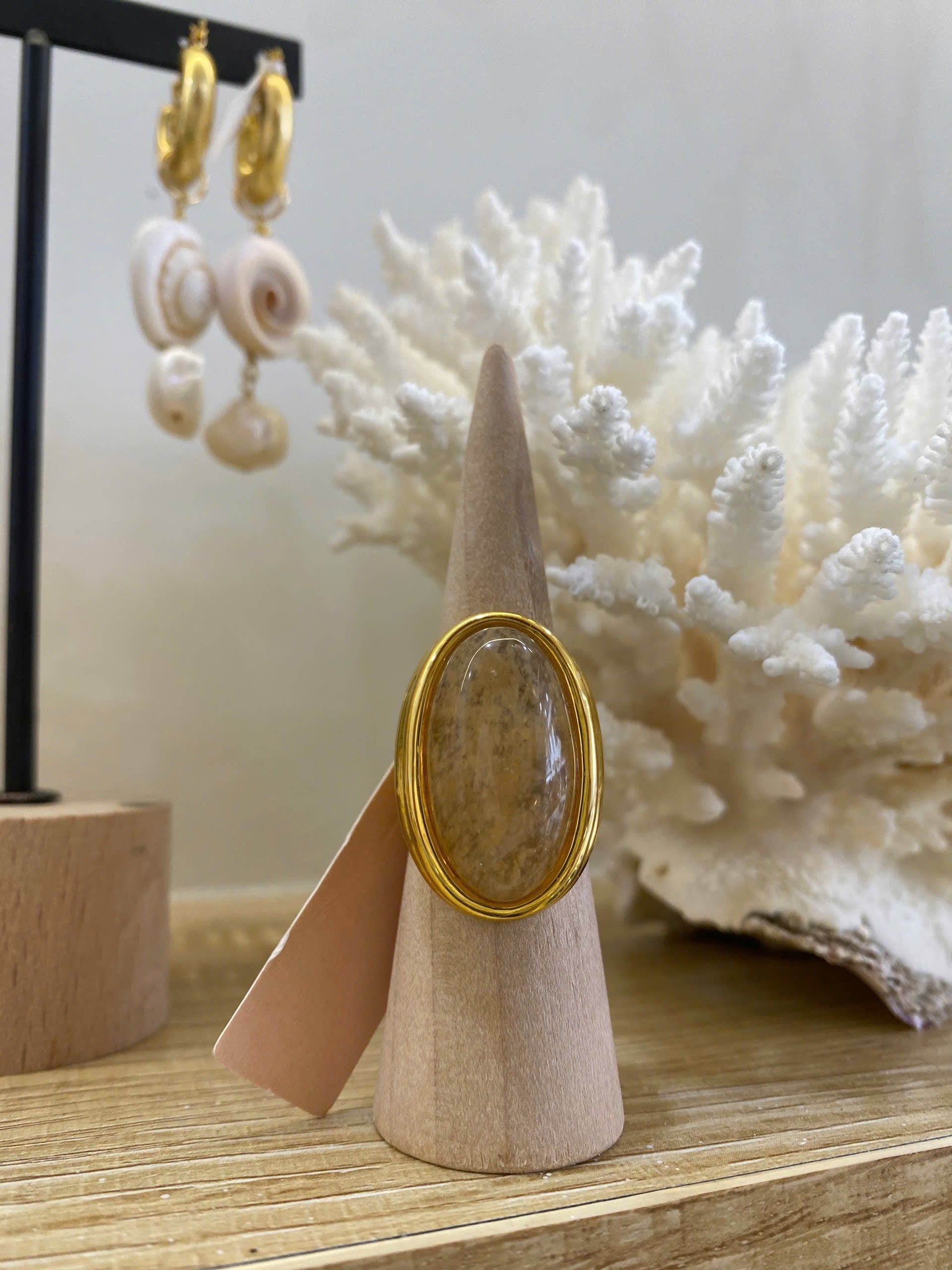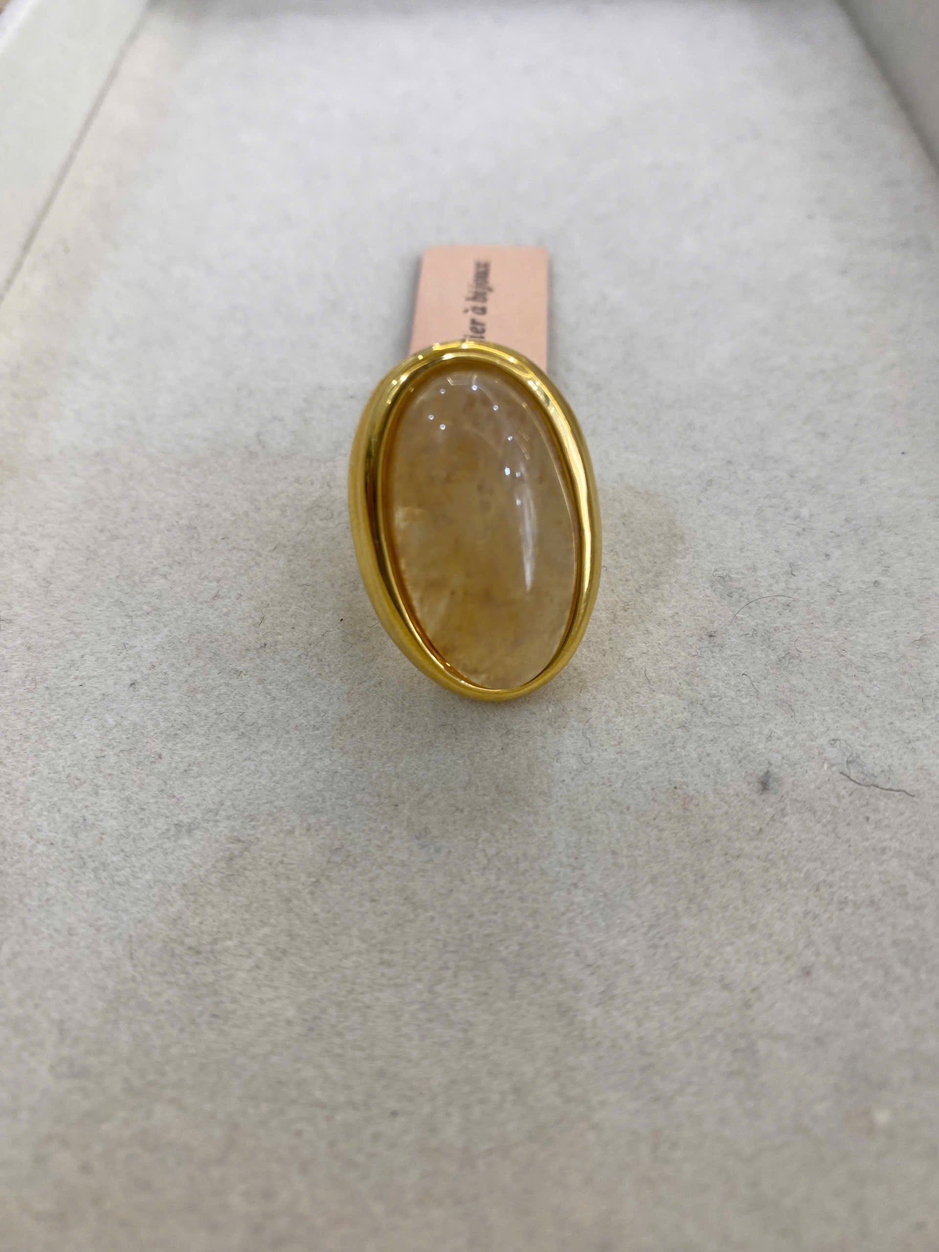 Nhẫn thiết kế đá dáng tròn bầu dục kích thước lớn, được bao bọc bởi khung mạ vàng 18k bản dày, tạo cảm giác chắc chắn và sang trọng. Viên đá trong suốt được cắt facet tinh xảo, phản chiếu ánh sáng đầy cuốn hút, vừa mạnh mẽ vừa thanh lịch.